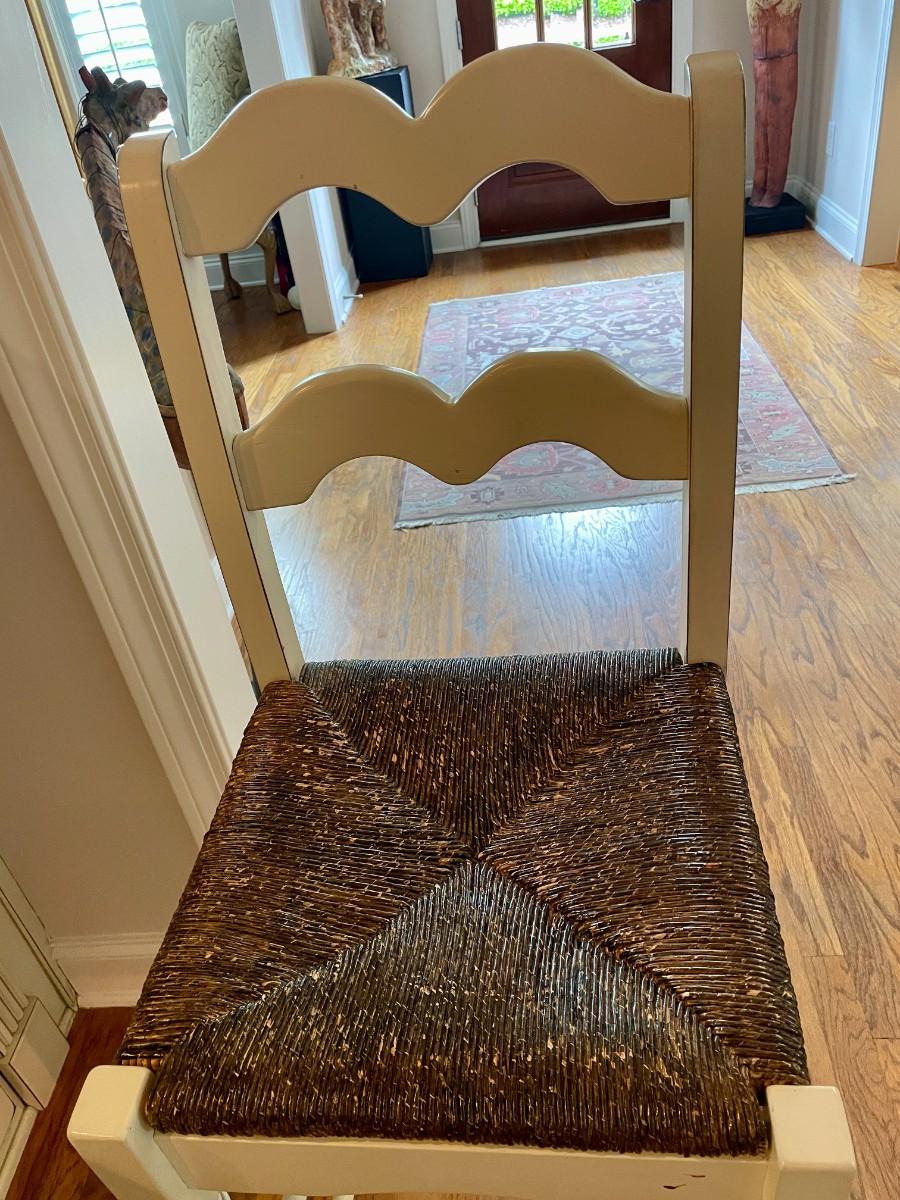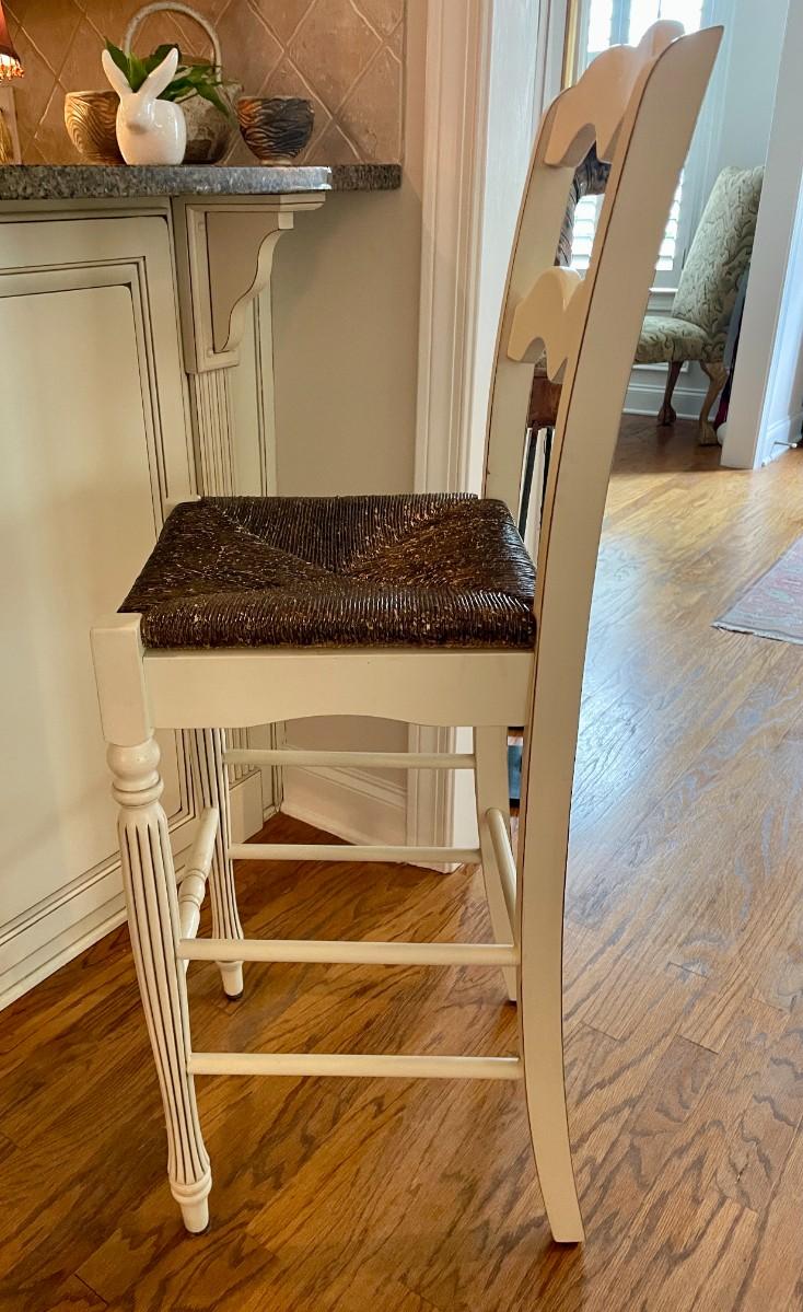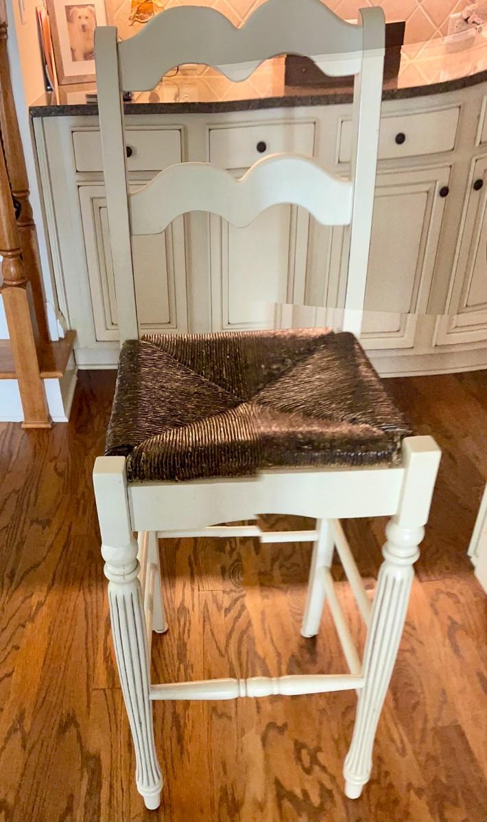 Off White wood with wicker seat. Seat Height is 30". Overall size is 15x16x46