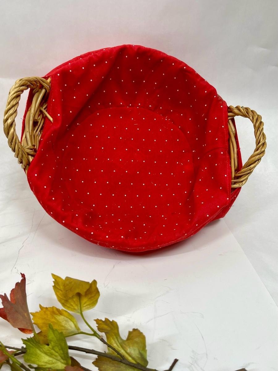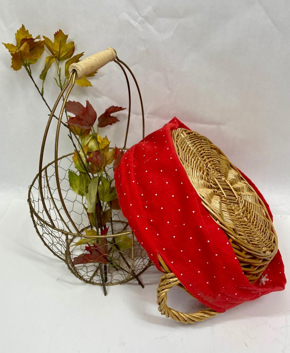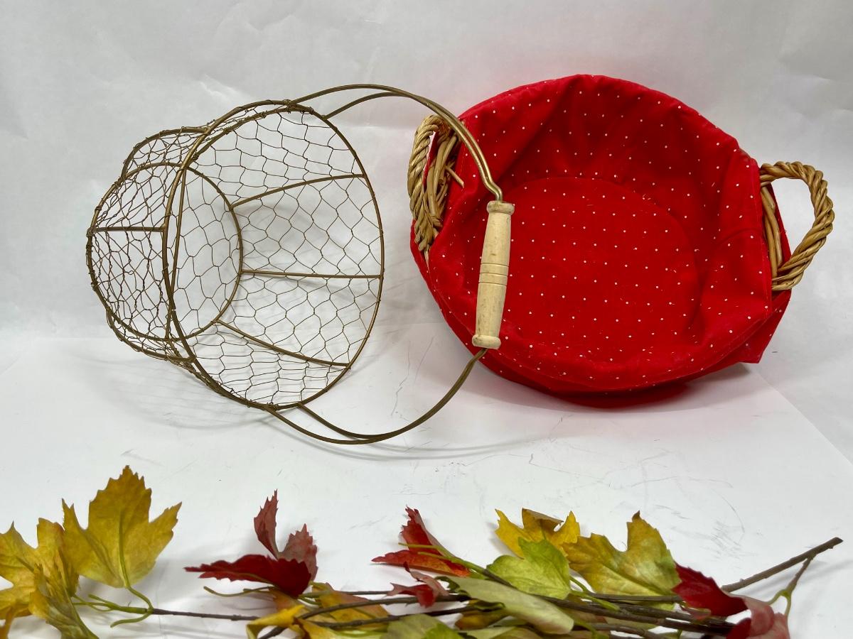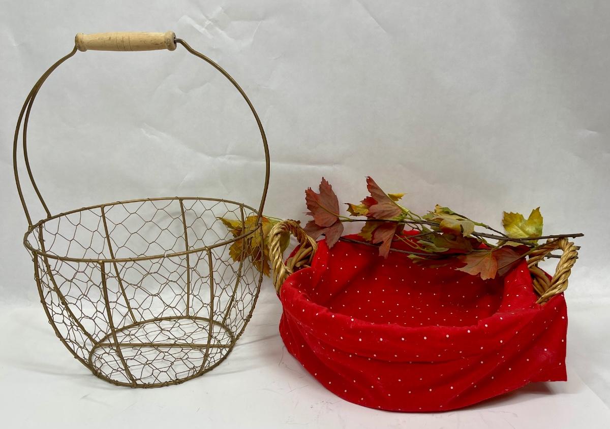 Two baskets - Wire Egg Basket and Round Rattan with handle and red fabric liner