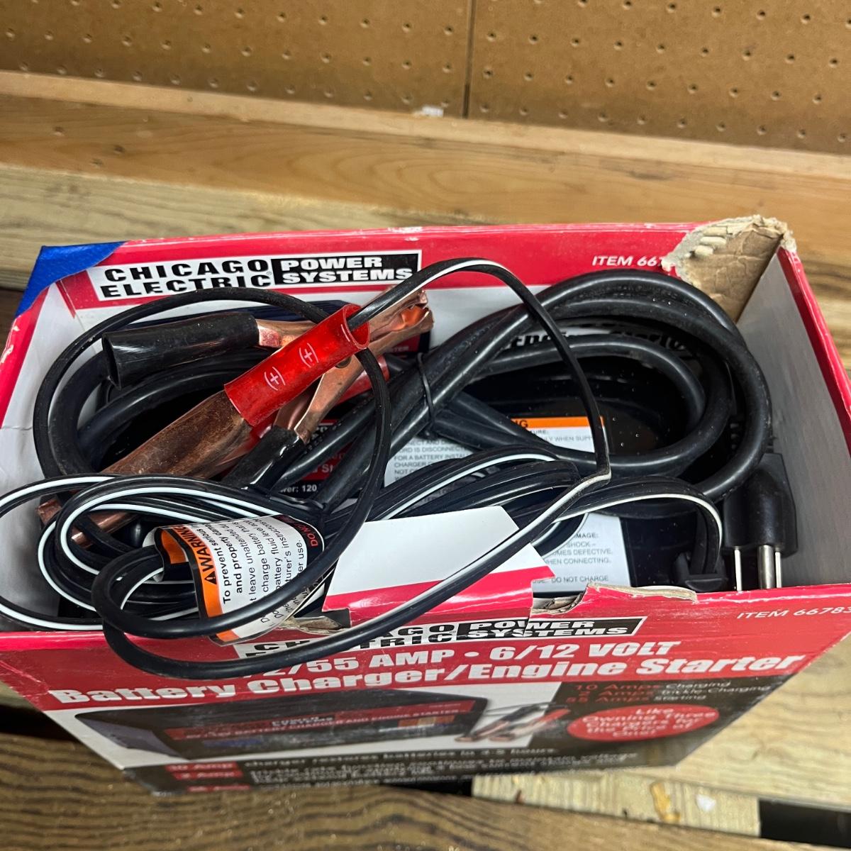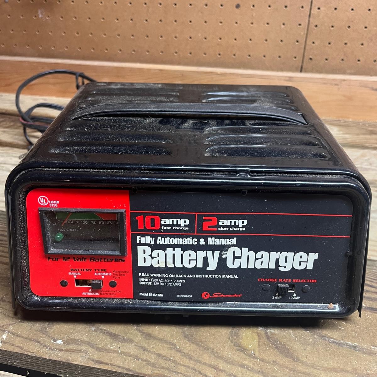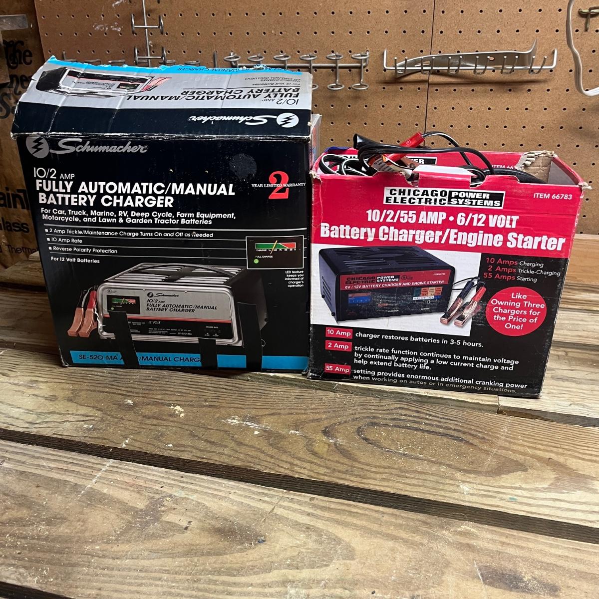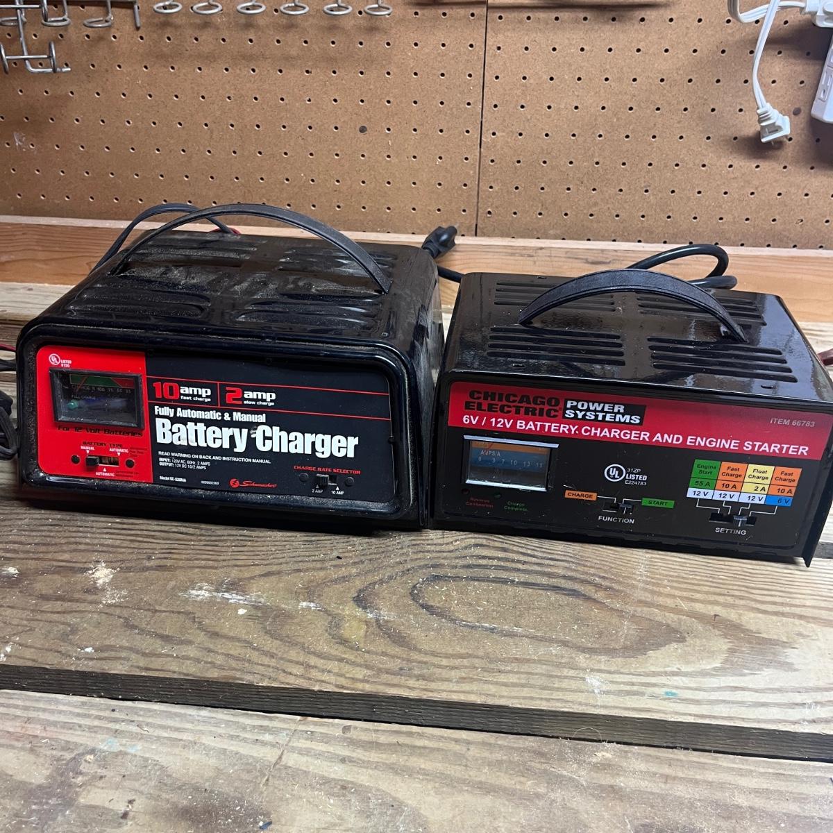 Lot includes a Schumacher and Chicago Electric battery chargers. Both chargers powered on when plugged in. Largest charger measures 10” x 8” x 5.5”H.
