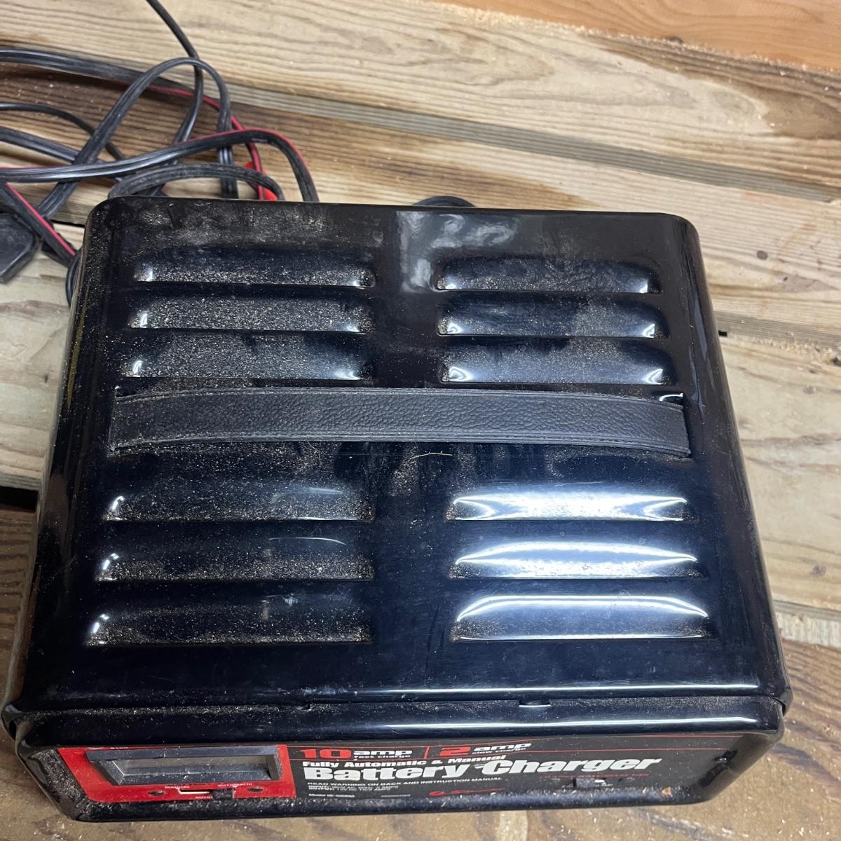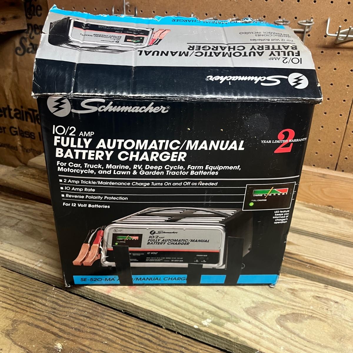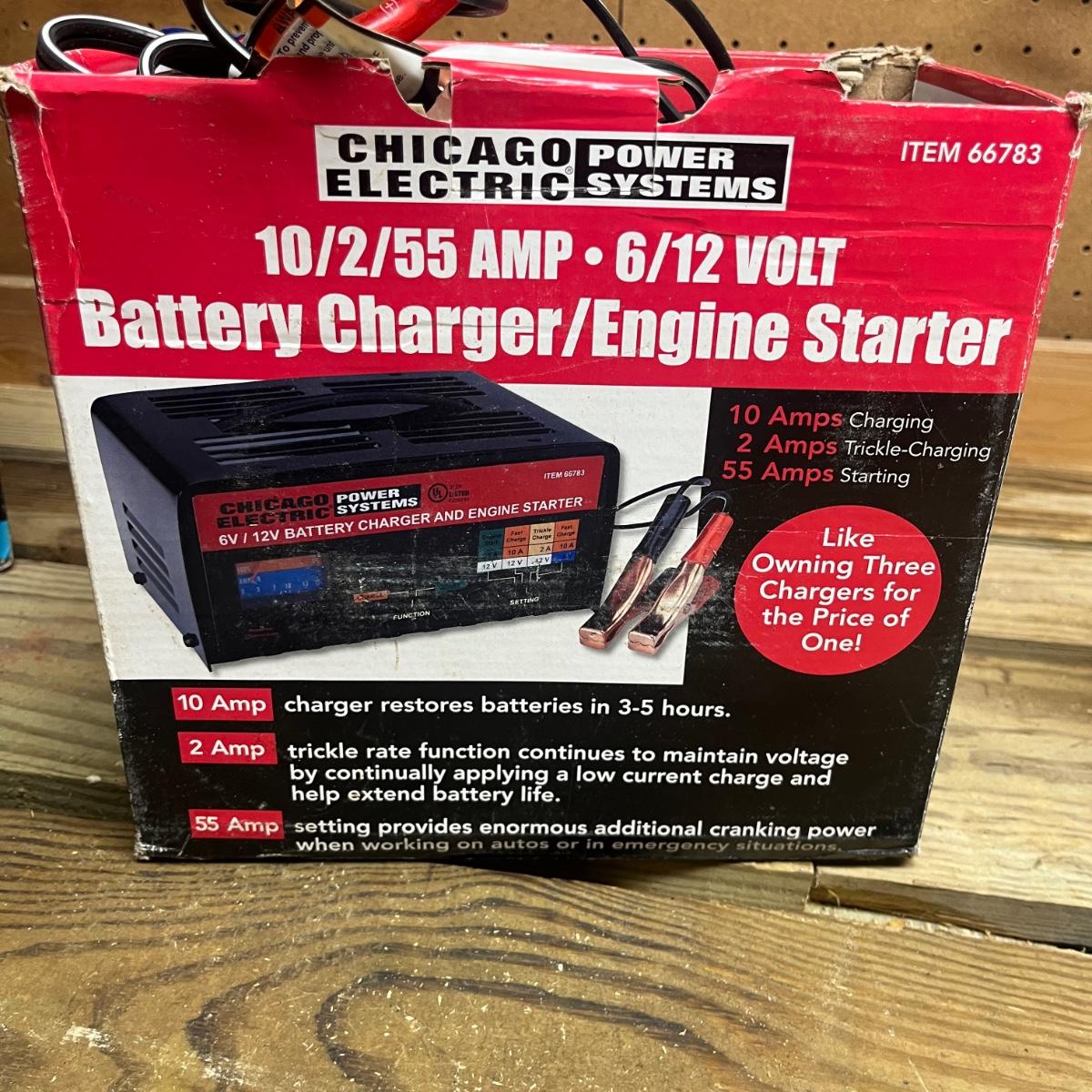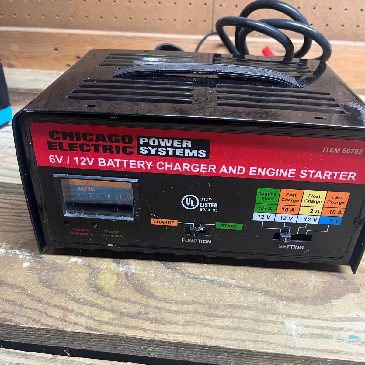 Lot includes a Schumacher and Chicago Electric battery chargers. Both chargers powered on when plugged in. Largest charger measures 10” x 8” x 5.5”H.