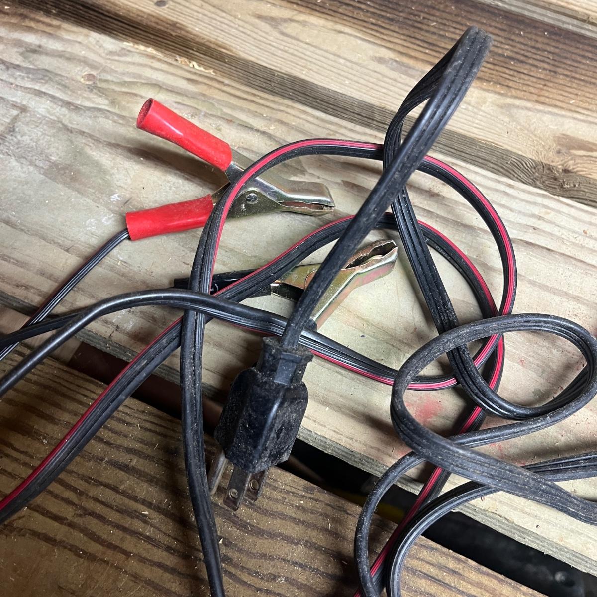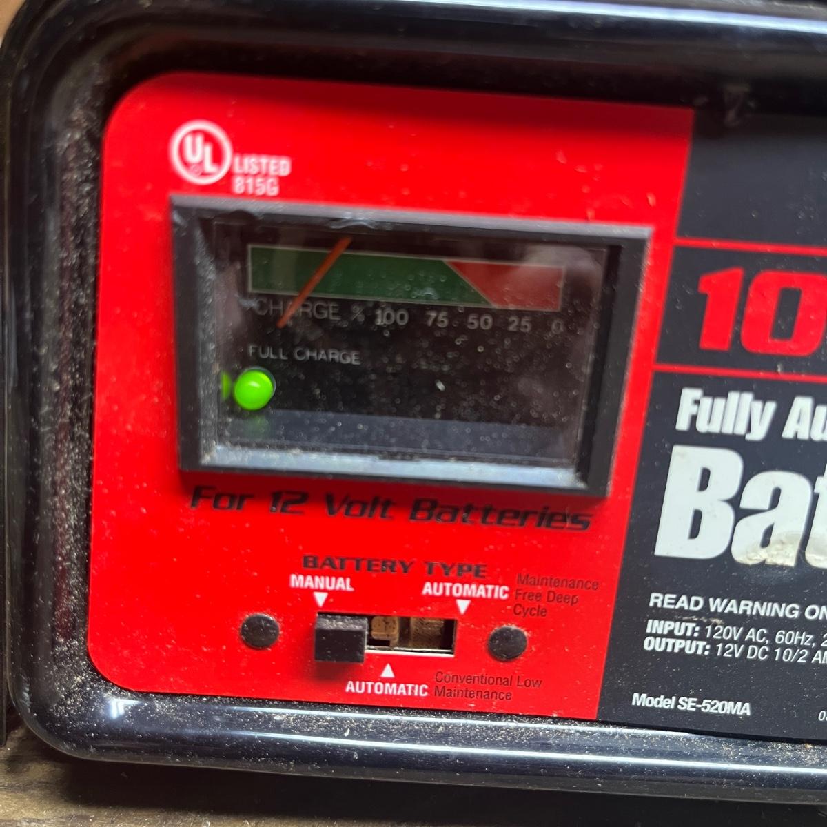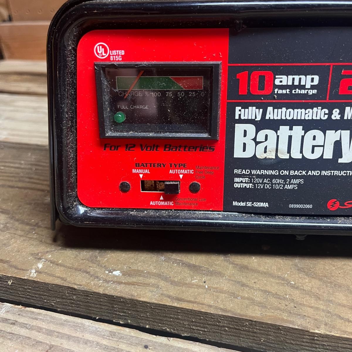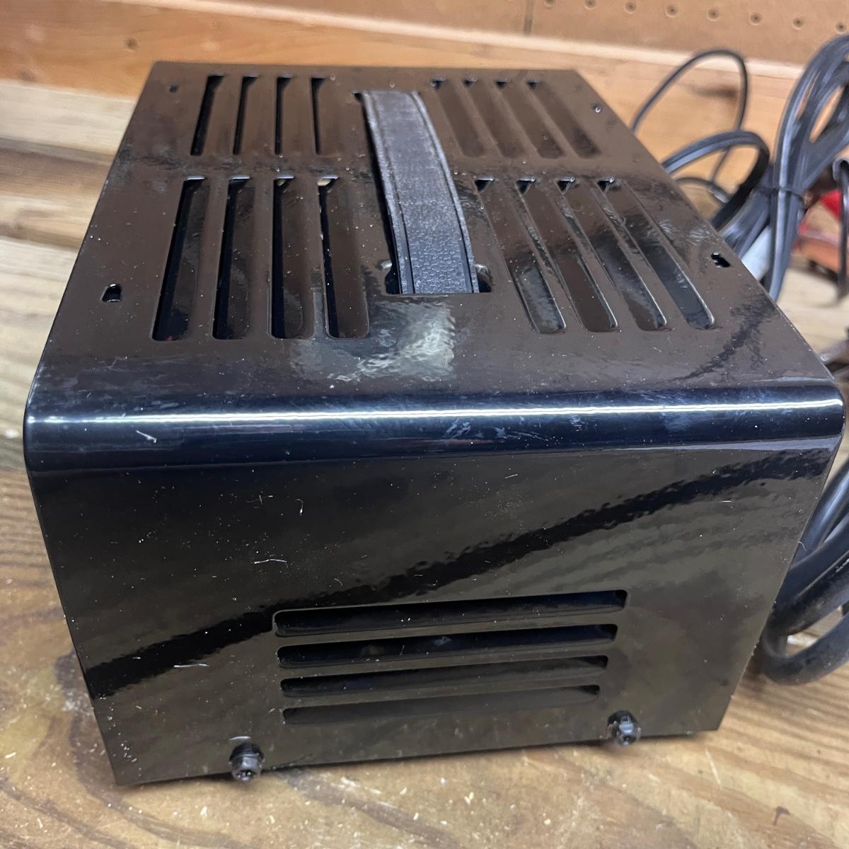 Lot includes a Schumacher and Chicago Electric battery chargers. Both chargers powered on when plugged in. Largest charger measures 10” x 8” x 5.5”H.