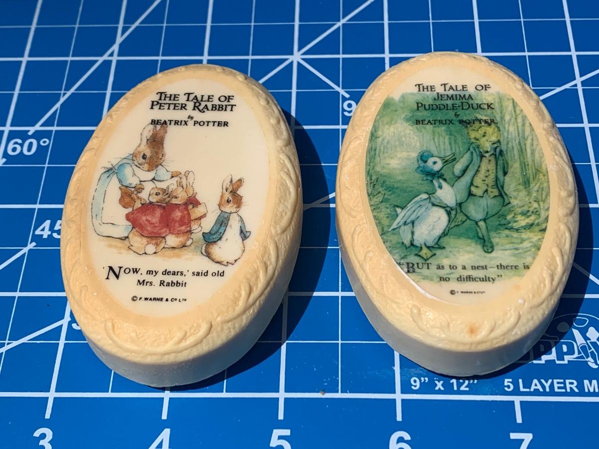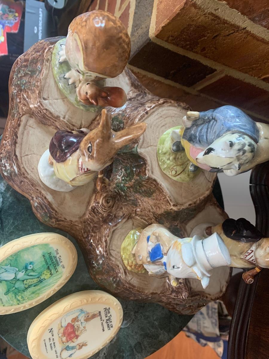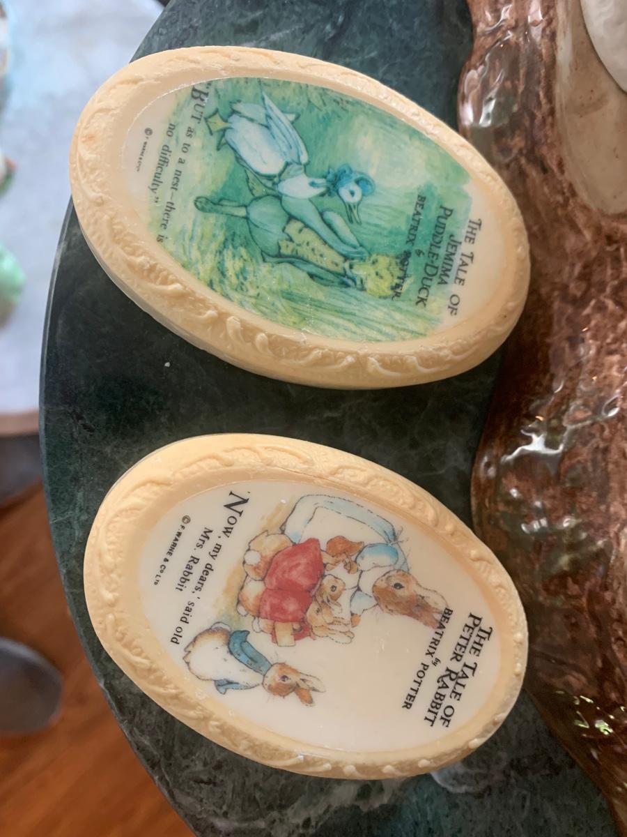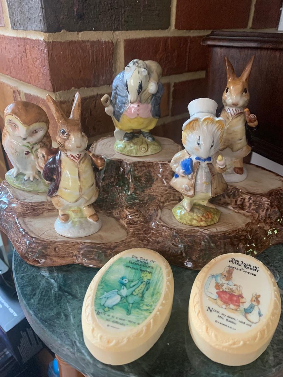 5 Beatrix Potter Figurines w Display Stand - No Copyright Date + 2 Soap