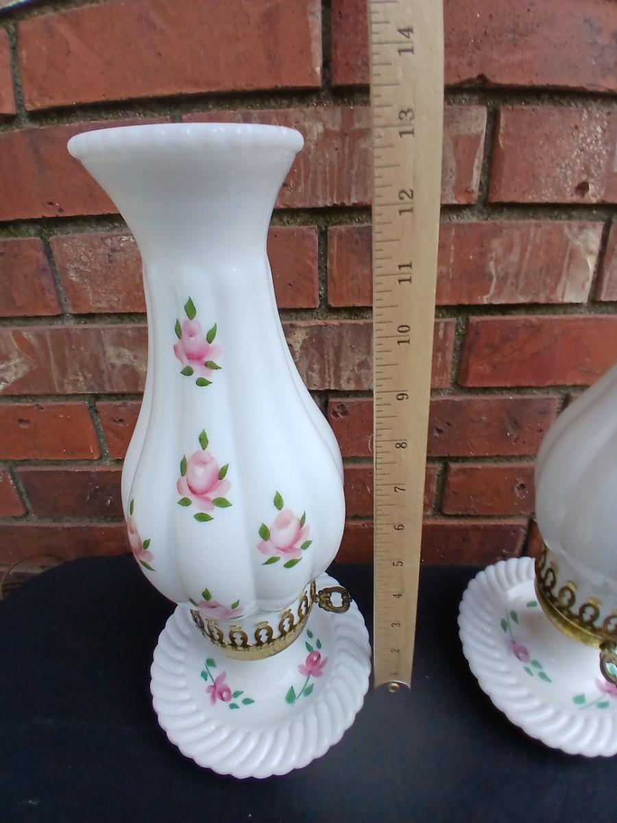 Two beautiful Milk Glass Hurricane Lamps with Pink Roses 13"