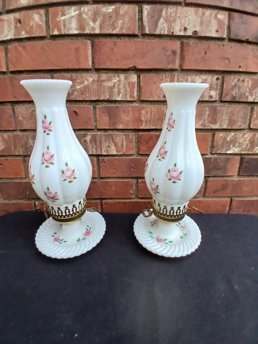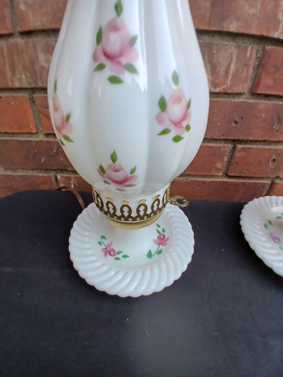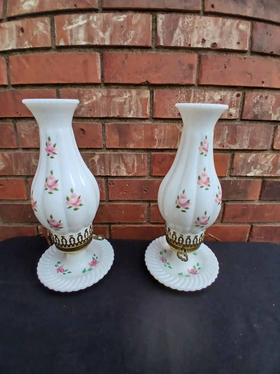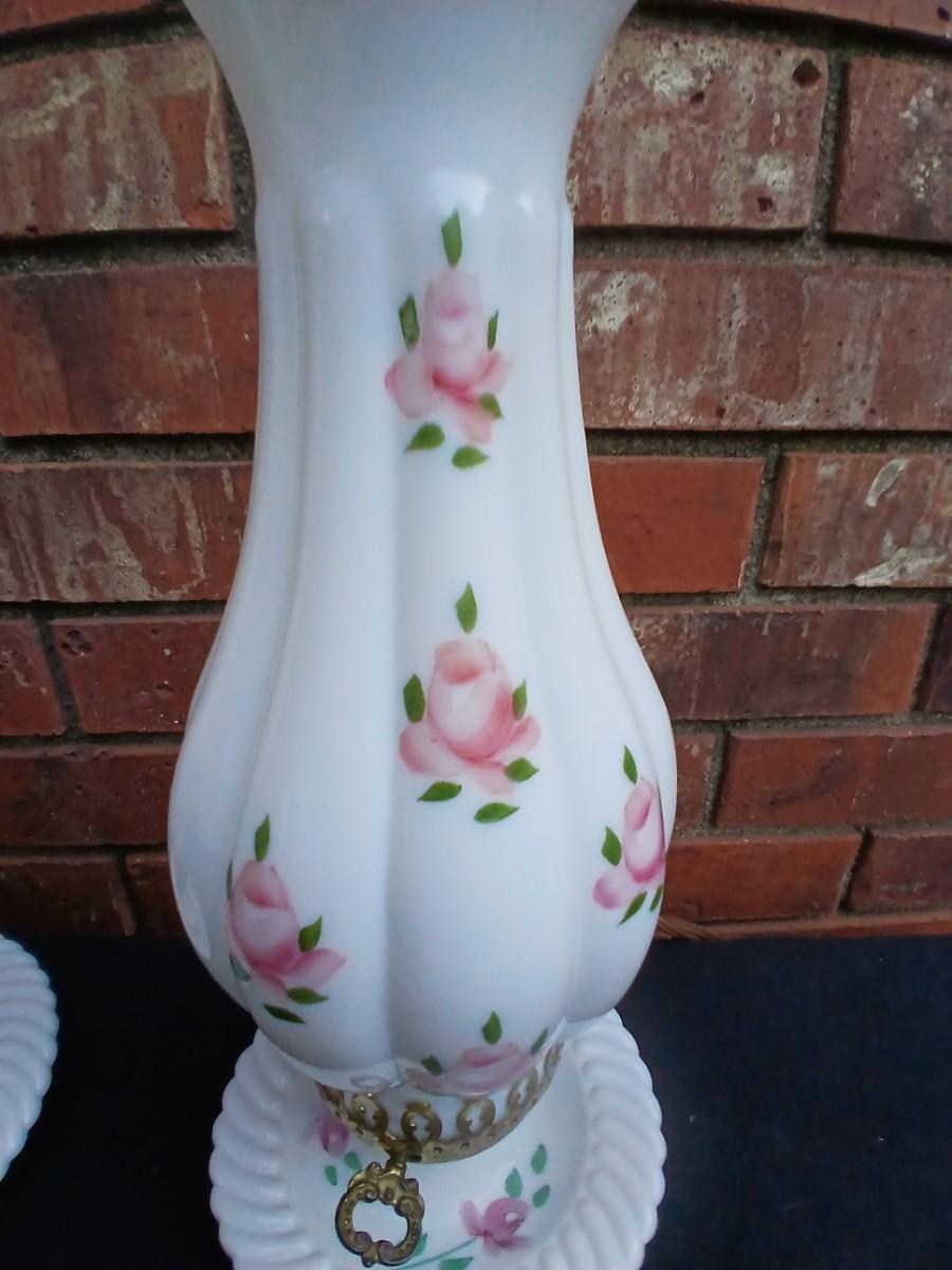 Two beautiful Milk Glass Hurricane Lamps with Pink Roses