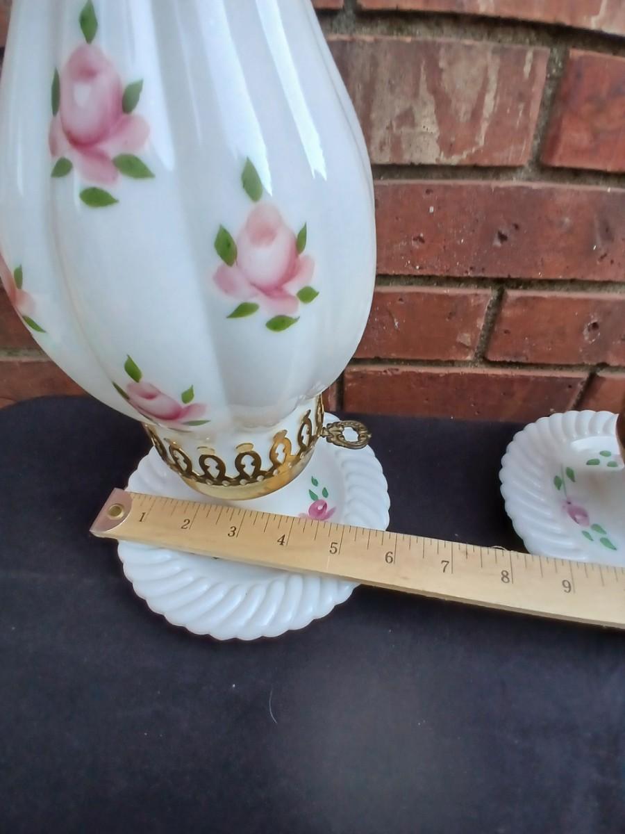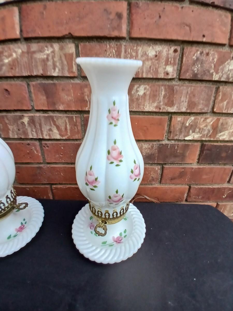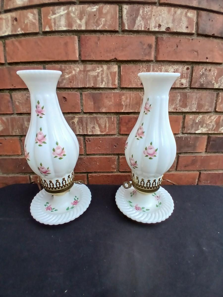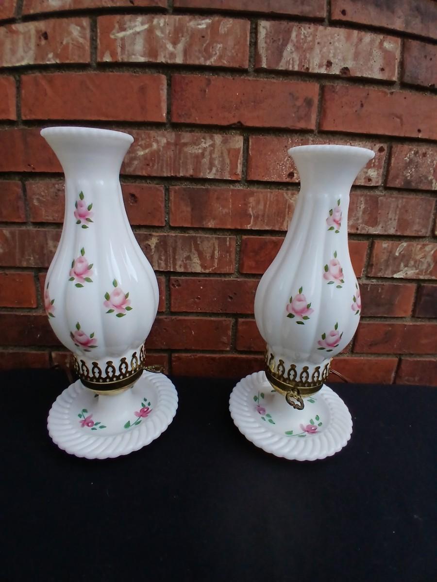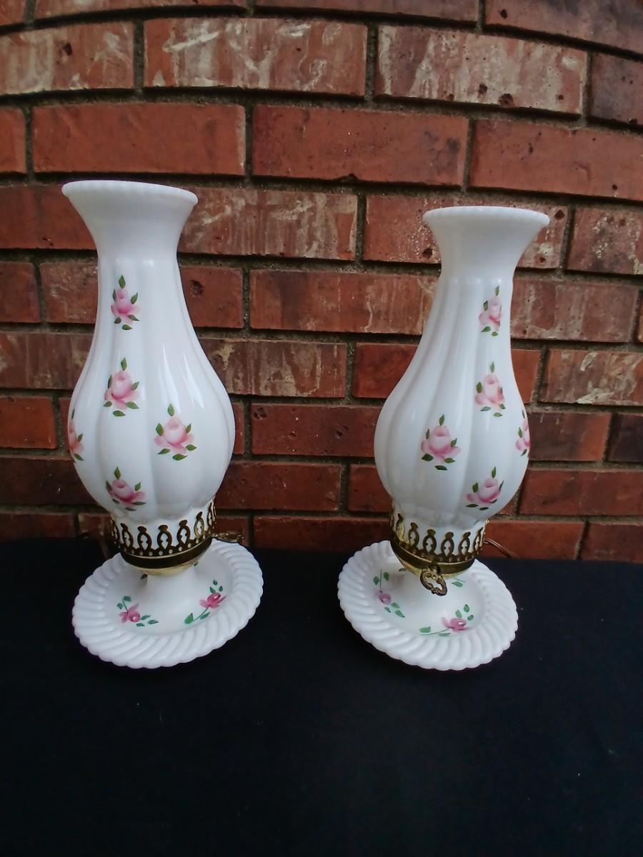 Two beautiful Milk Glass Hurricane Lamps with Pink Roses