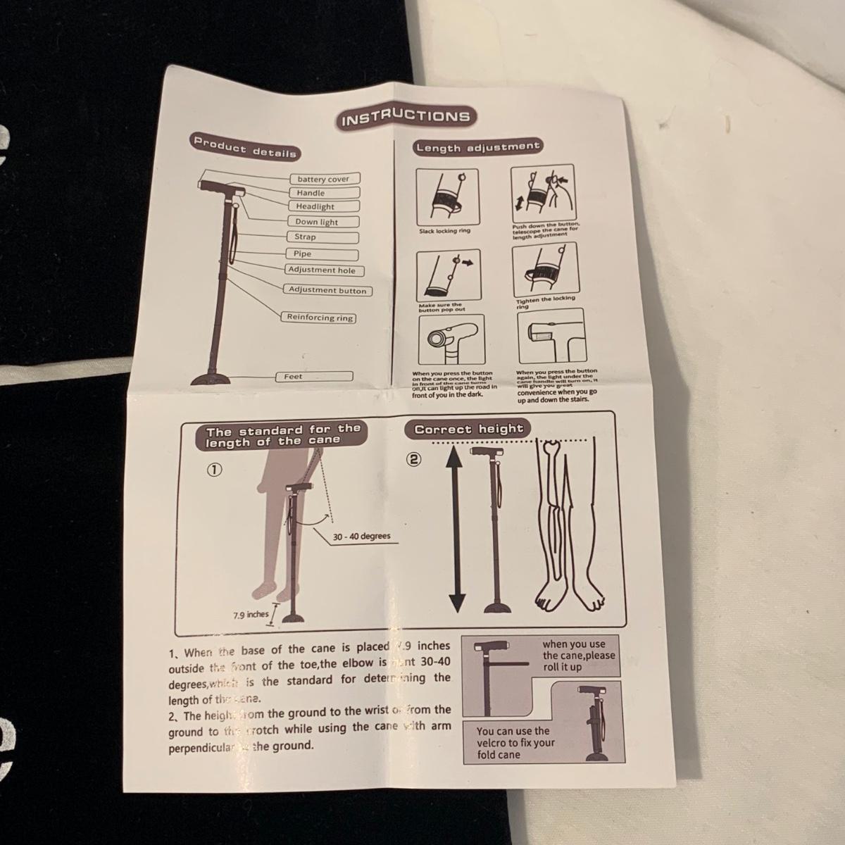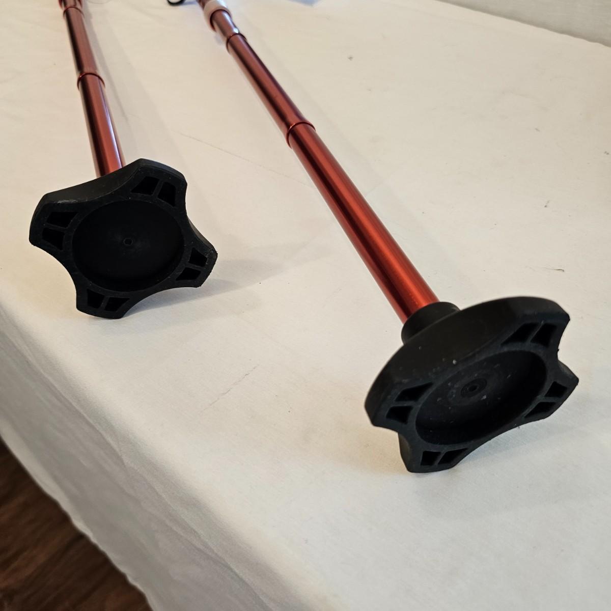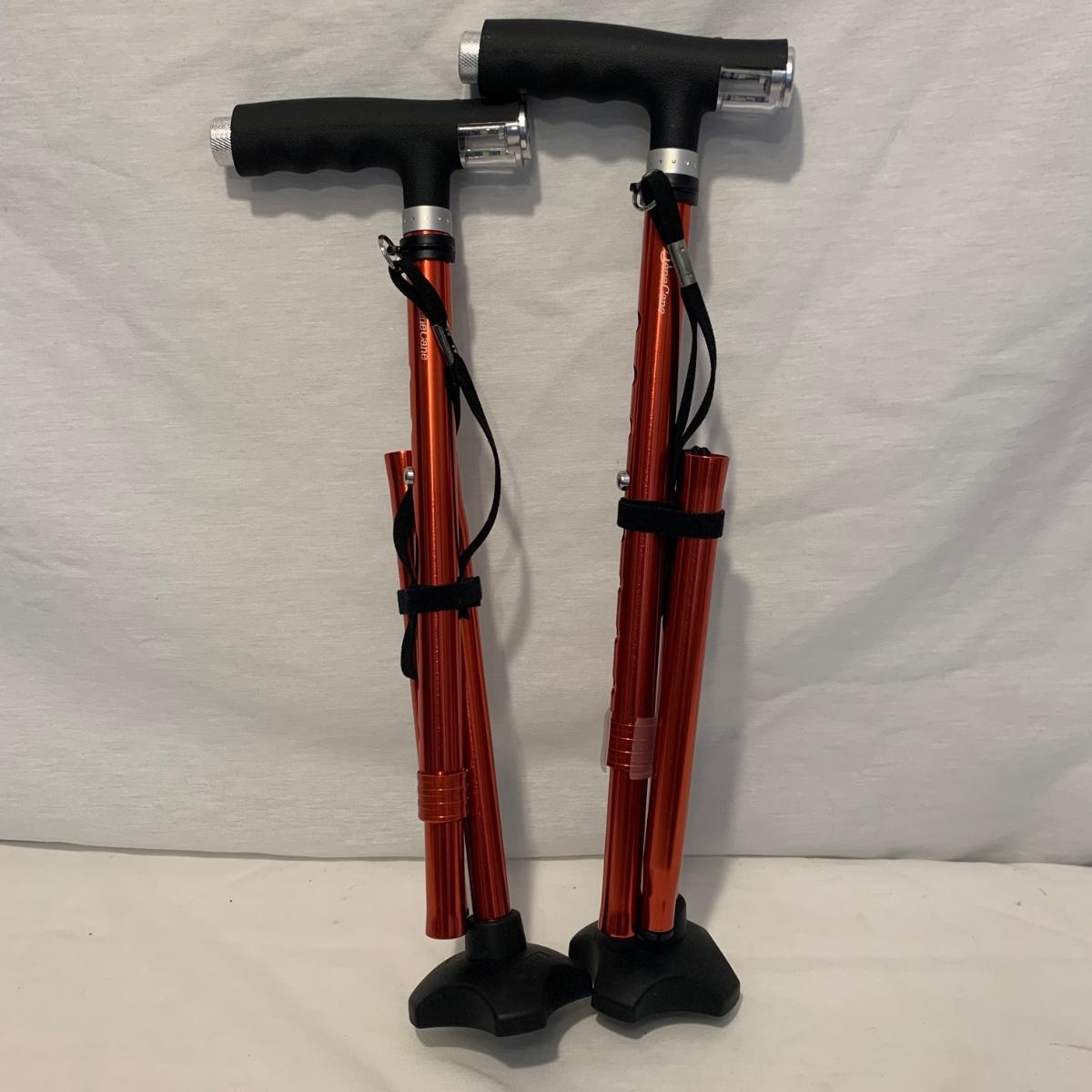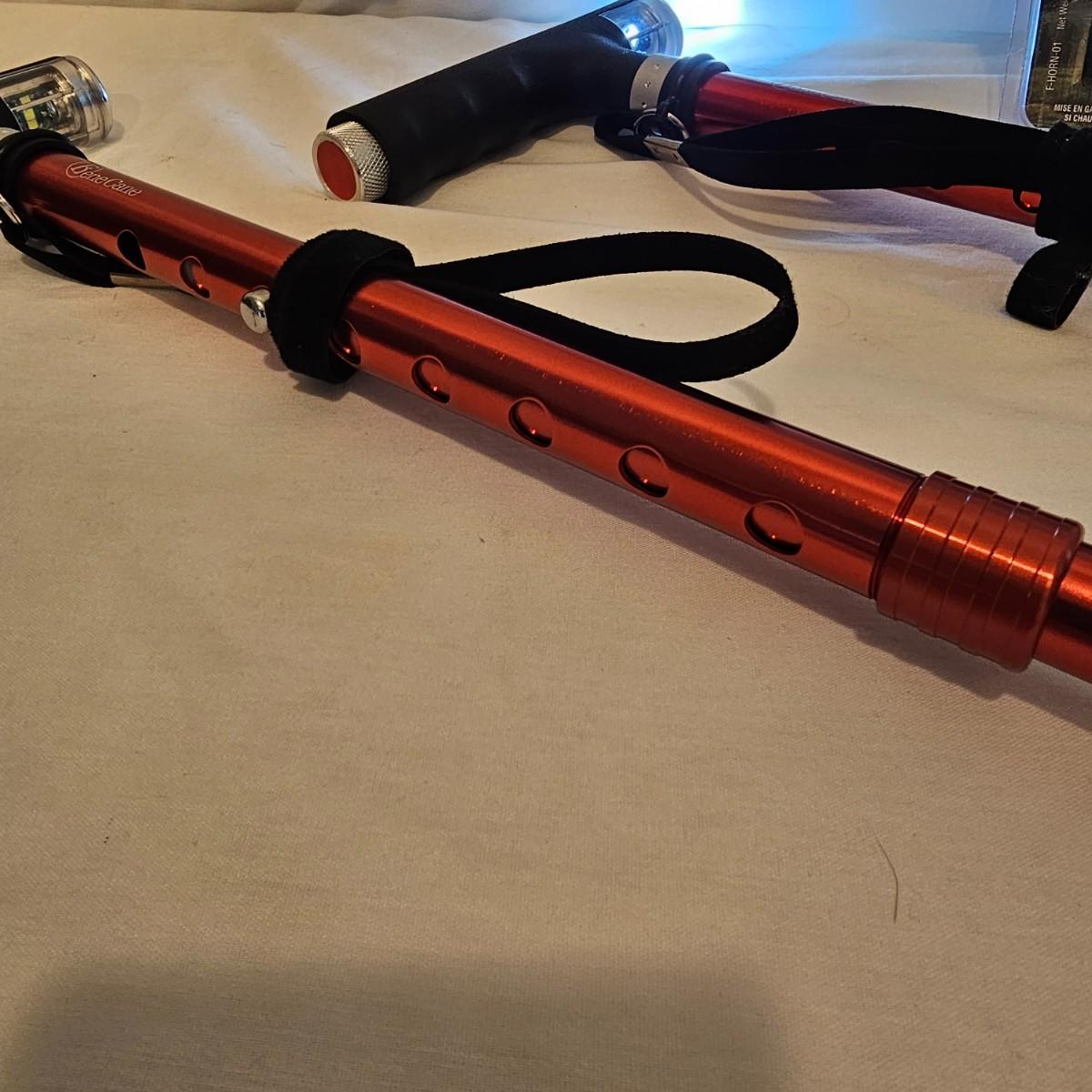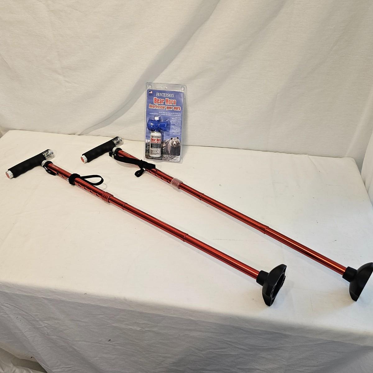 Aluminum shaft and adjustable height, 31" to 38", these walking staffs also have hard rubber handles and dual lights as well as a wrist strap. They come with storage bags and fold into three sections to fit compactly inside. Also includes an unopened aerosol bear horn for protection while out. See photos for details. Shipping available.