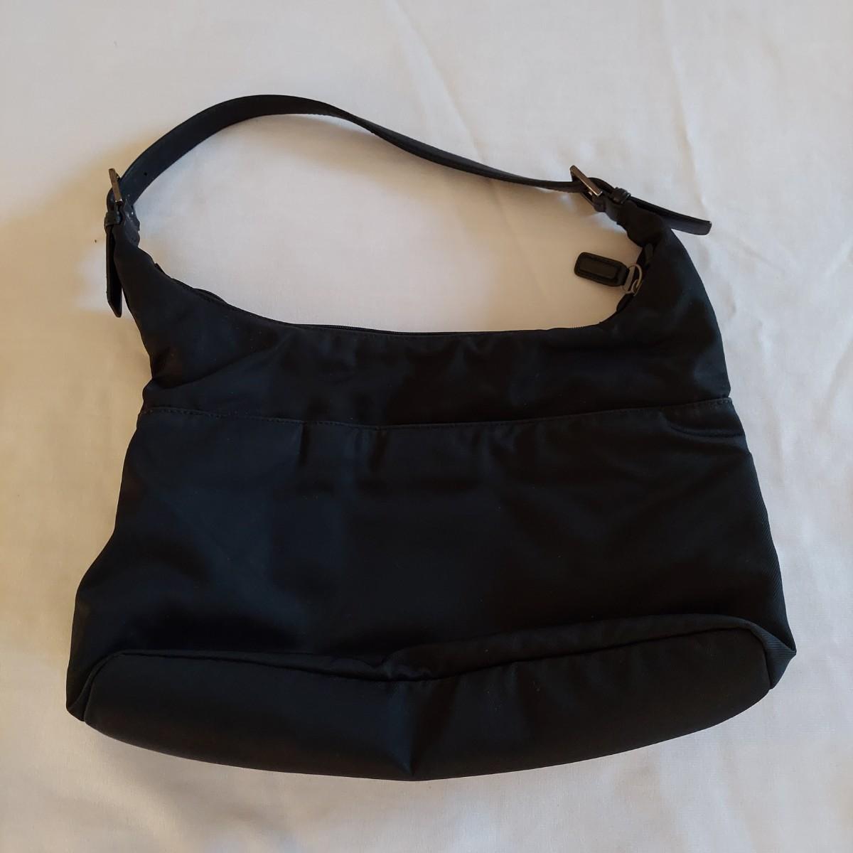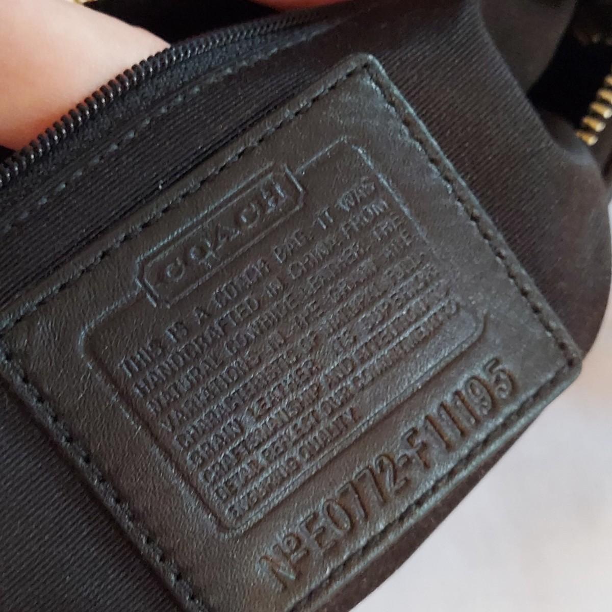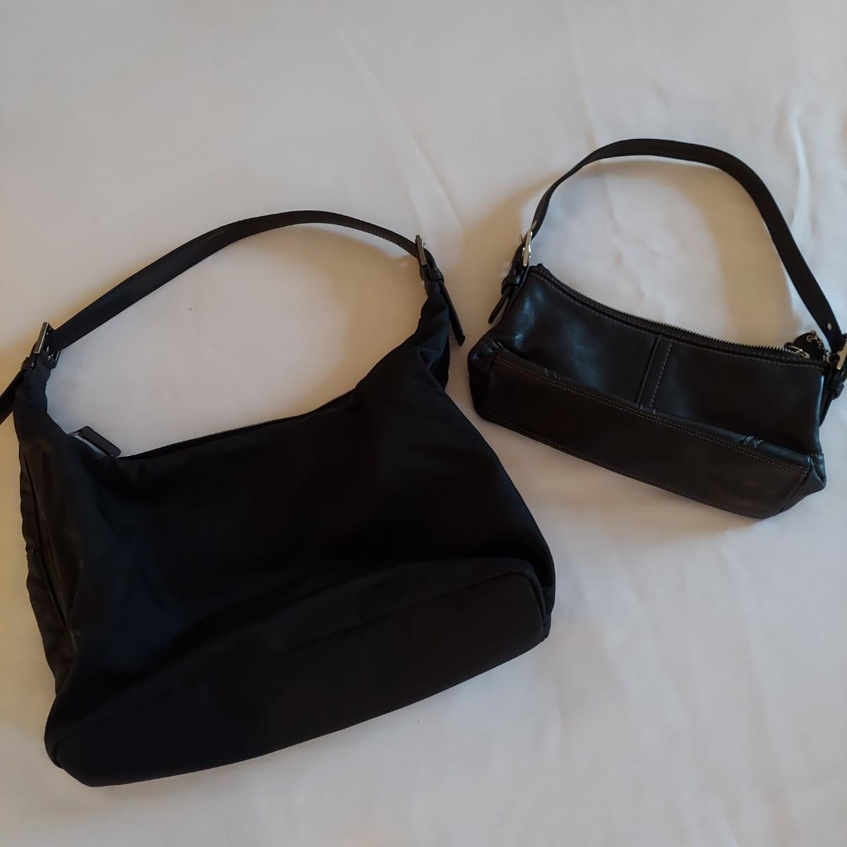 Lot includes two black Coach purses. The small leather bag is 10" x 2.5" x 6"H. The nylon shoulder bag is 13" x 5" x 12"H. Shipping available