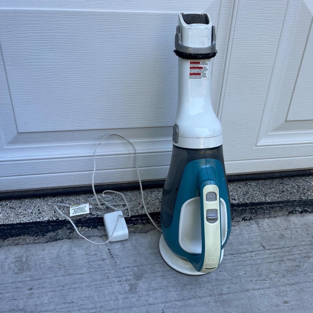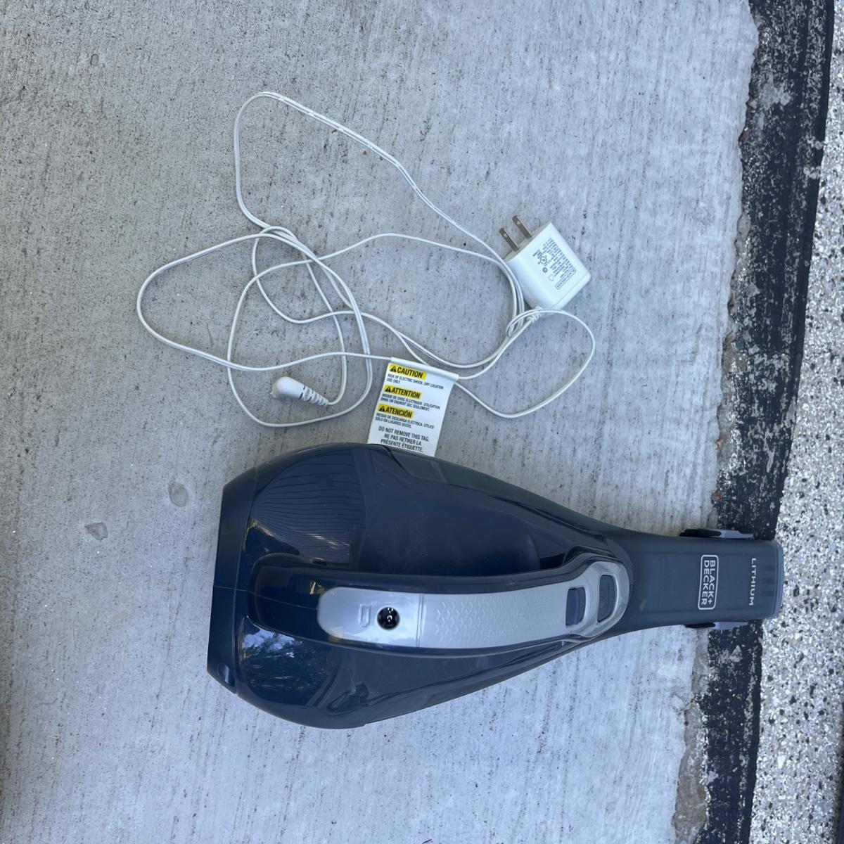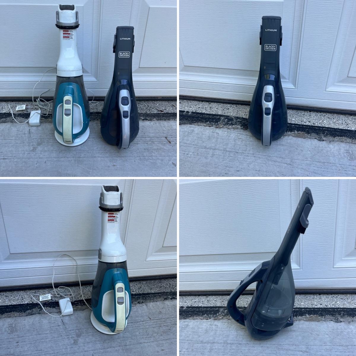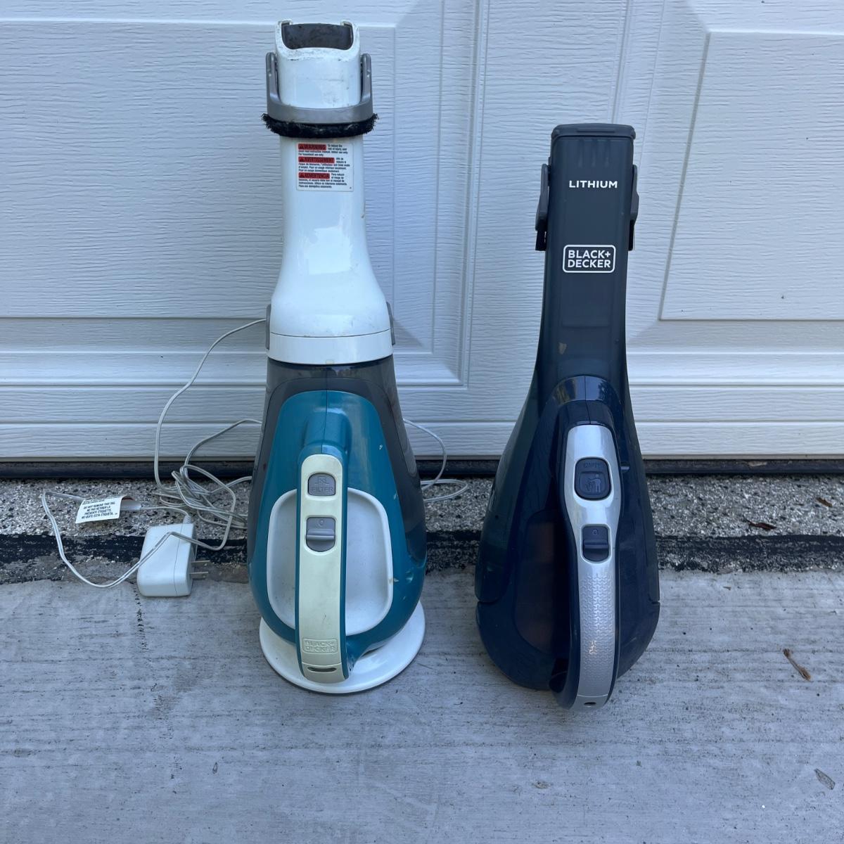 Lot includes a Black & Decker 16V lithium cordless vacuum and a Black & Decker 12V lithium cordless vacuum. Both powered on when switched on and include chargers. Largest vacuum measures 5” x 6” x 22”Long.