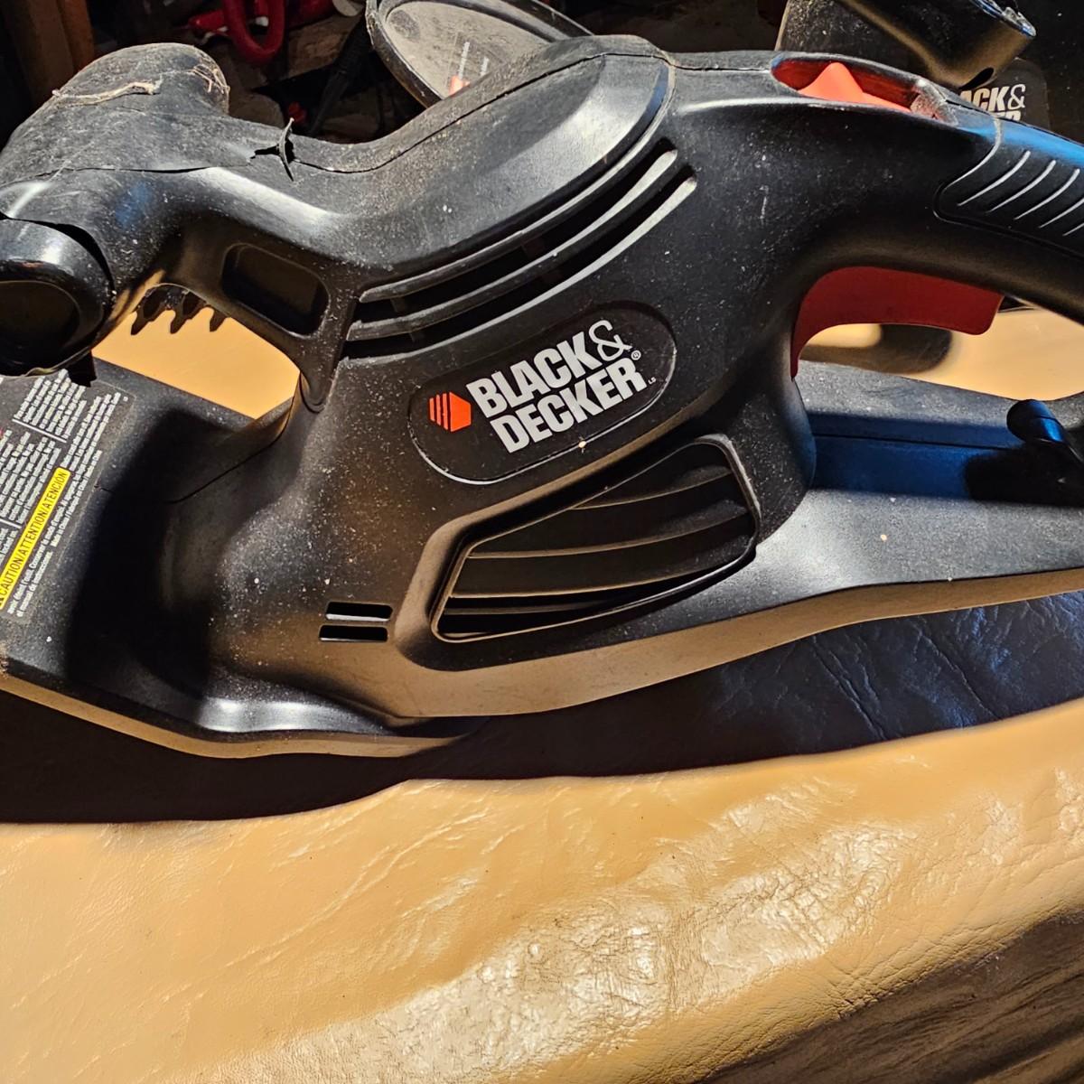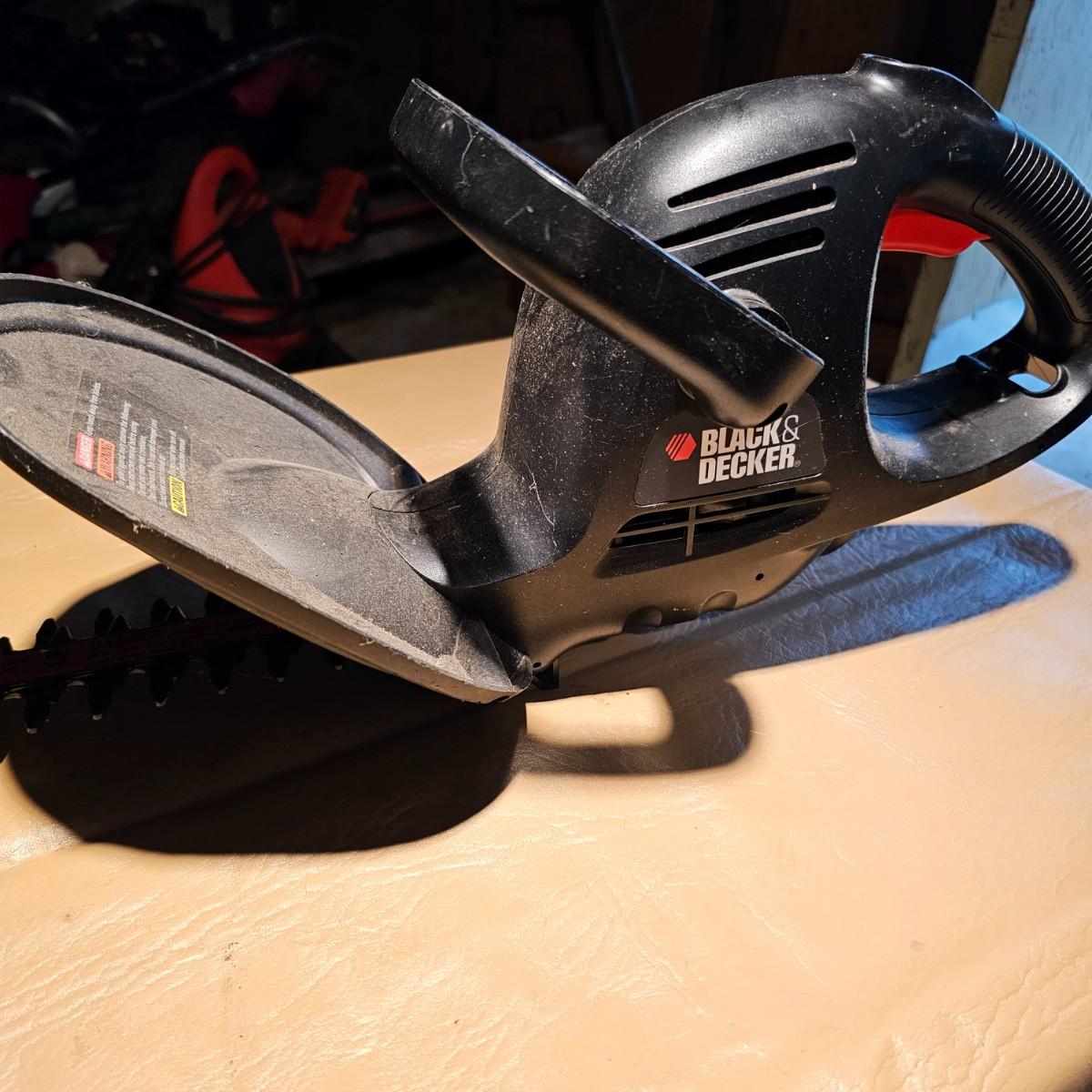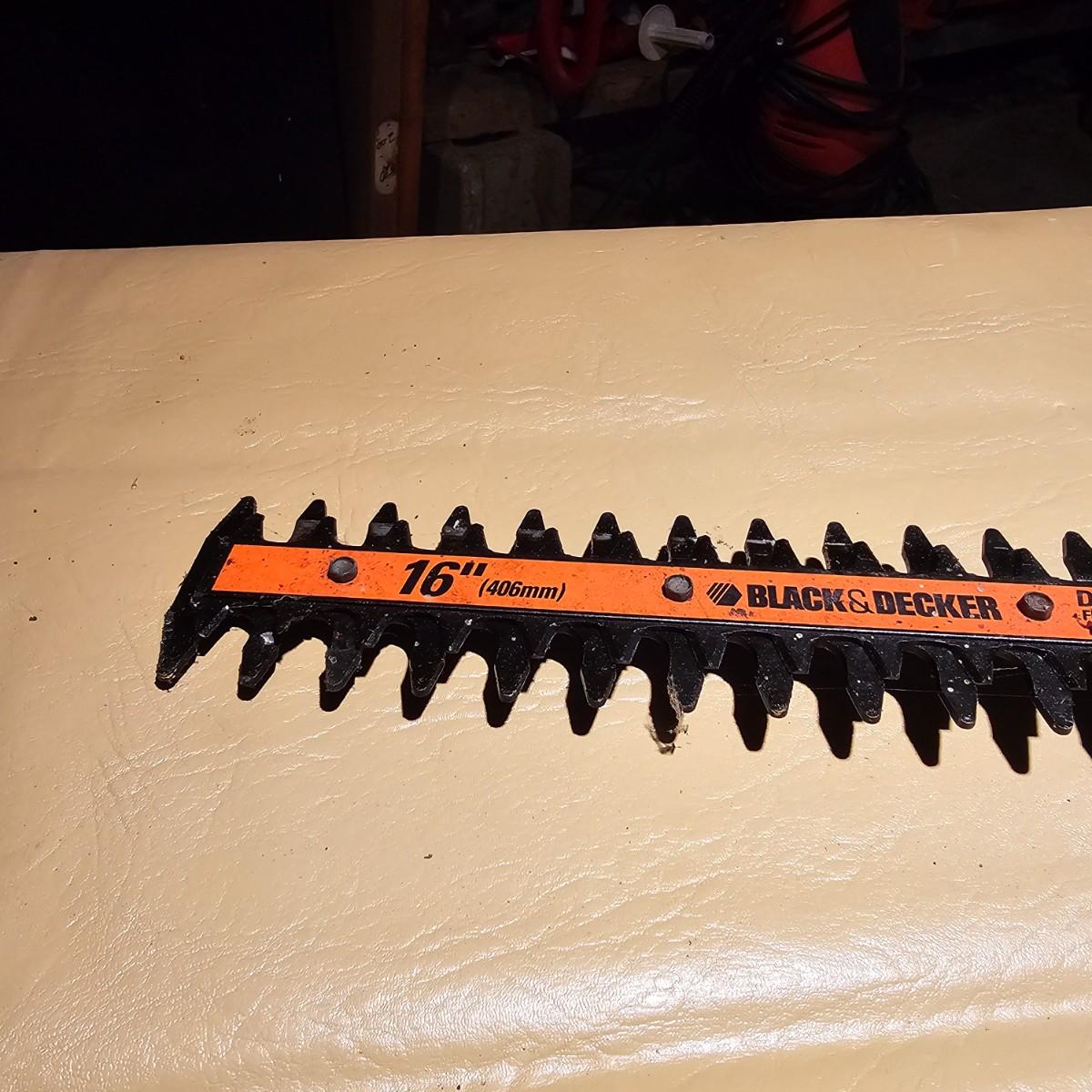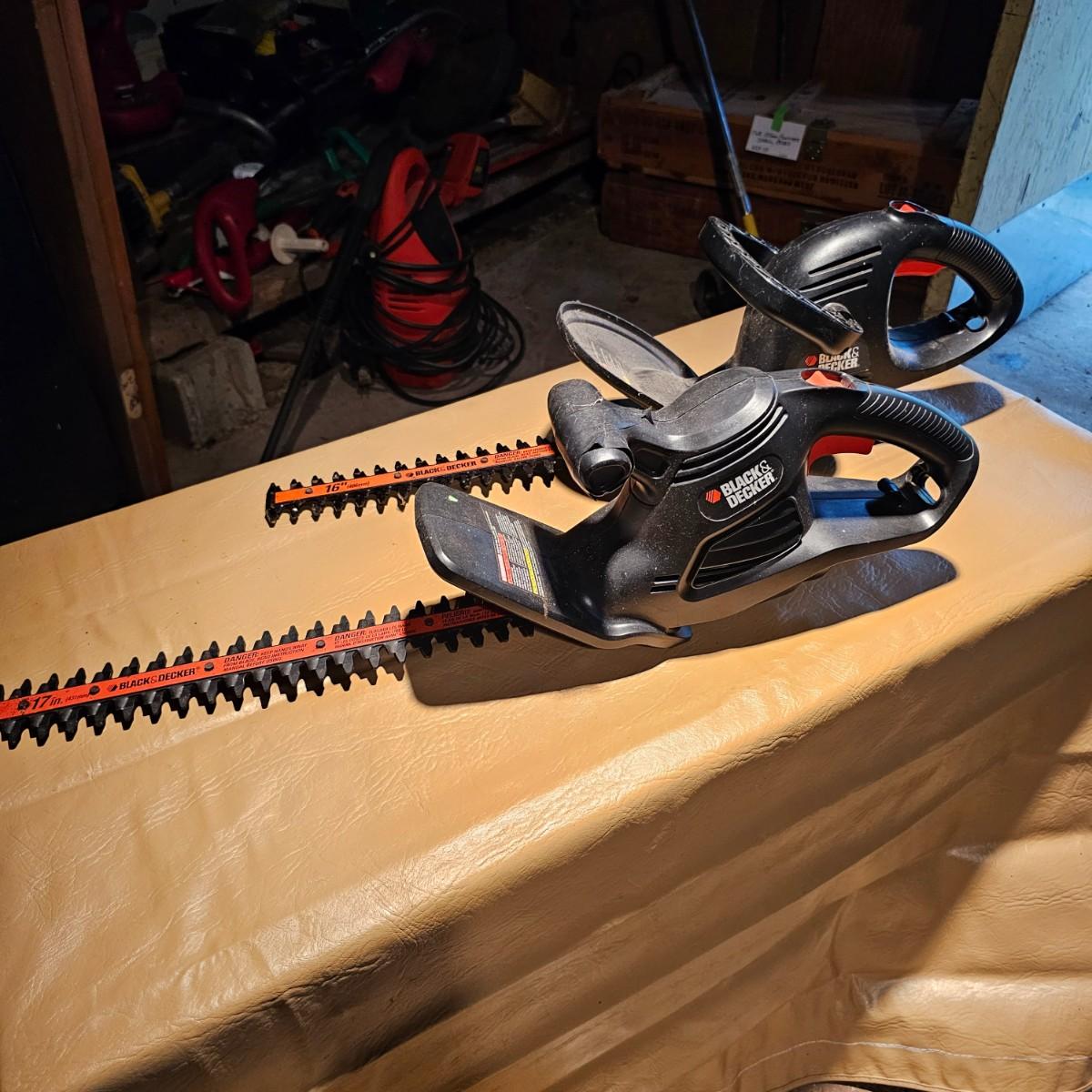 A pair of electric hedge trimmers by Black & Decker, one 16" and one 17". Handles and handguards, all pladtic bodies. Both powered on when plugged in. See photos for details. Local pickup only.