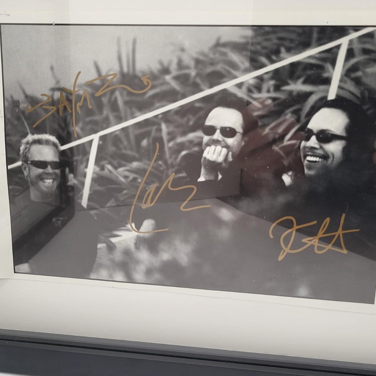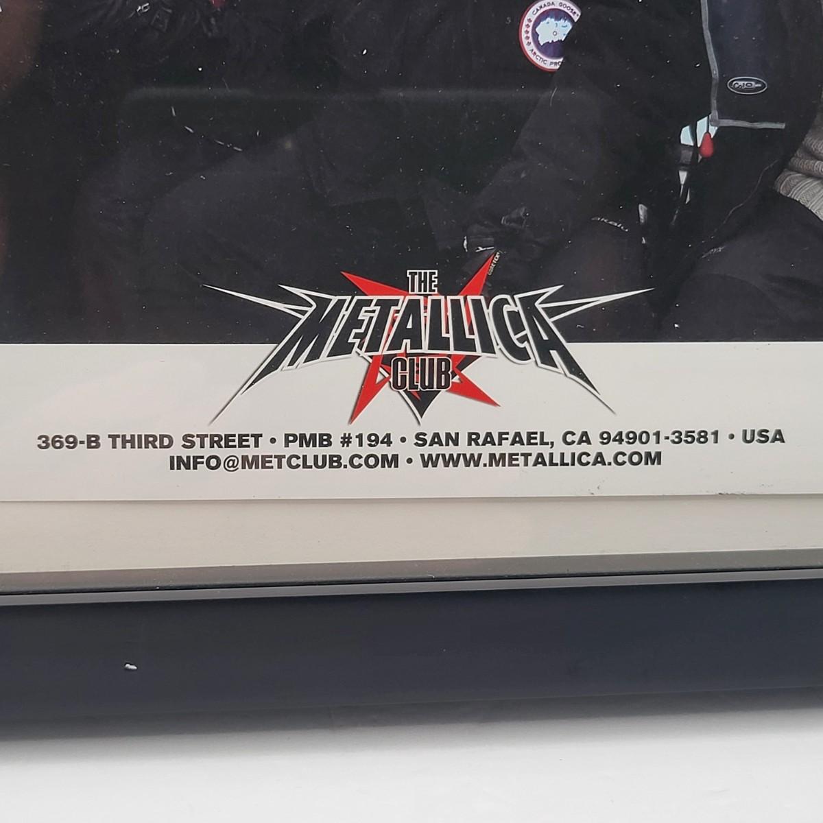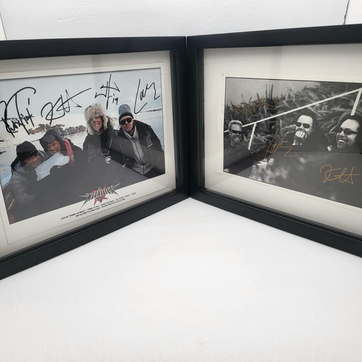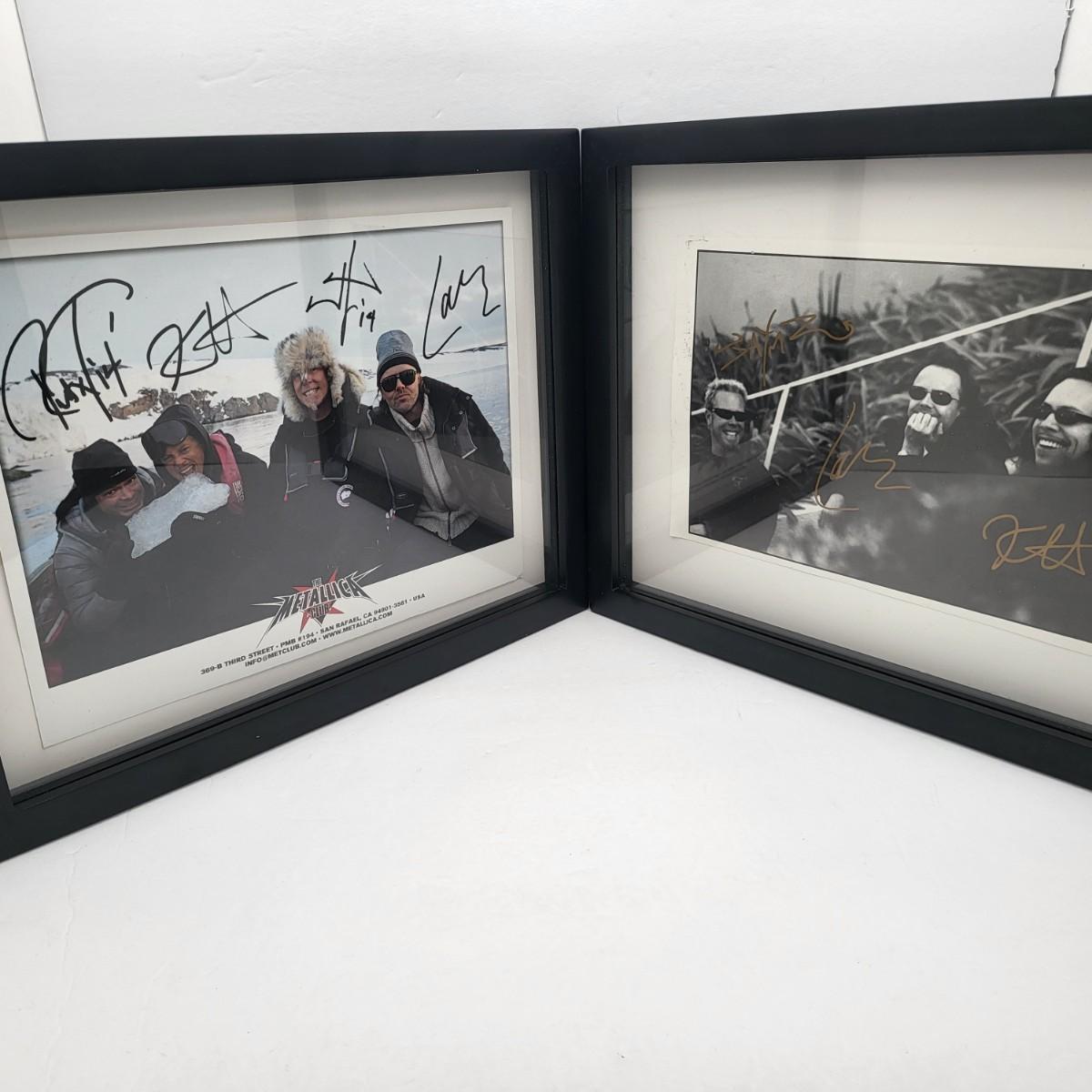 Two 14" x 11.5" black frames Metallica club autograph prints.