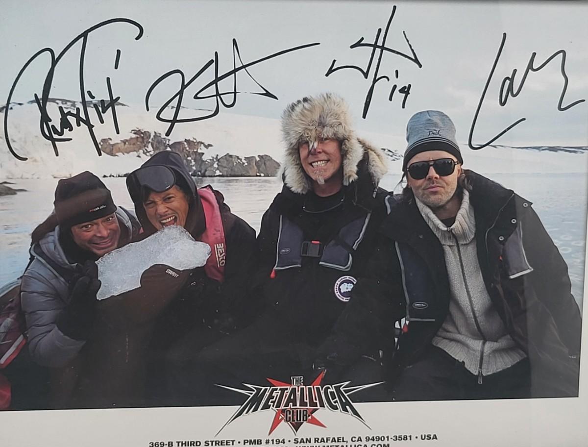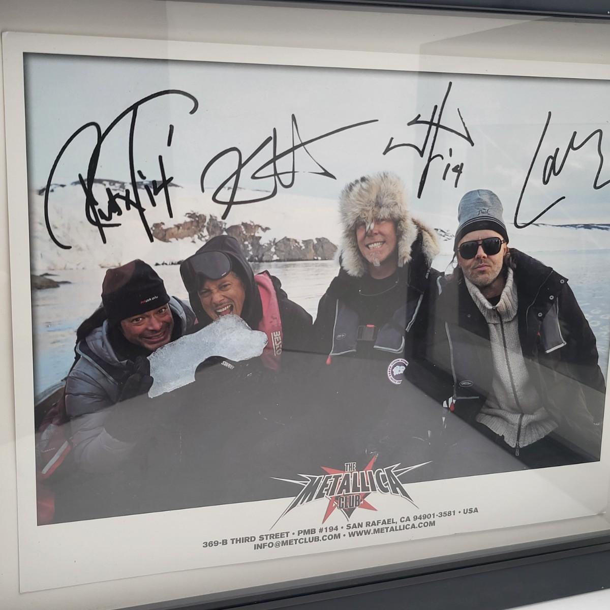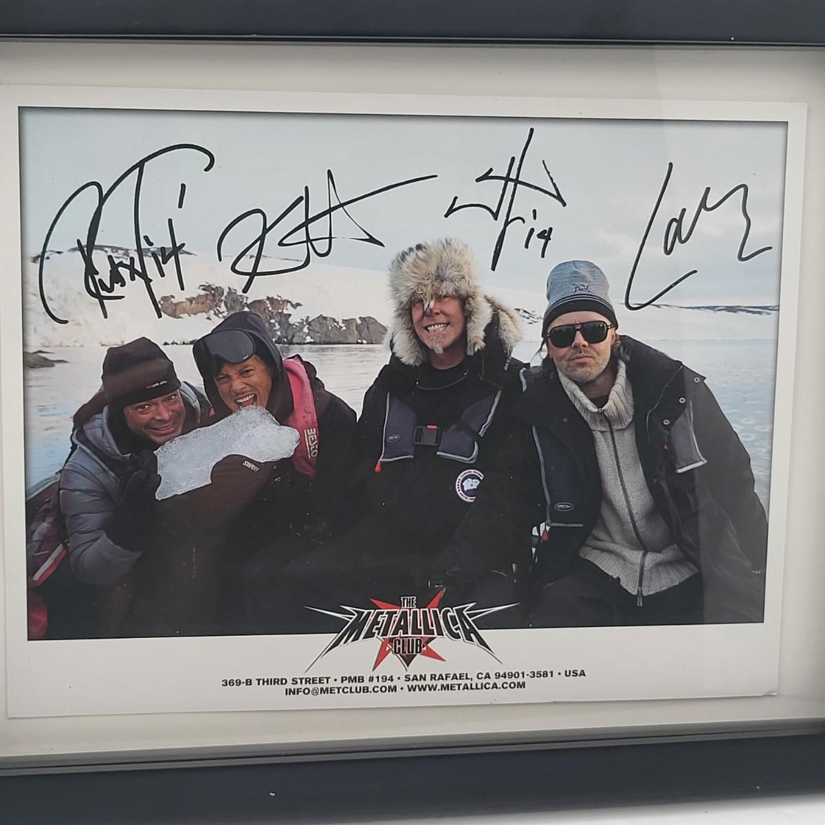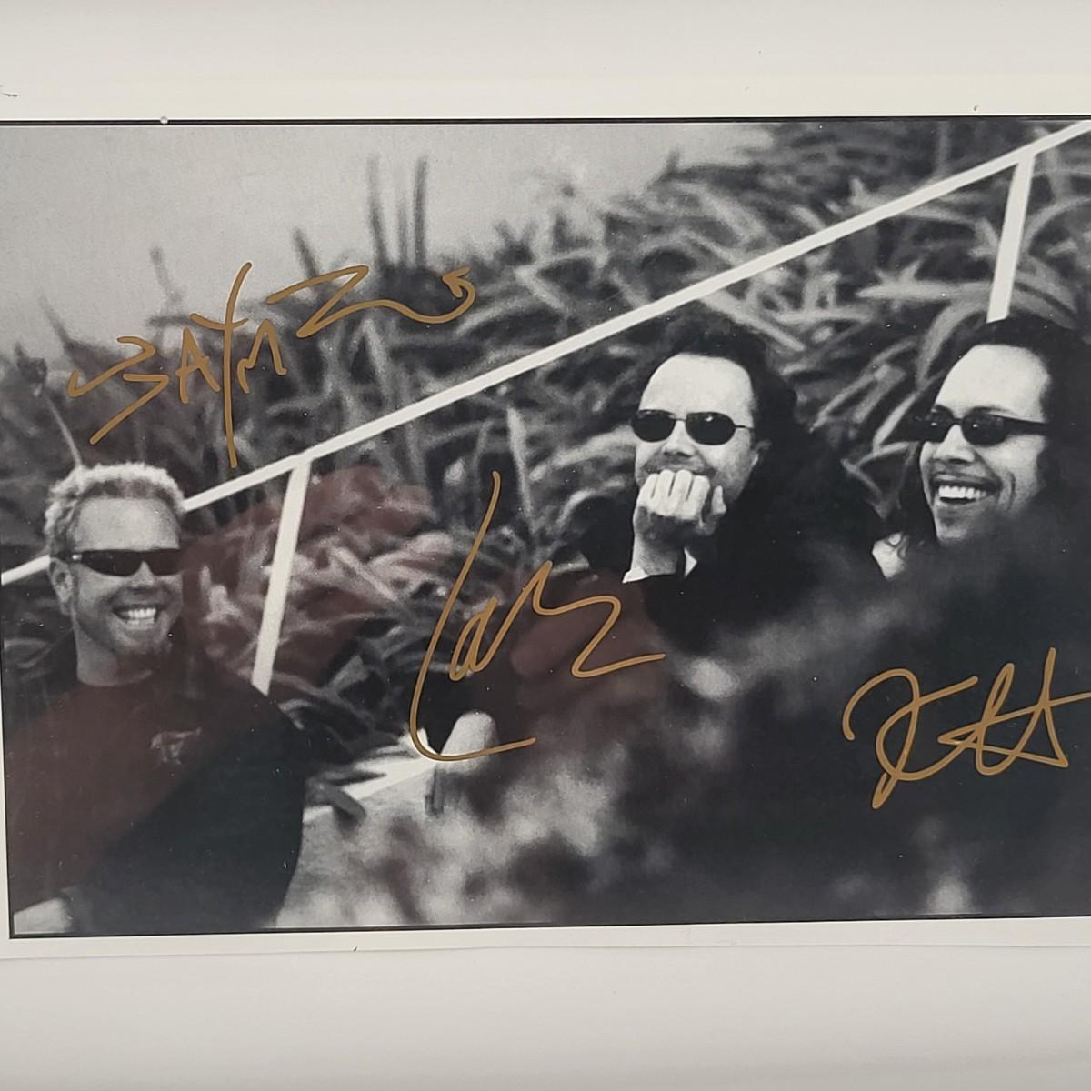 Two 14" x 11.5" black frames Metallica club autograph prints.