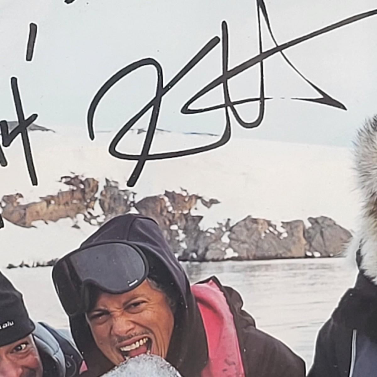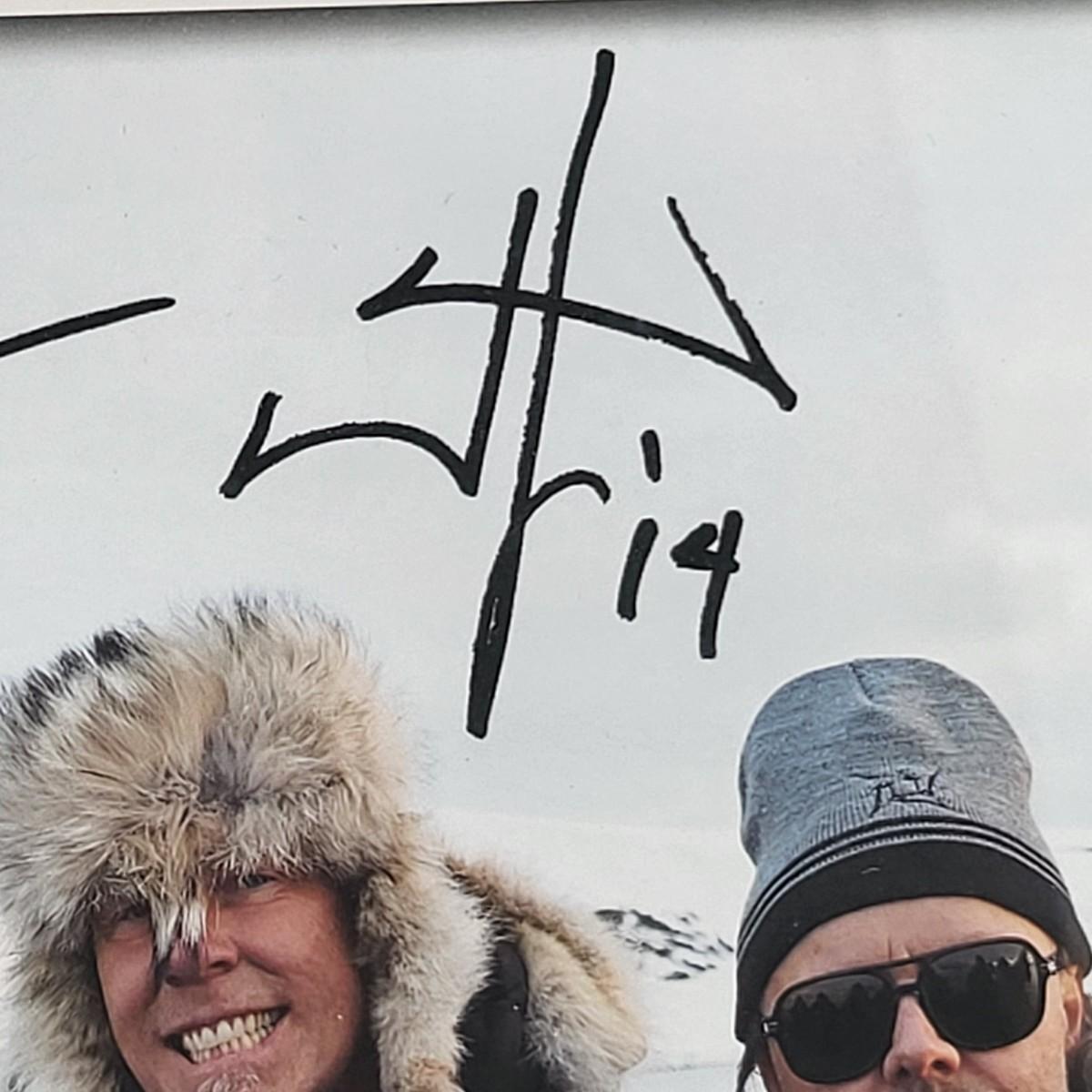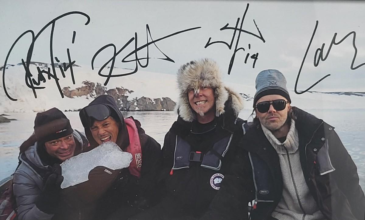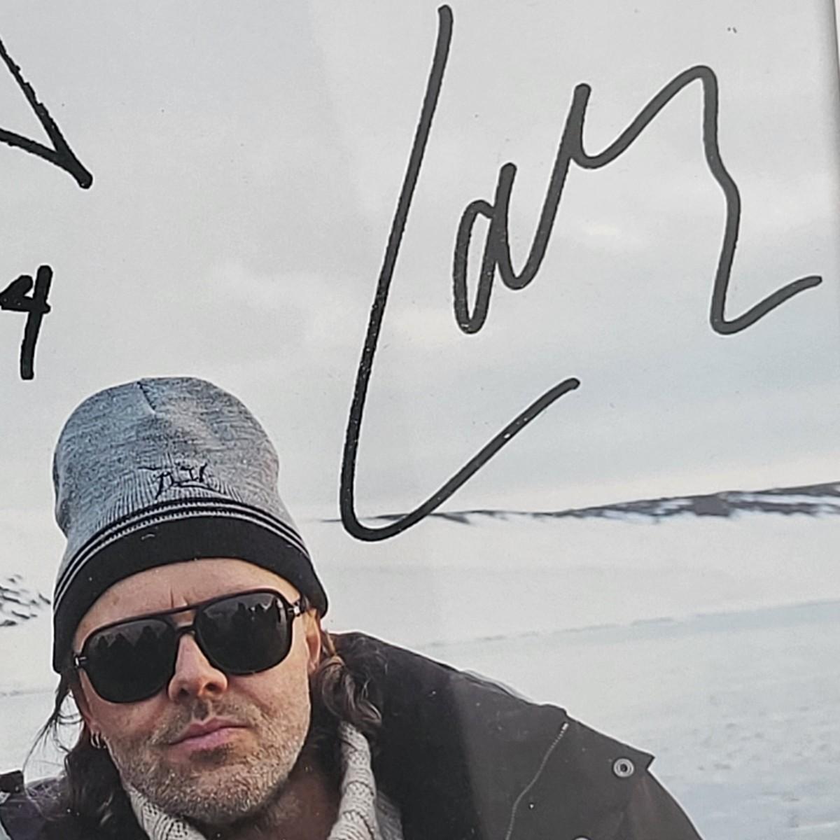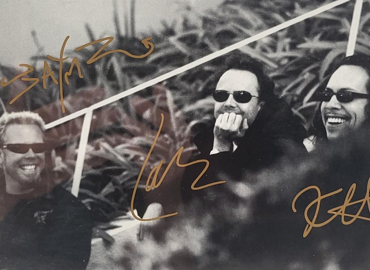 Two 14" x 11.5" black frames Metallica club autograph prints.