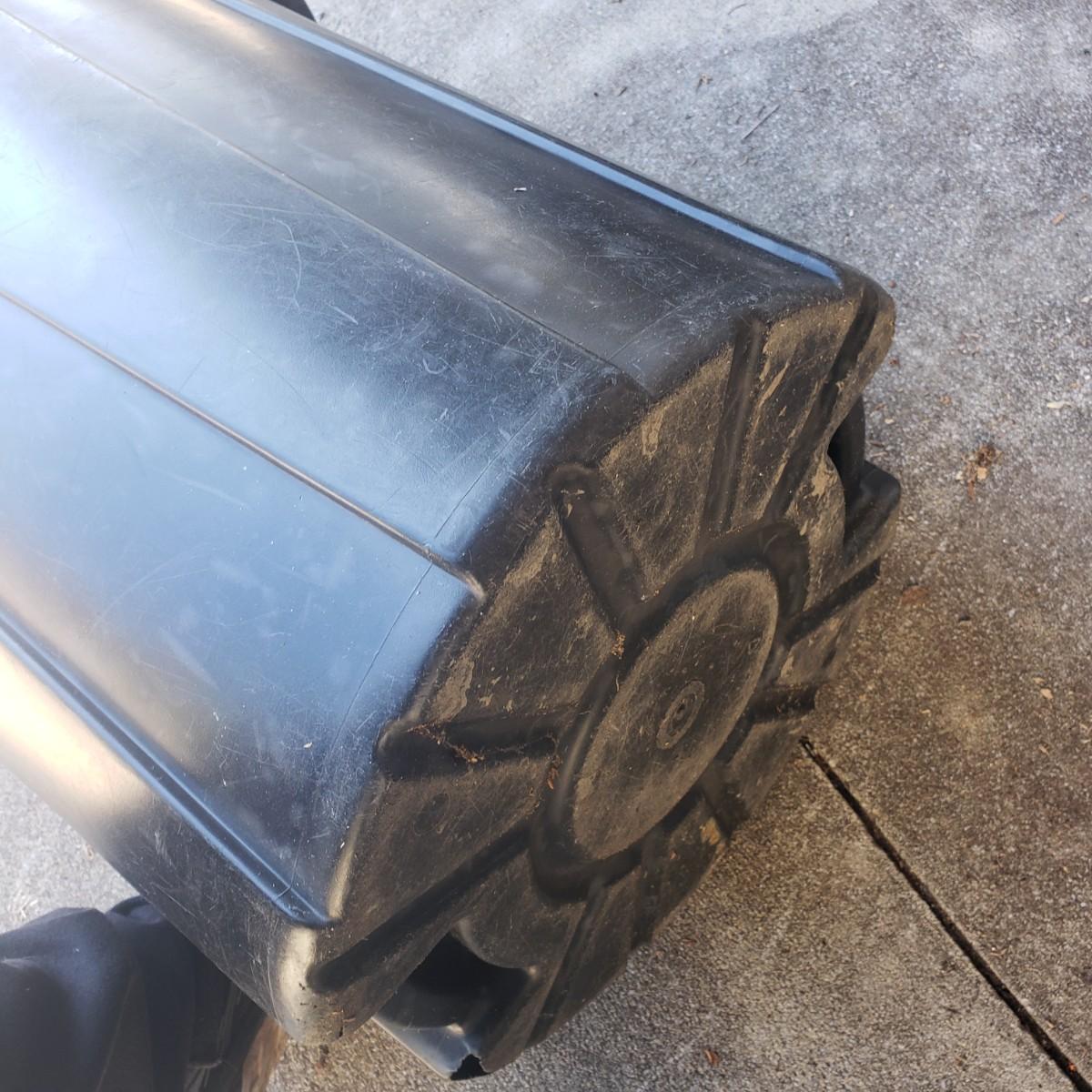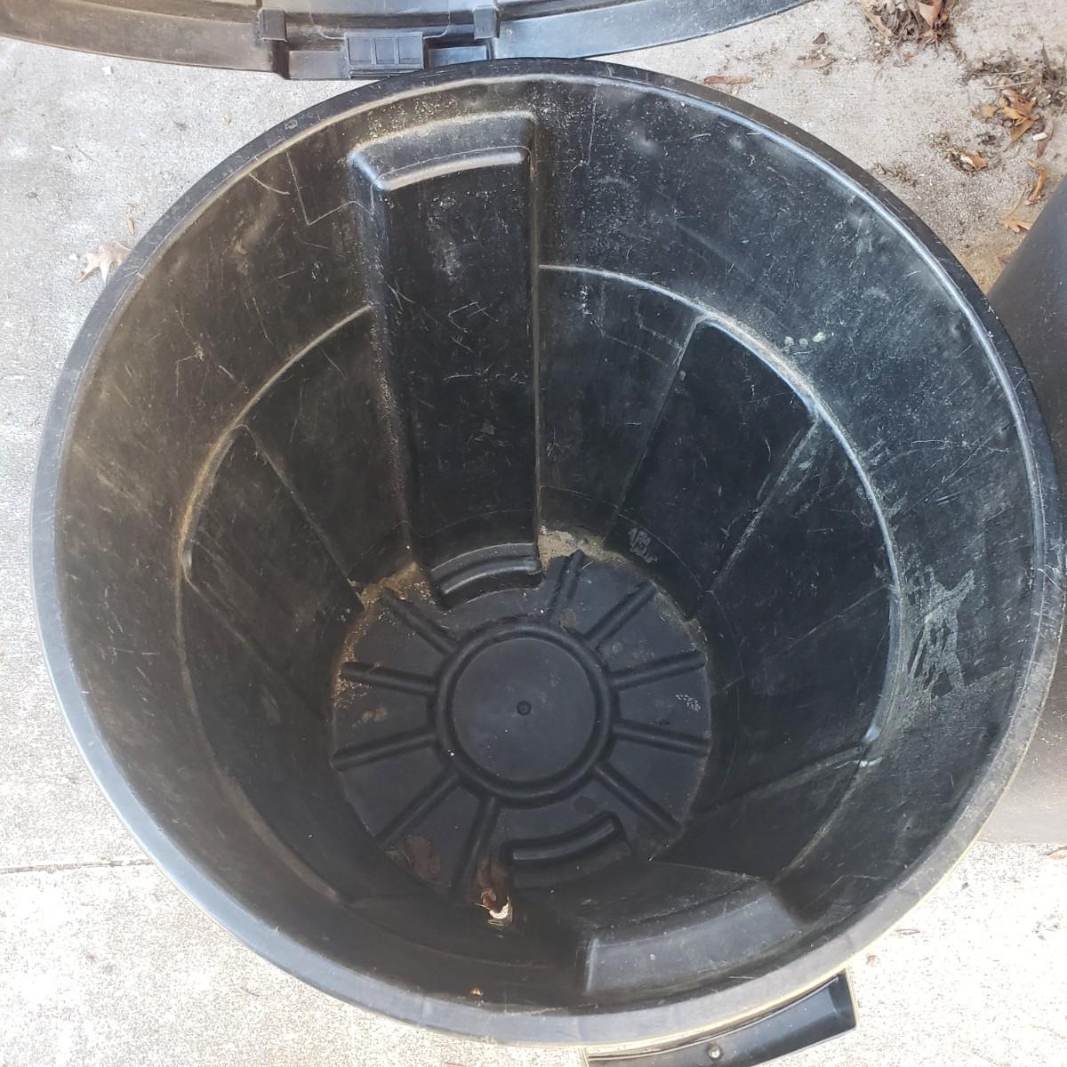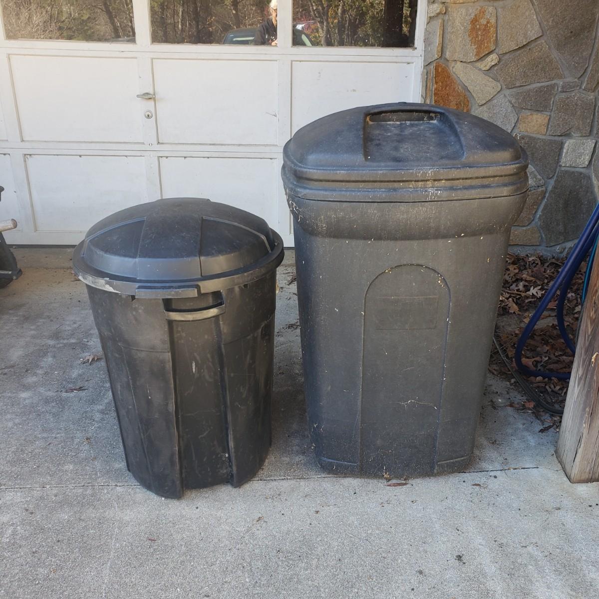 This two piece lot has black plastic garbage cans. The smaller one measures 22" x 31" H. The lid clicks in place. The larger can measures 24" x 23" x 40" H.