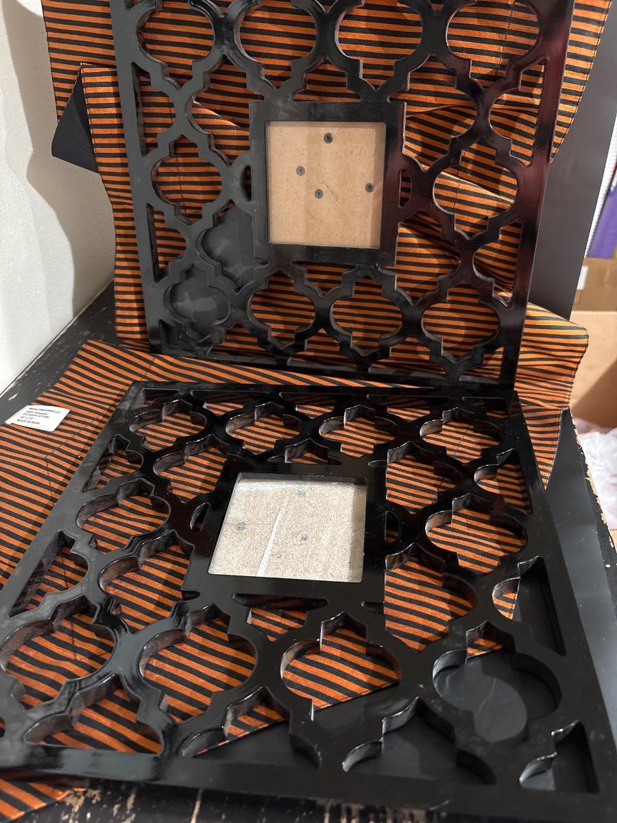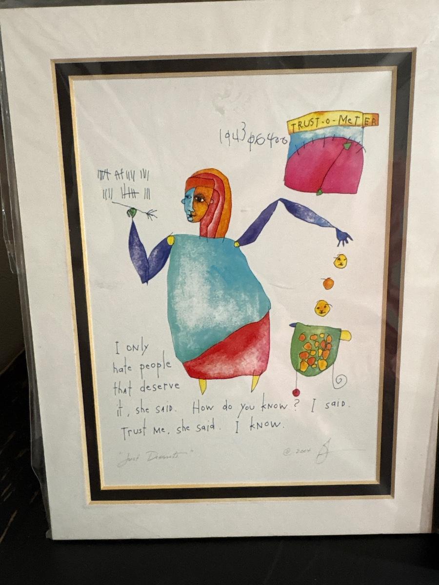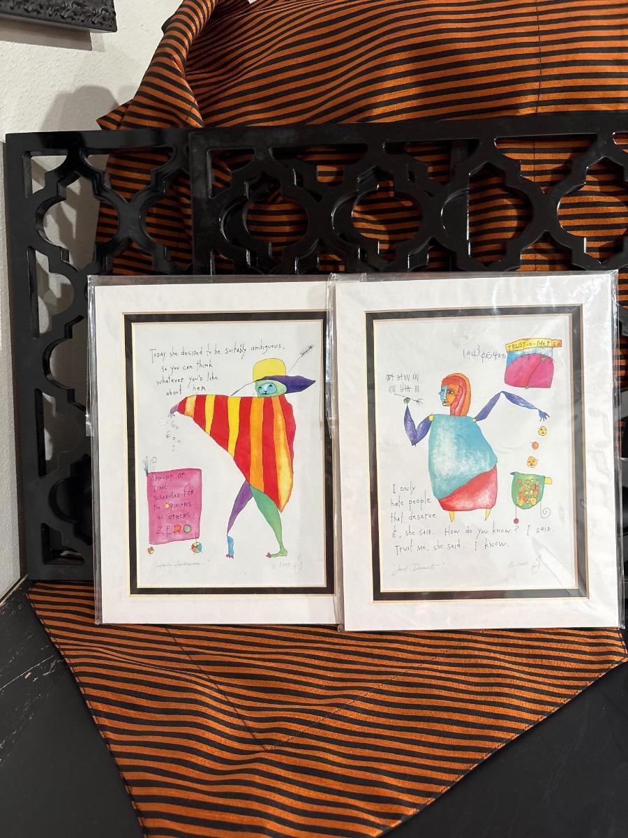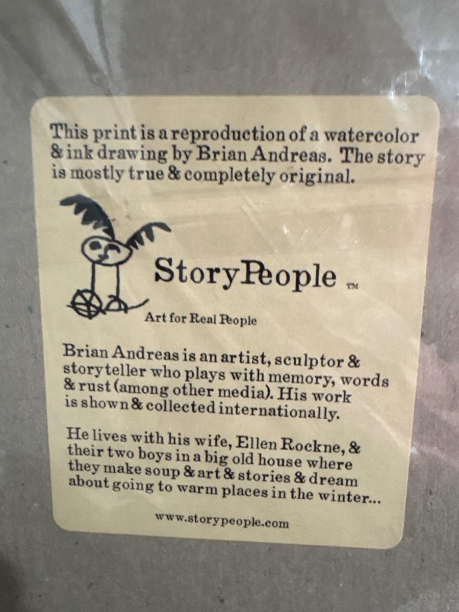 Two black photo frames 12.5”, one missing stand. Two cool Story People prints!