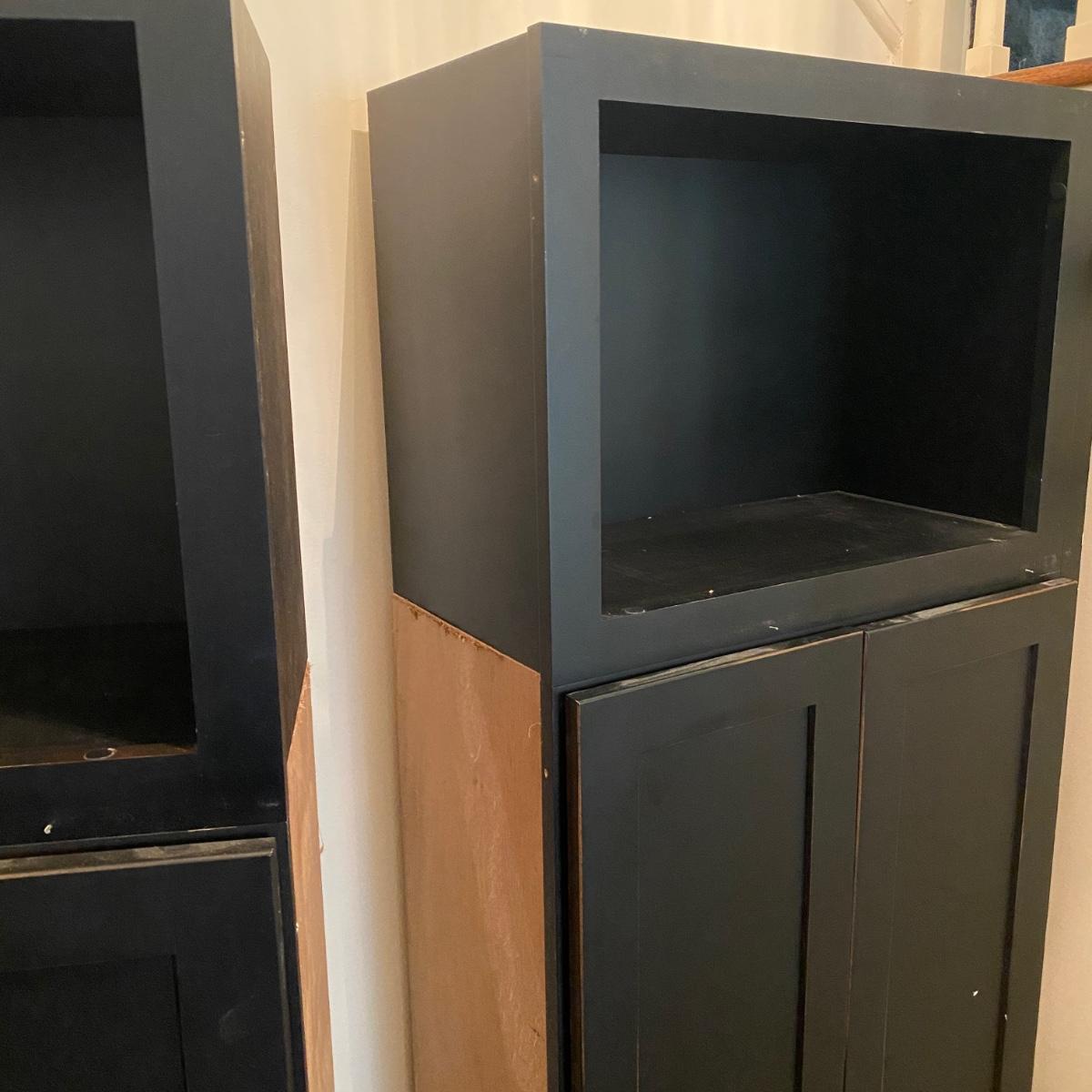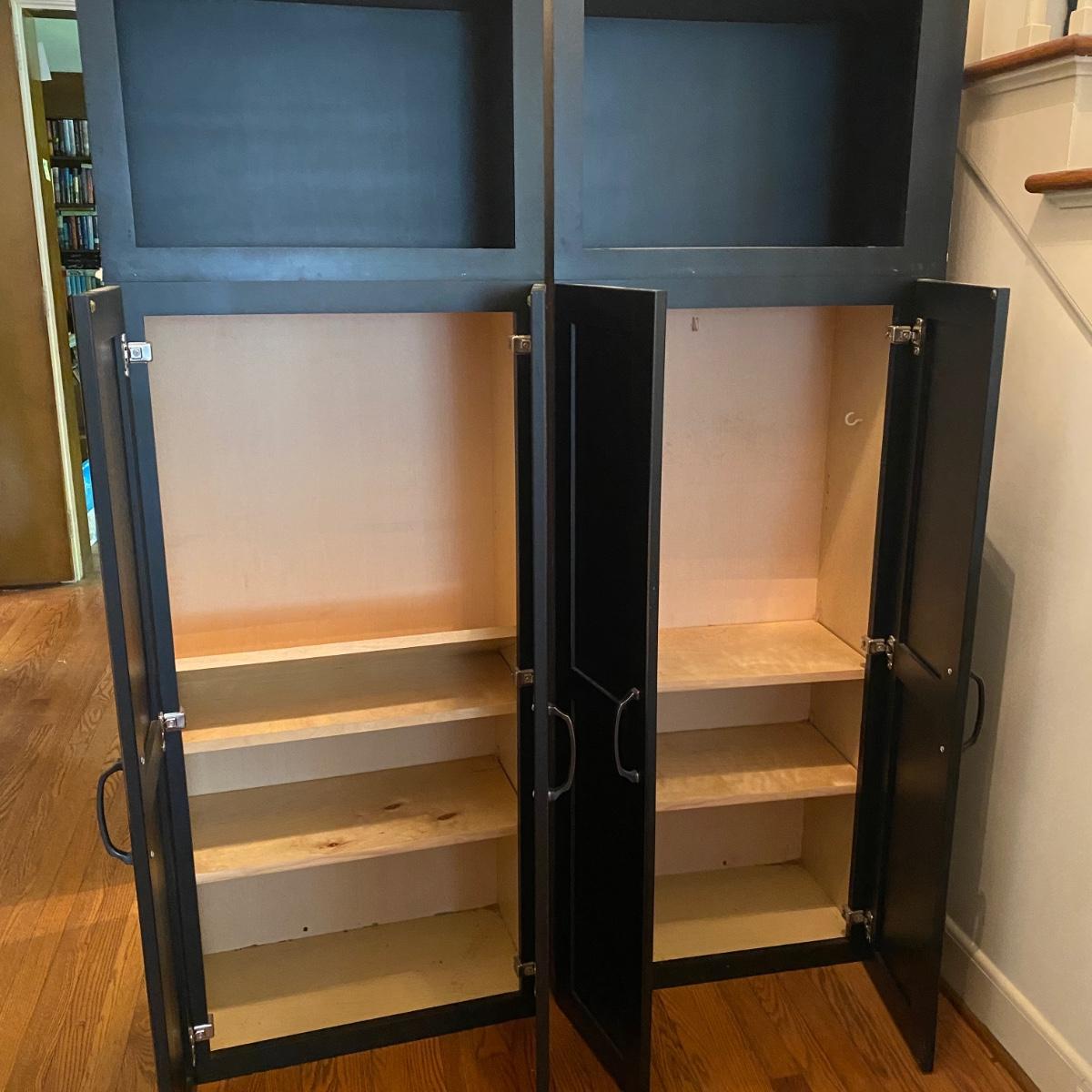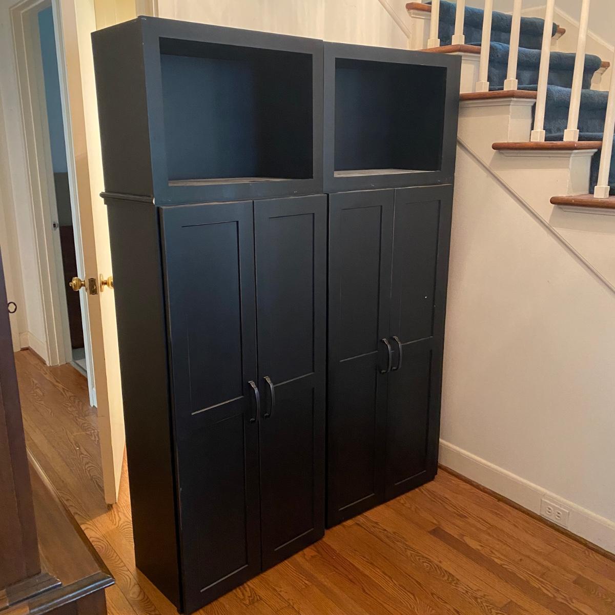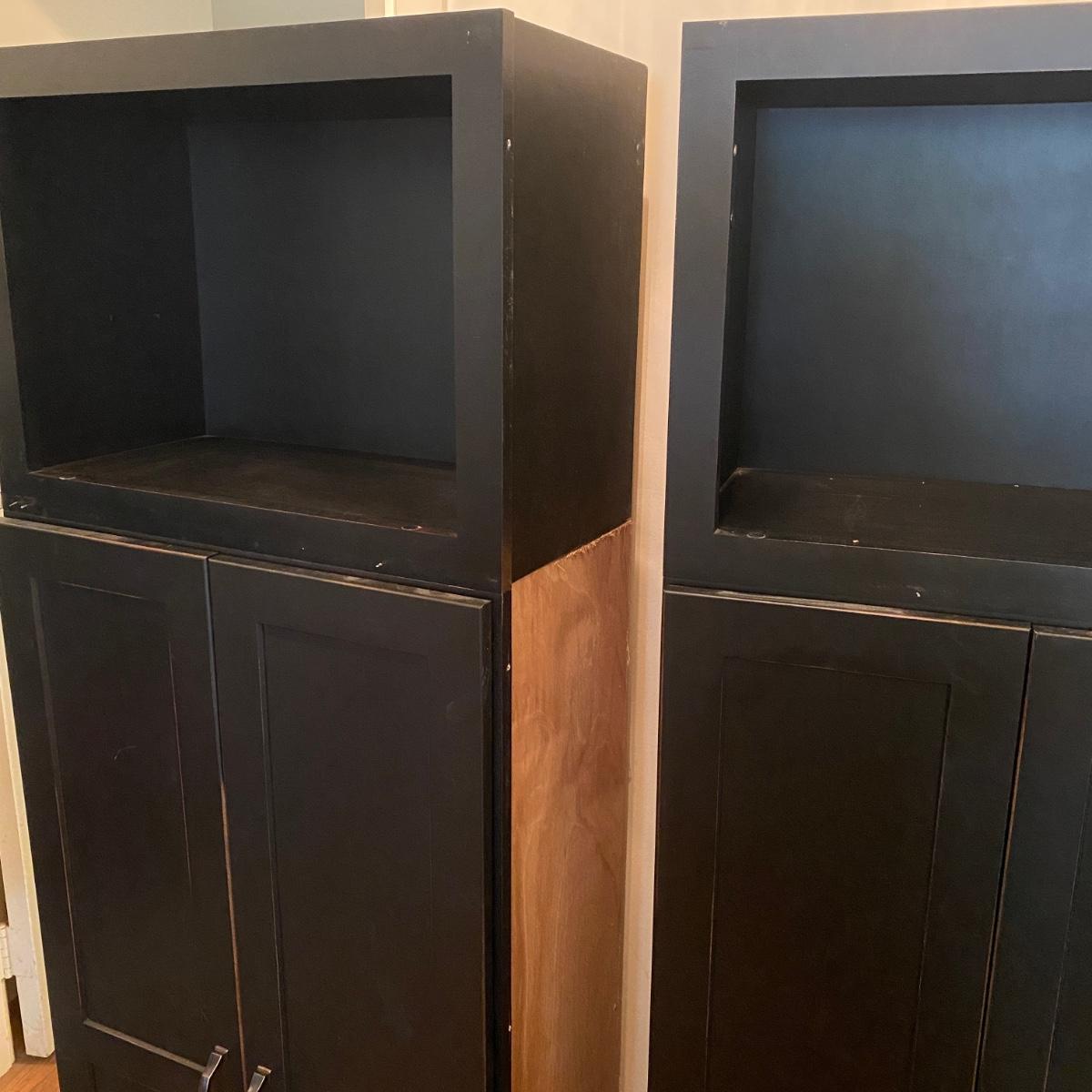 Two matching cabinets that can be used as storage. Black color. They have adjustable shelves inside for a total of five shelves. Cubby style opening on top measures 14” tall x 20.5” wide x 11” deep. Total cabinet measures 24”wide x 13”deep x 68” tall. Please note that the molding that sits just under the front cubby opening is missing and there are a couple exploded nails. If you pull out the nails you would never know it was there! See photos showing the side molding that is still attached on the only side that is finished. The other three sides are unfinished. Local pick up only.