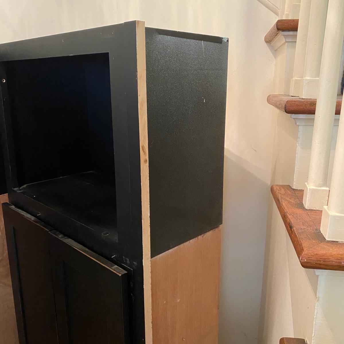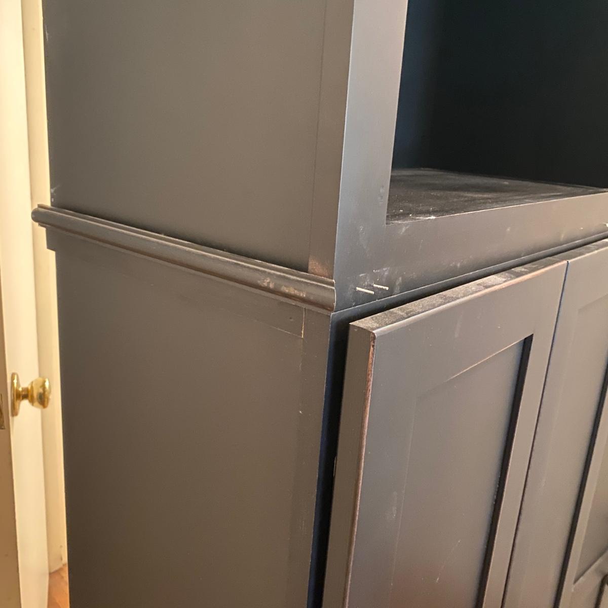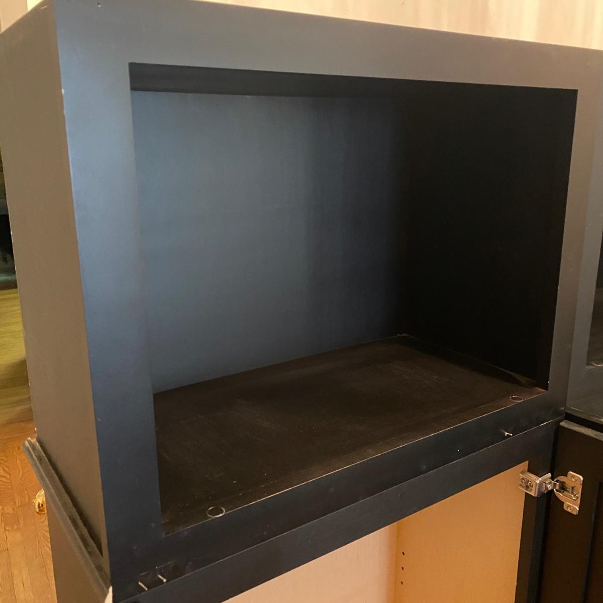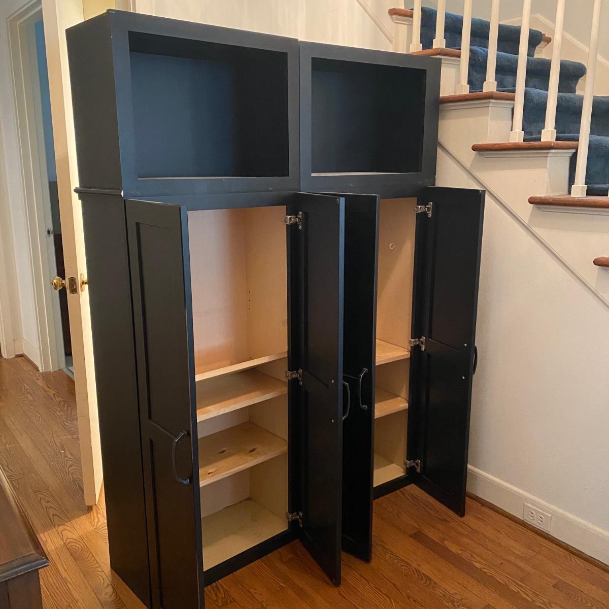 Two matching cabinets that can be used as storage. Black color. They have adjustable shelves inside for a total of five shelves. Cubby style opening on top measures 14” tall x 20.5” wide x 11” deep. Total cabinet measures 24”wide x 13”deep x 68” tall. Please note that the molding that sits just under the front cubby opening is missing and there are a couple exploded nails. If you pull out the nails you would never know it was there! See photos showing the side molding that is still attached on the only side that is finished. The other three sides are unfinished. Local pick up only.
