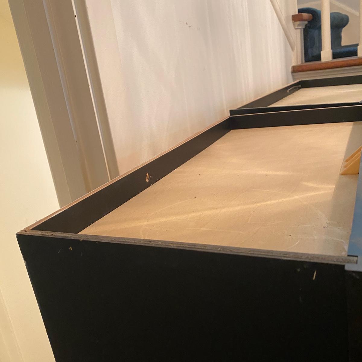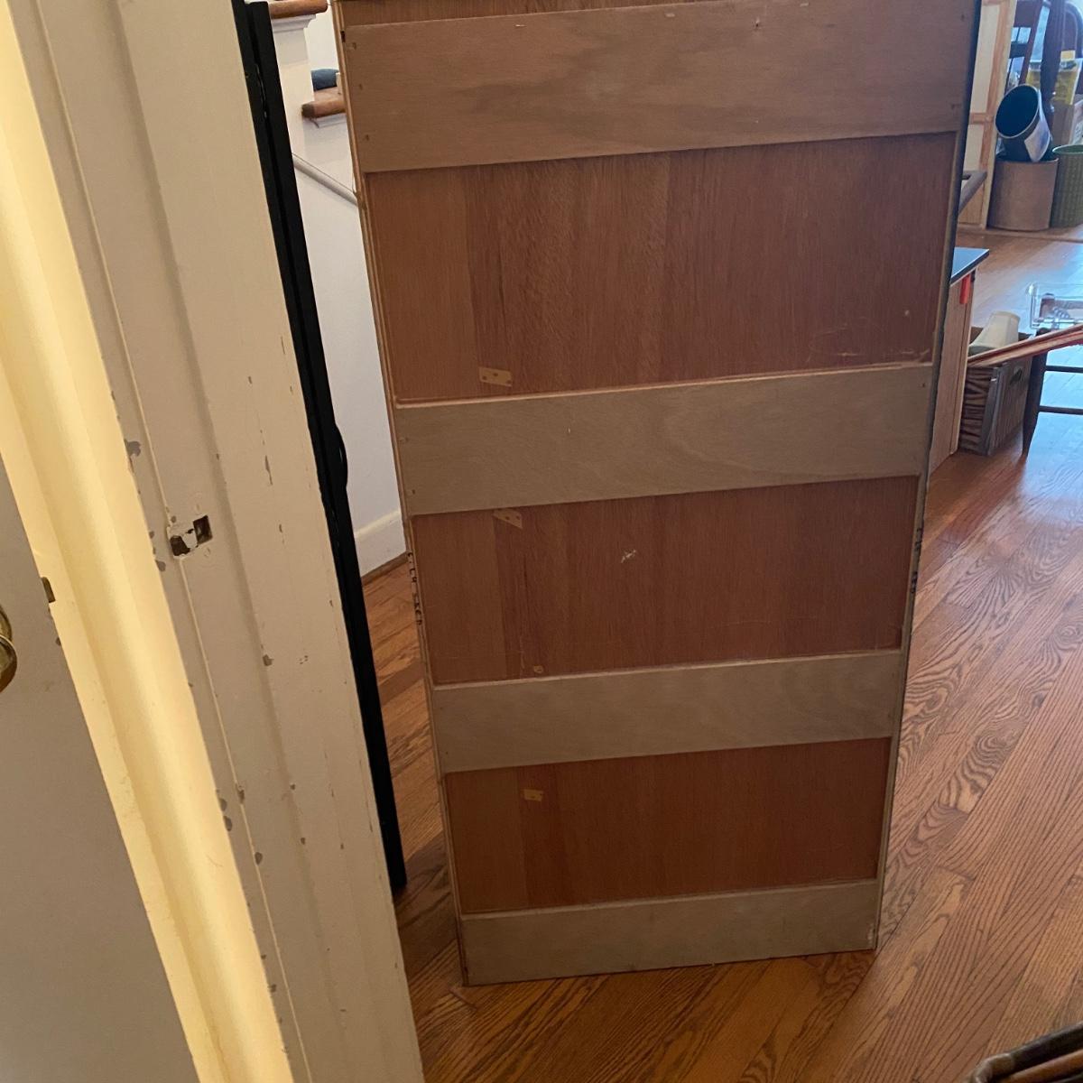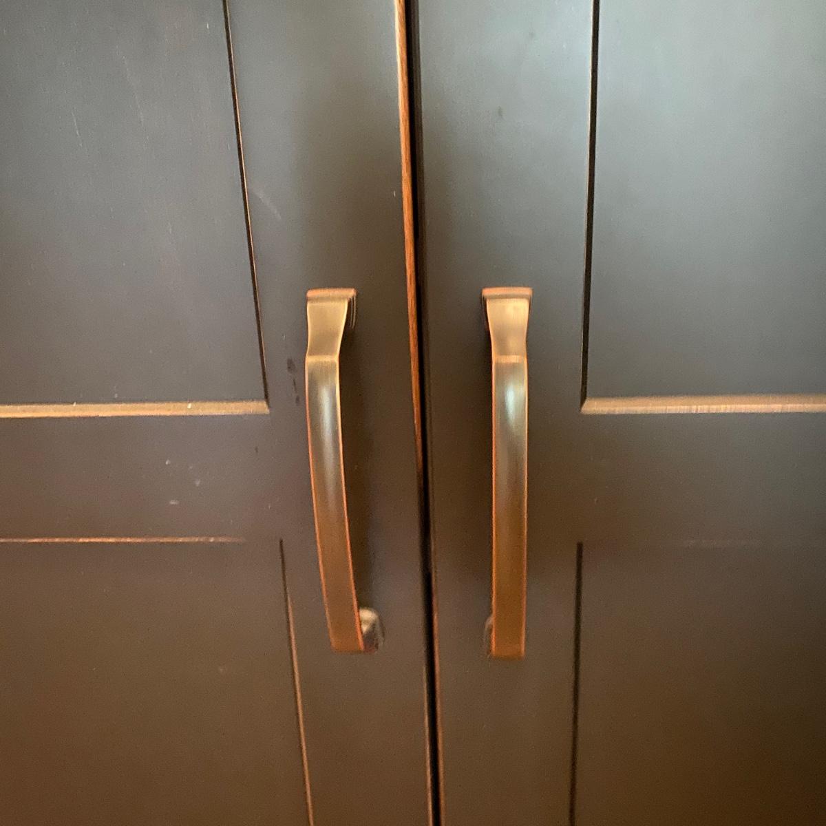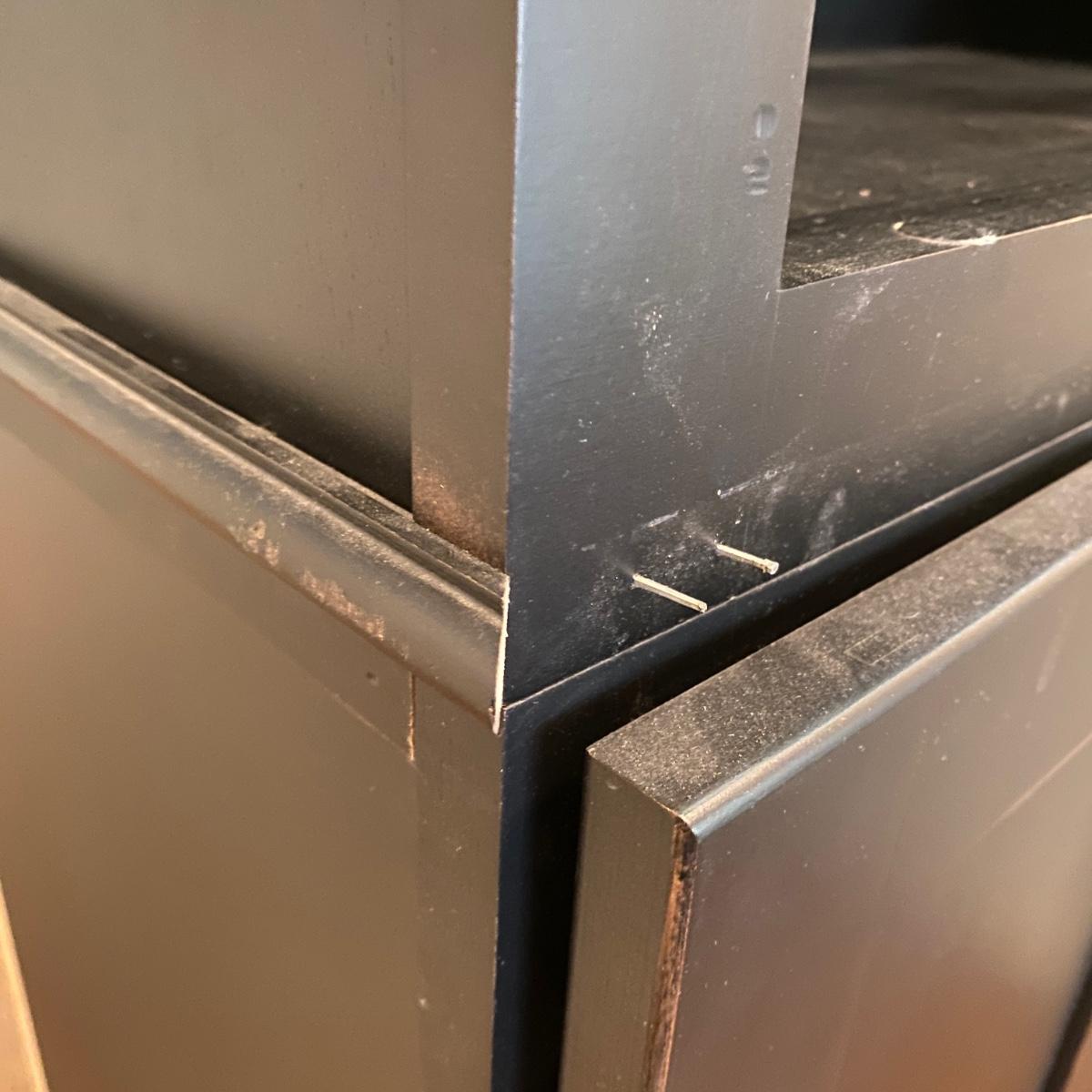 Two matching cabinets that can be used as storage. Black color. They have adjustable shelves inside for a total of five shelves. Cubby style opening on top measures 14” tall x 20.5” wide x 11” deep. Total cabinet measures 24”wide x 13”deep x 68” tall. Please note that the molding that sits just under the front cubby opening is missing and there are a couple exploded nails. If you pull out the nails you would never know it was there! See photos showing the side molding that is still attached on the only side that is finished. The other three sides are unfinished. Local pick up only.