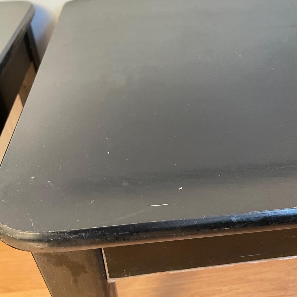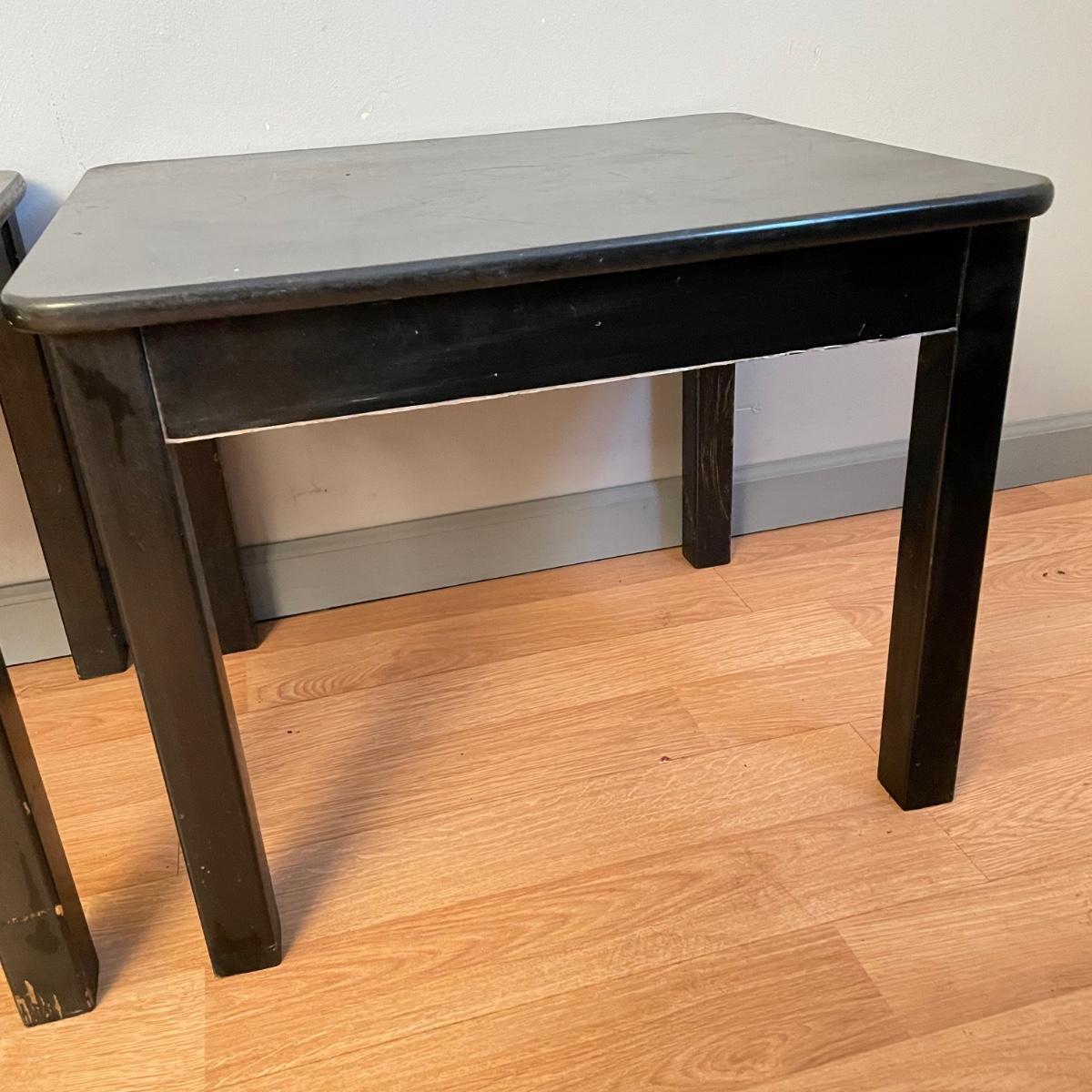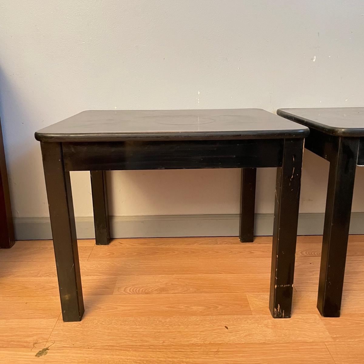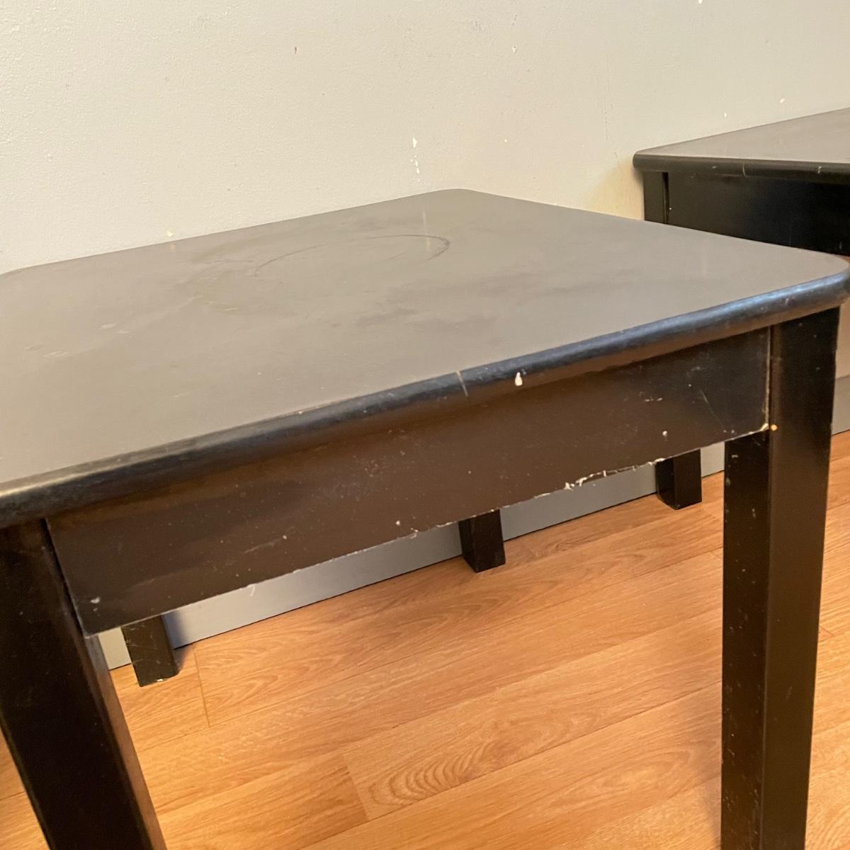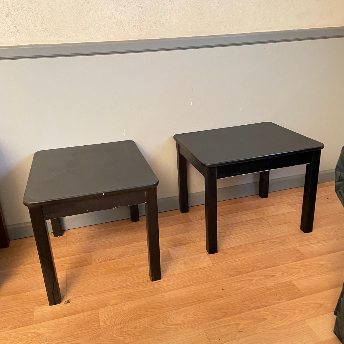 Two black painted wooden side tables. Tables measure 20” x 24” x 18.75” and are pressed wood. They are very sturdy with a few superficial blemishes and one 2.5” long separation in the tape-like finish on one side. It appears the tape can be removed, it is unclear if paint will come off when the tape is removed. See images. Local pick up only.