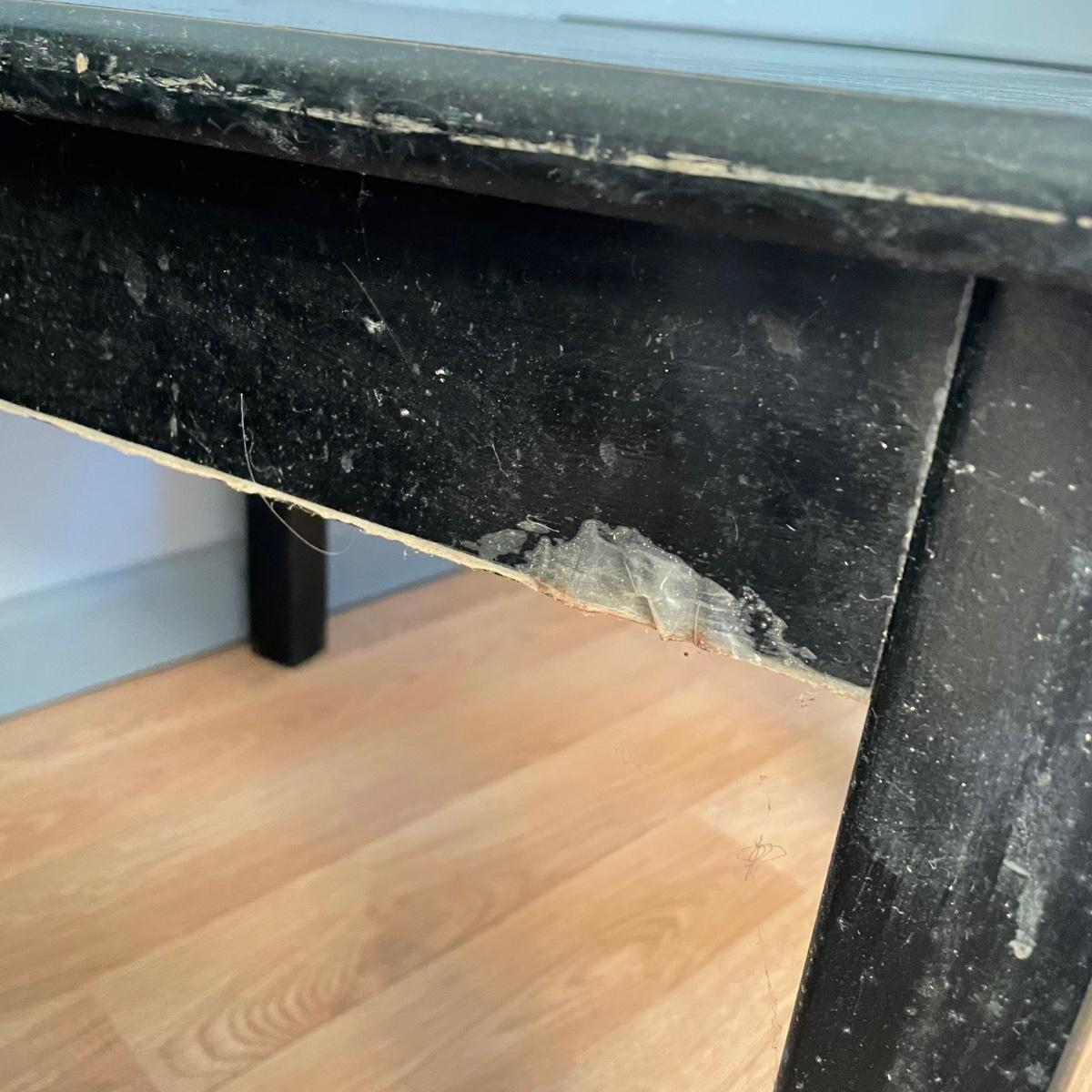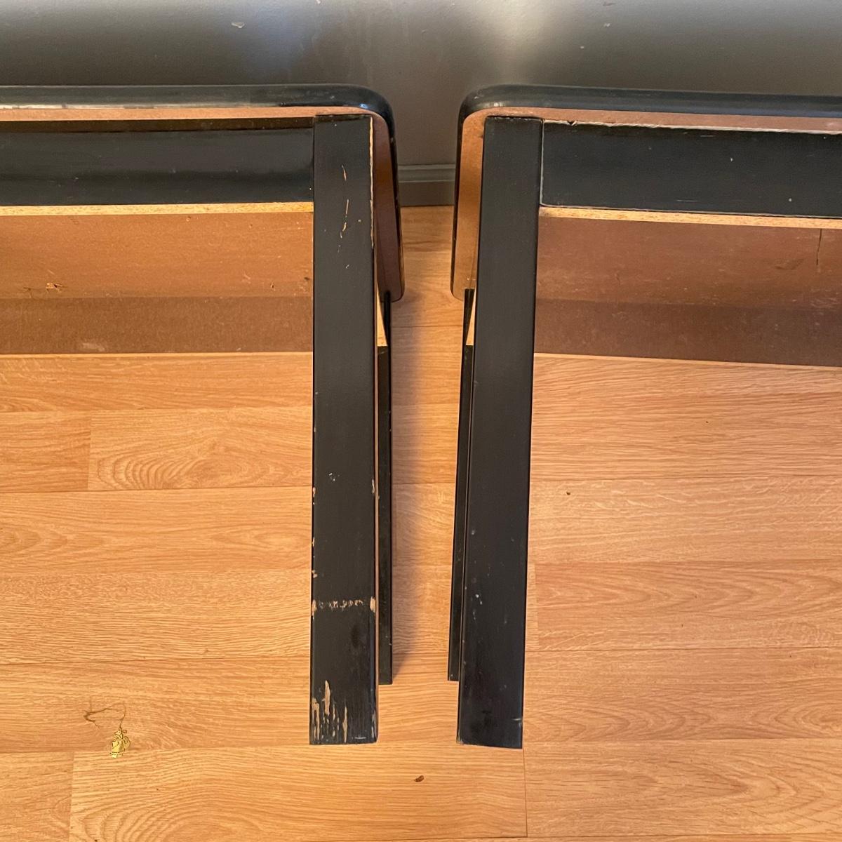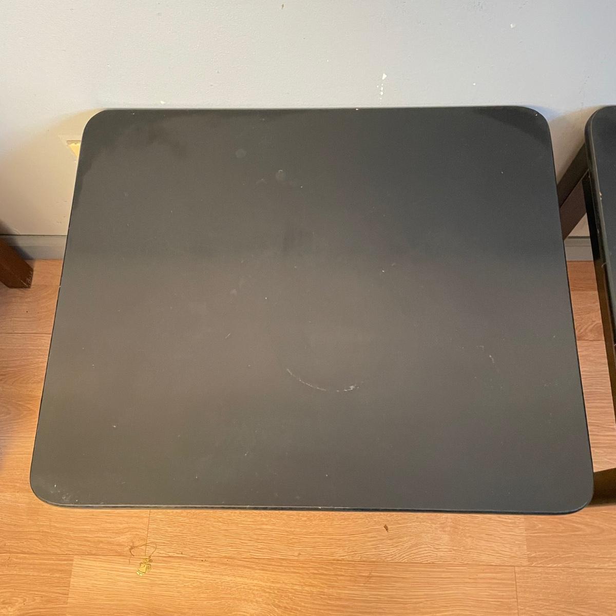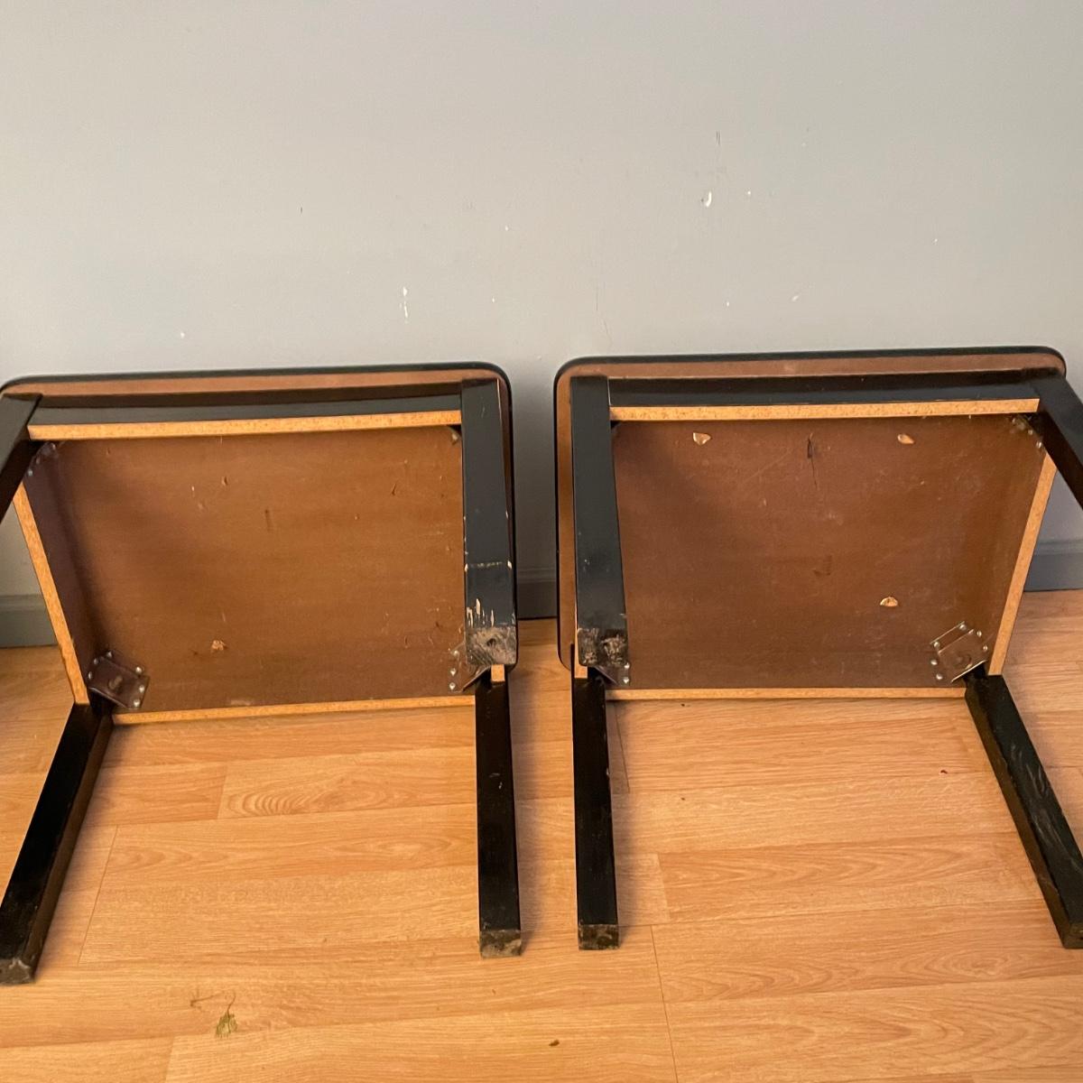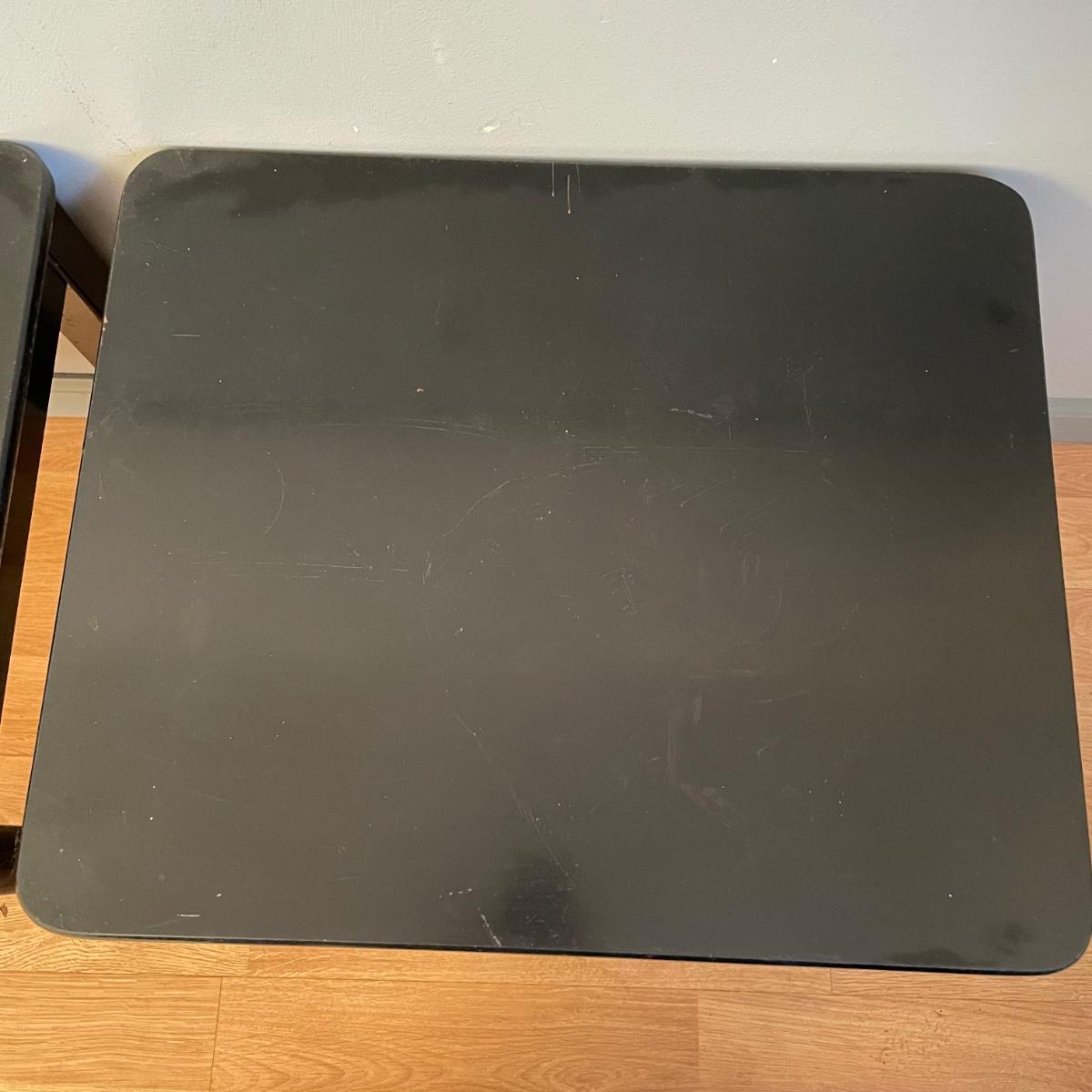 Two black painted wooden side tables. Tables measure 20” x 24” x 18.75” and are pressed wood. They are very sturdy with a few superficial blemishes and one 2.5” long separation in the tape-like finish on one side. It appears the tape can be removed, it is unclear if paint will come off when the tape is removed. See images. Local pick up only.