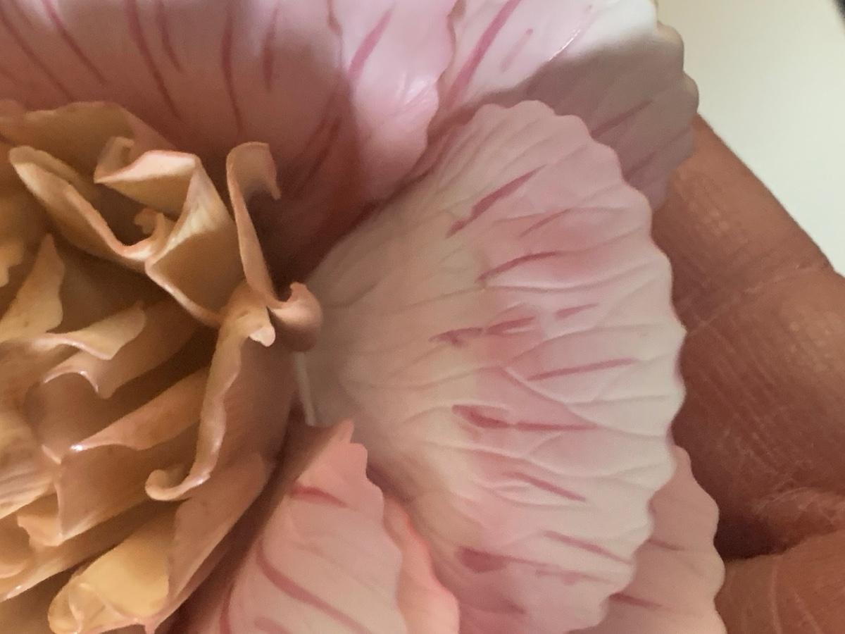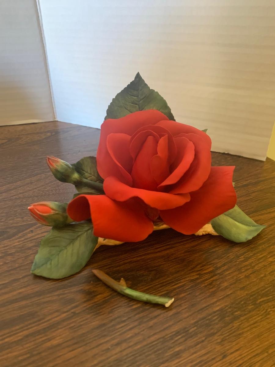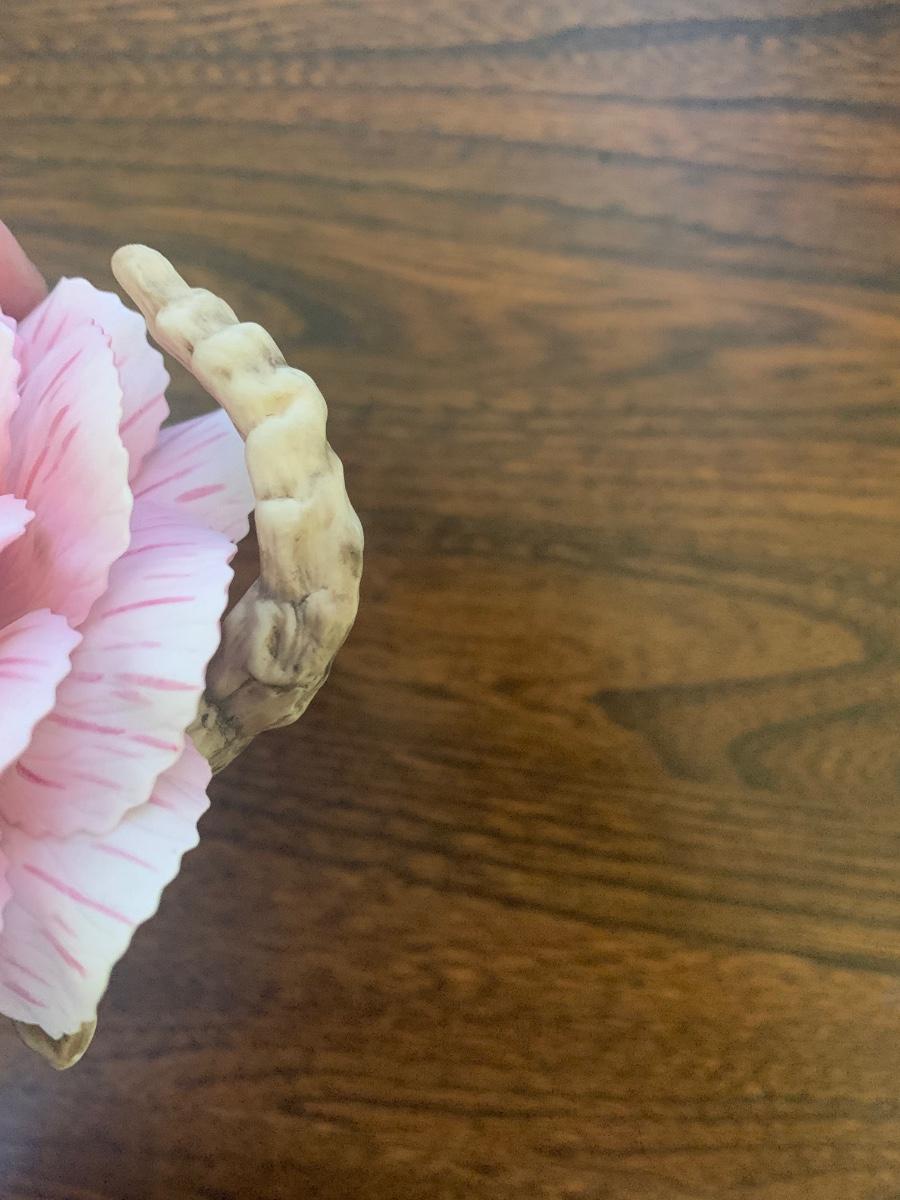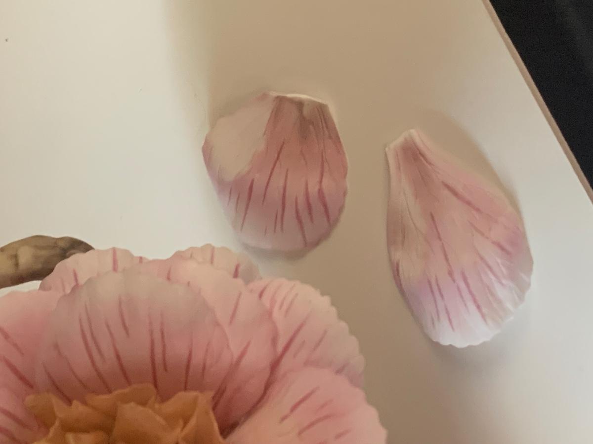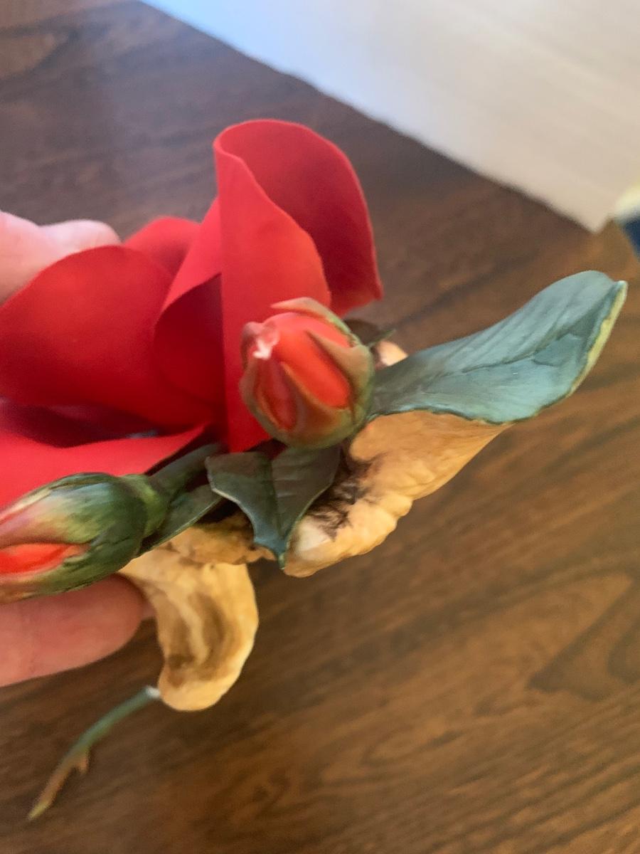 See ALL PHOTOS at the pink one has two petals here but cleanly broken off - rose has stem also with clean break. Since these are extremely rare we figure someone may want to have them repaired since all the pieces are here. Buying as is, as found.