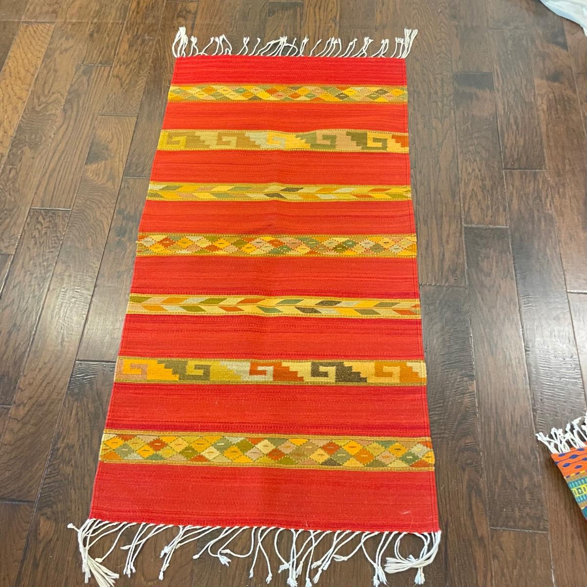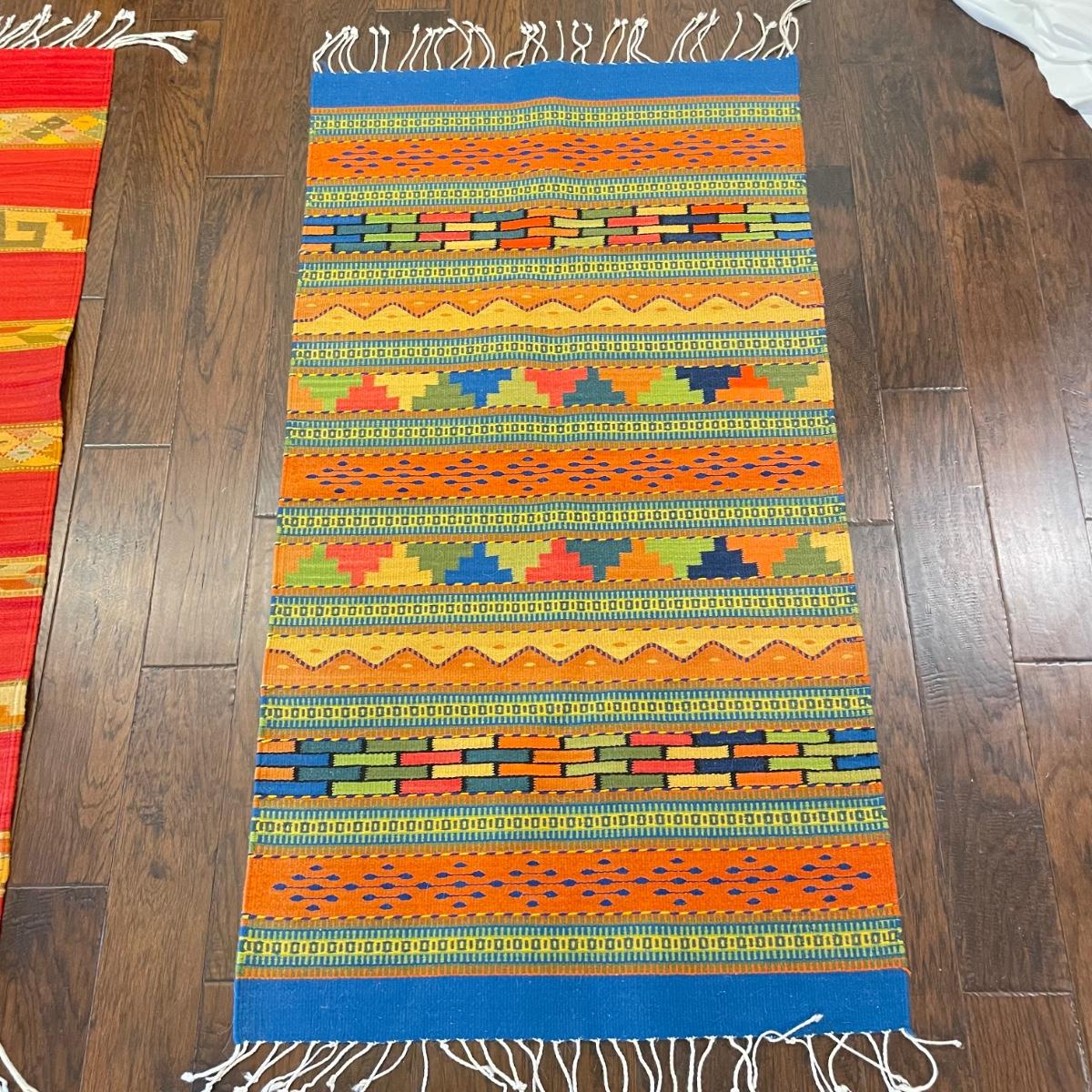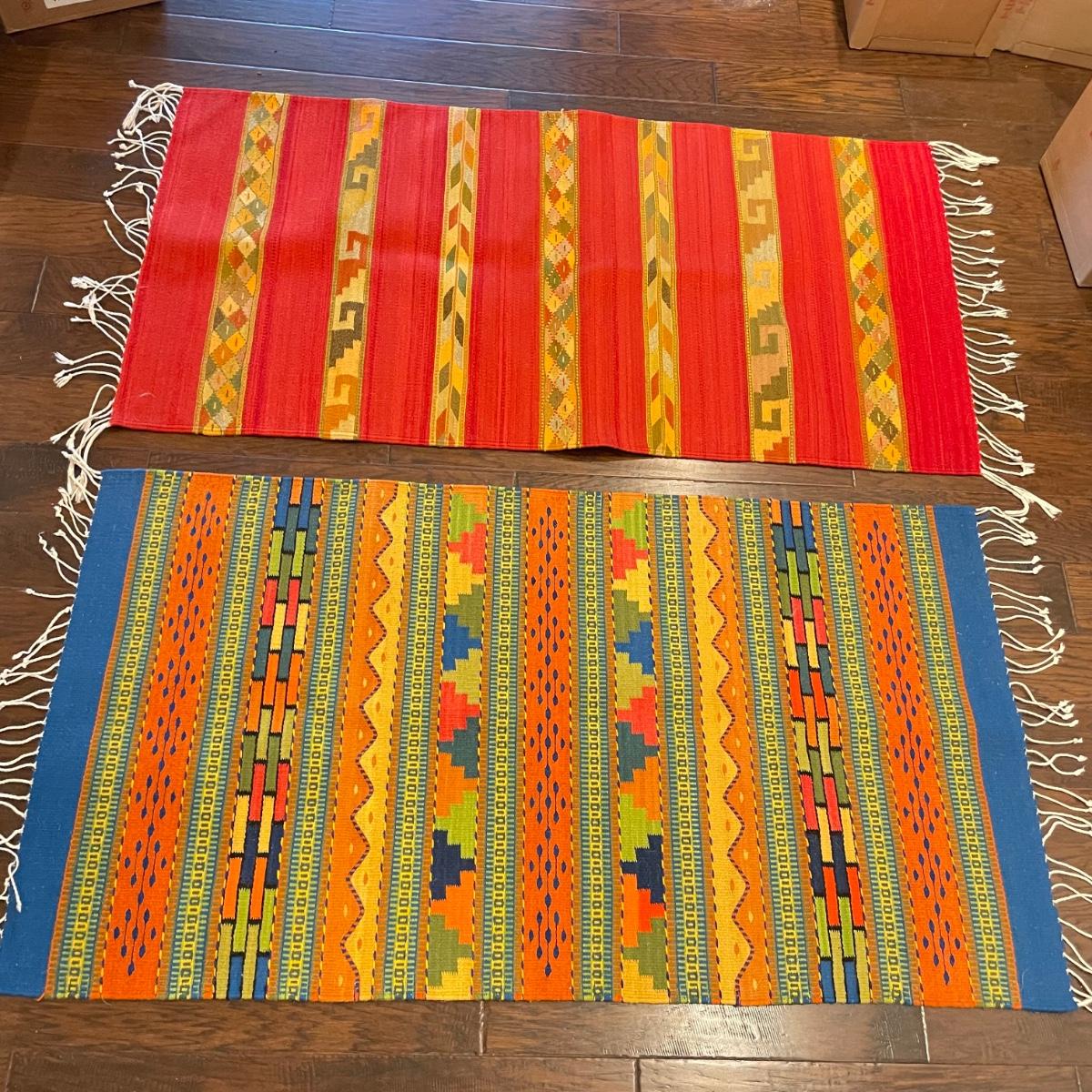 Two bright and bold woven rugs. Both rugs are roughly 30.5" x 59" without the fringe. They look very lightly used, both show white pet hair, mostly only on one side. See images. Shipping available.