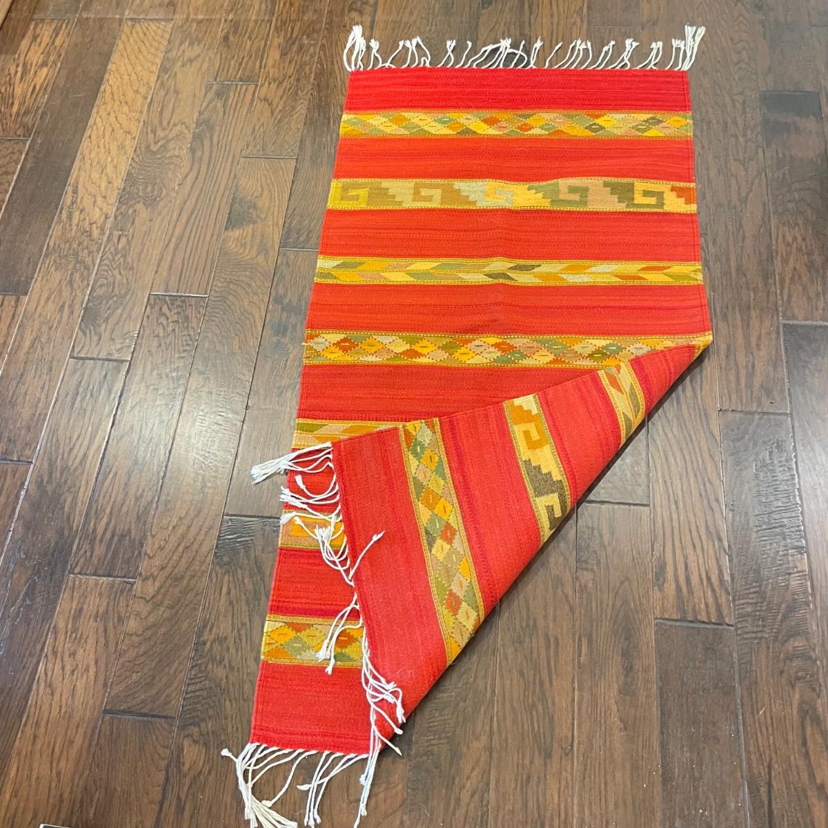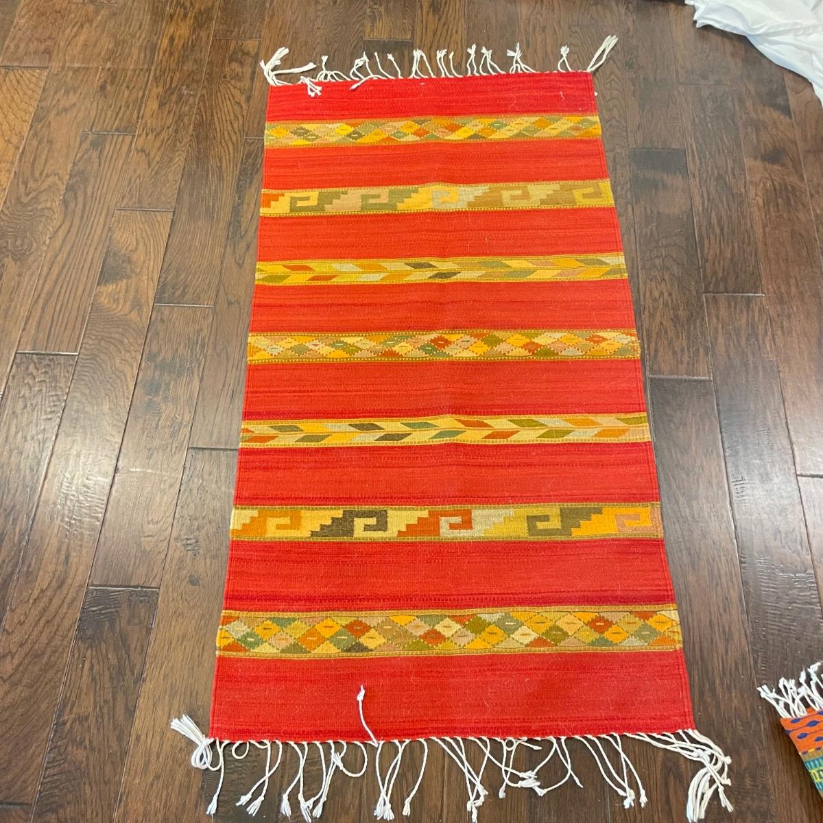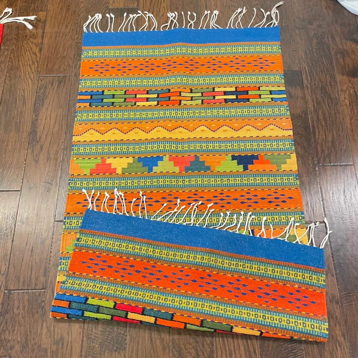 Two bright and bold woven rugs. Both rugs are roughly 30.5" x 59" without the fringe. They look very lightly used, both show white pet hair, mostly only on one side. See images. Shipping available.