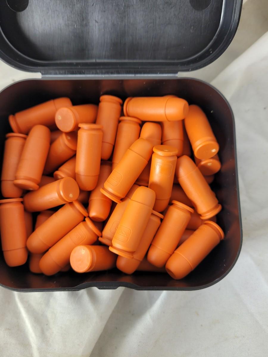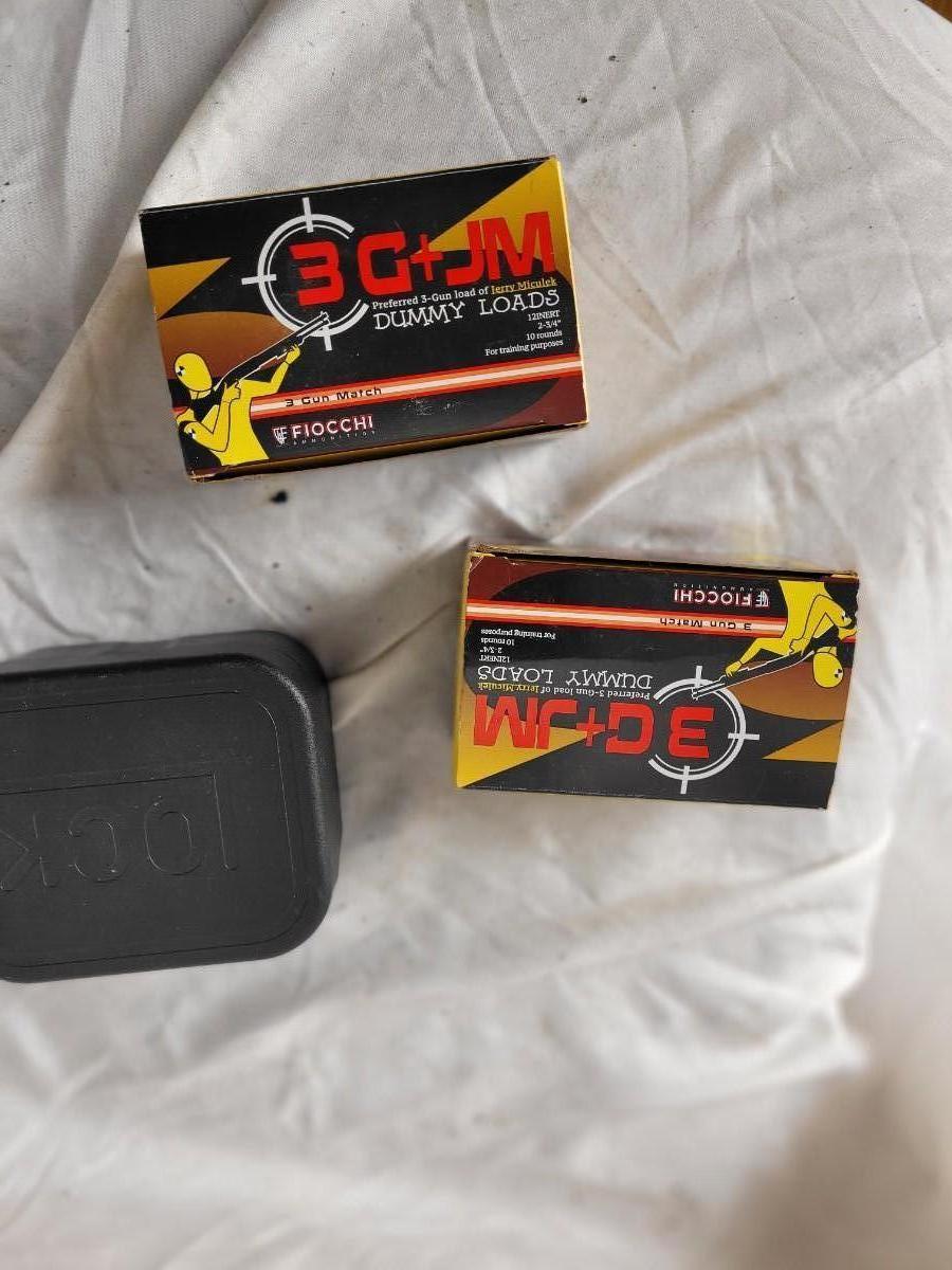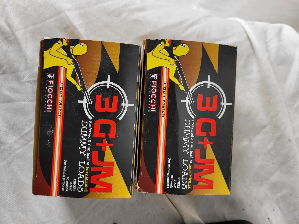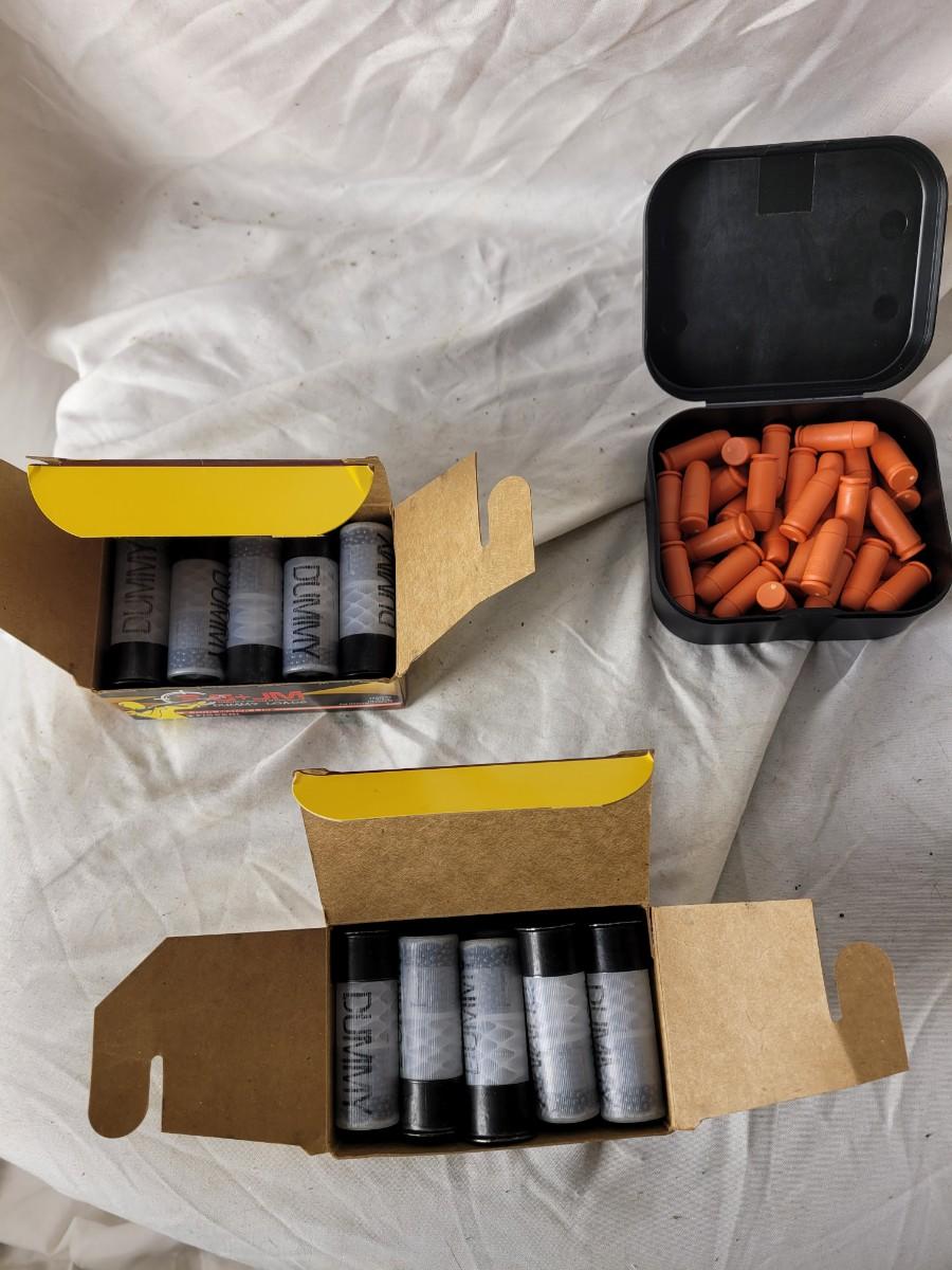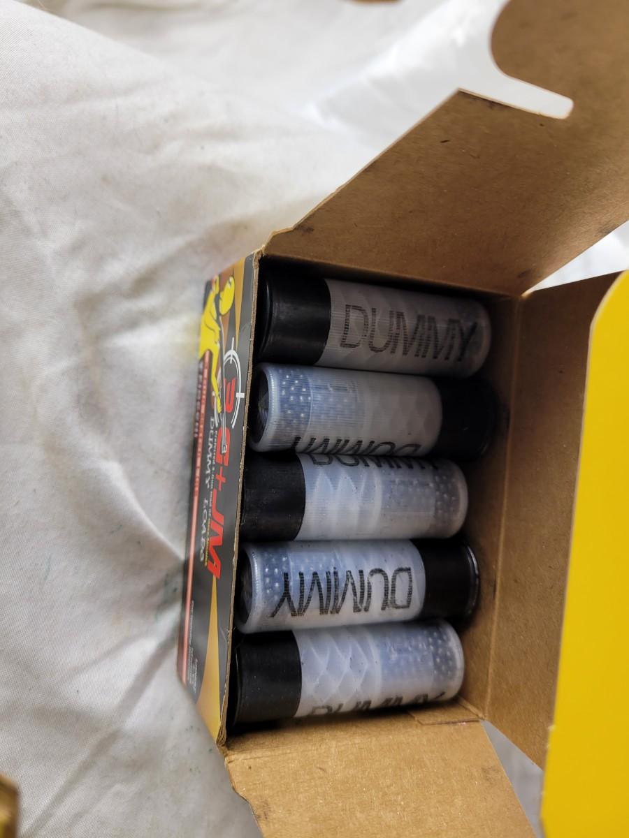 Two boxes of 12 guage dummy loads and another box of plastic bullets