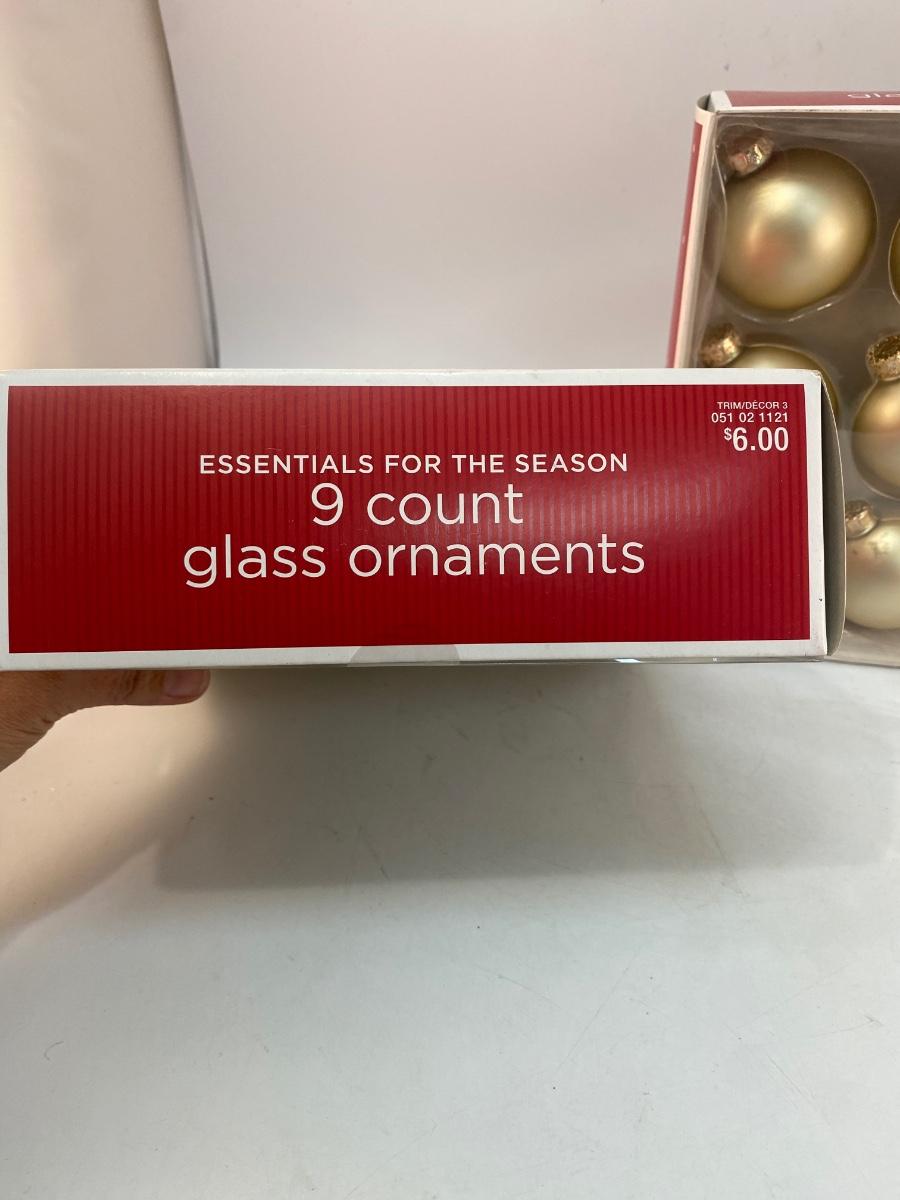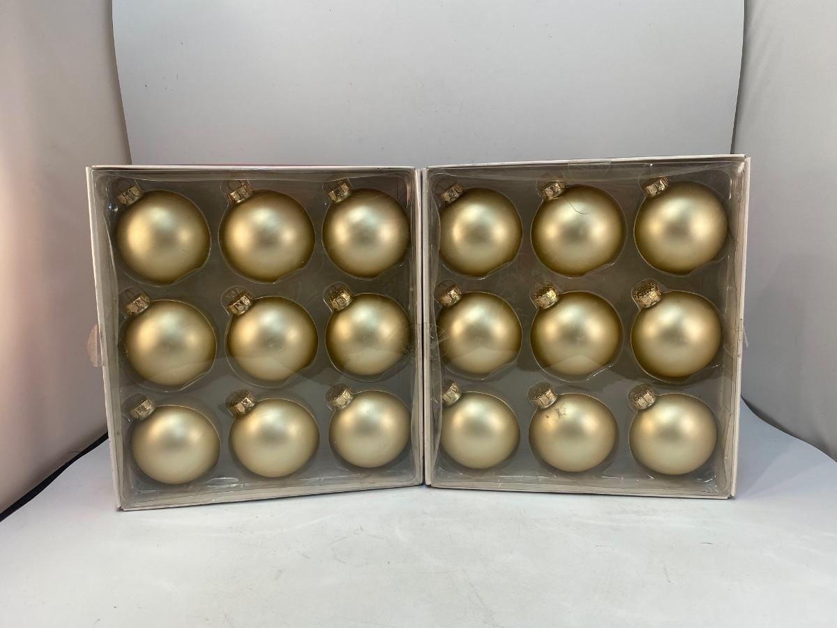 Two Boxes of Gold Matte Satin Finish Glass Christmas Tree Ornaments Balls. 9 per box, 18 total.
