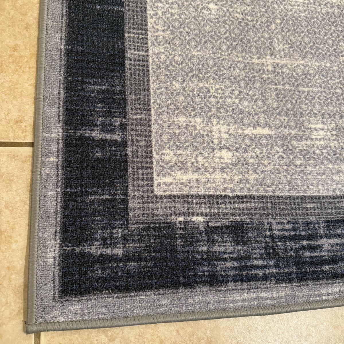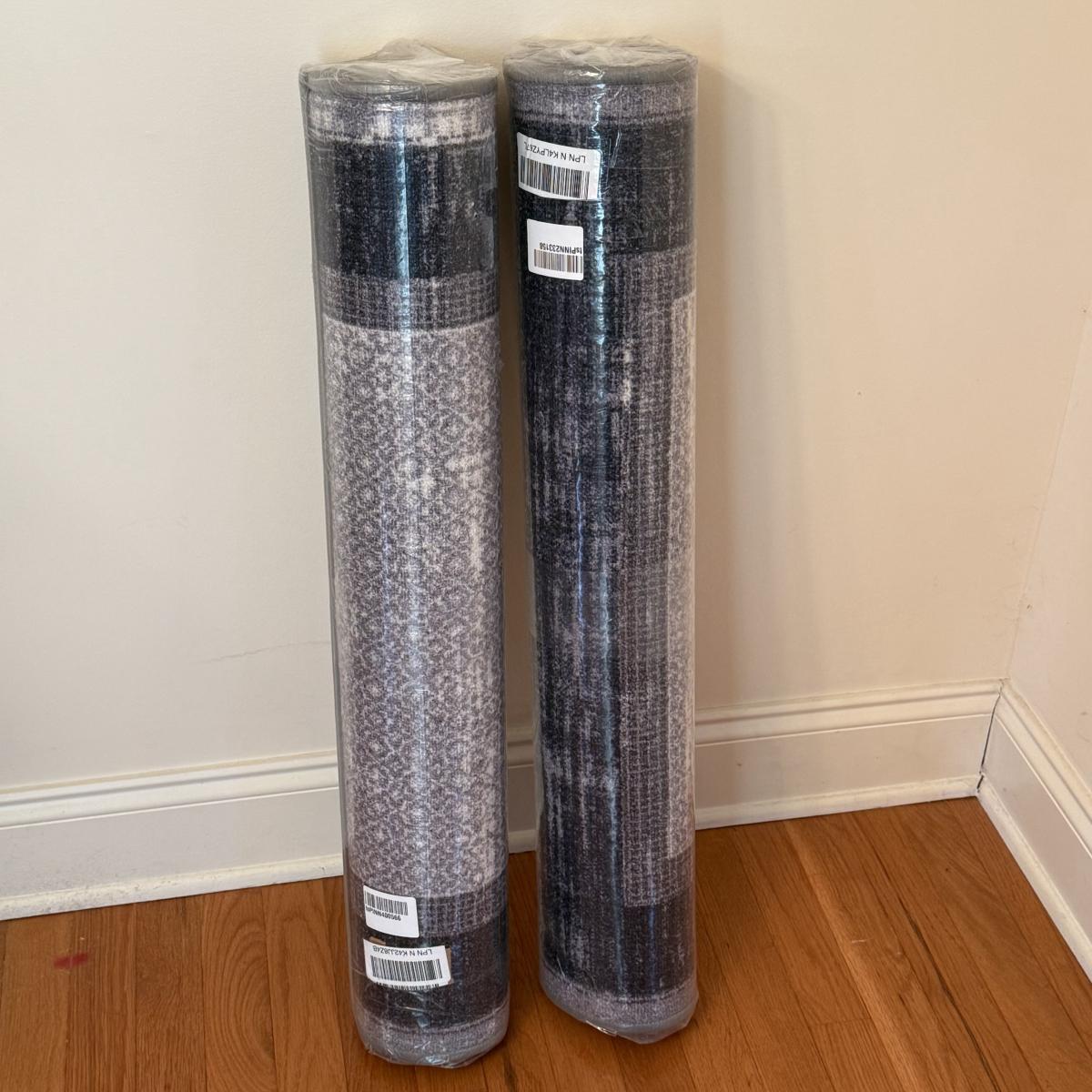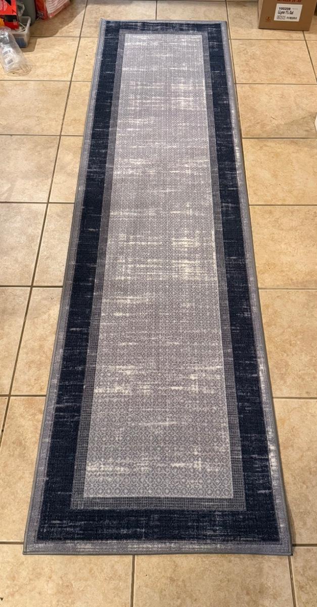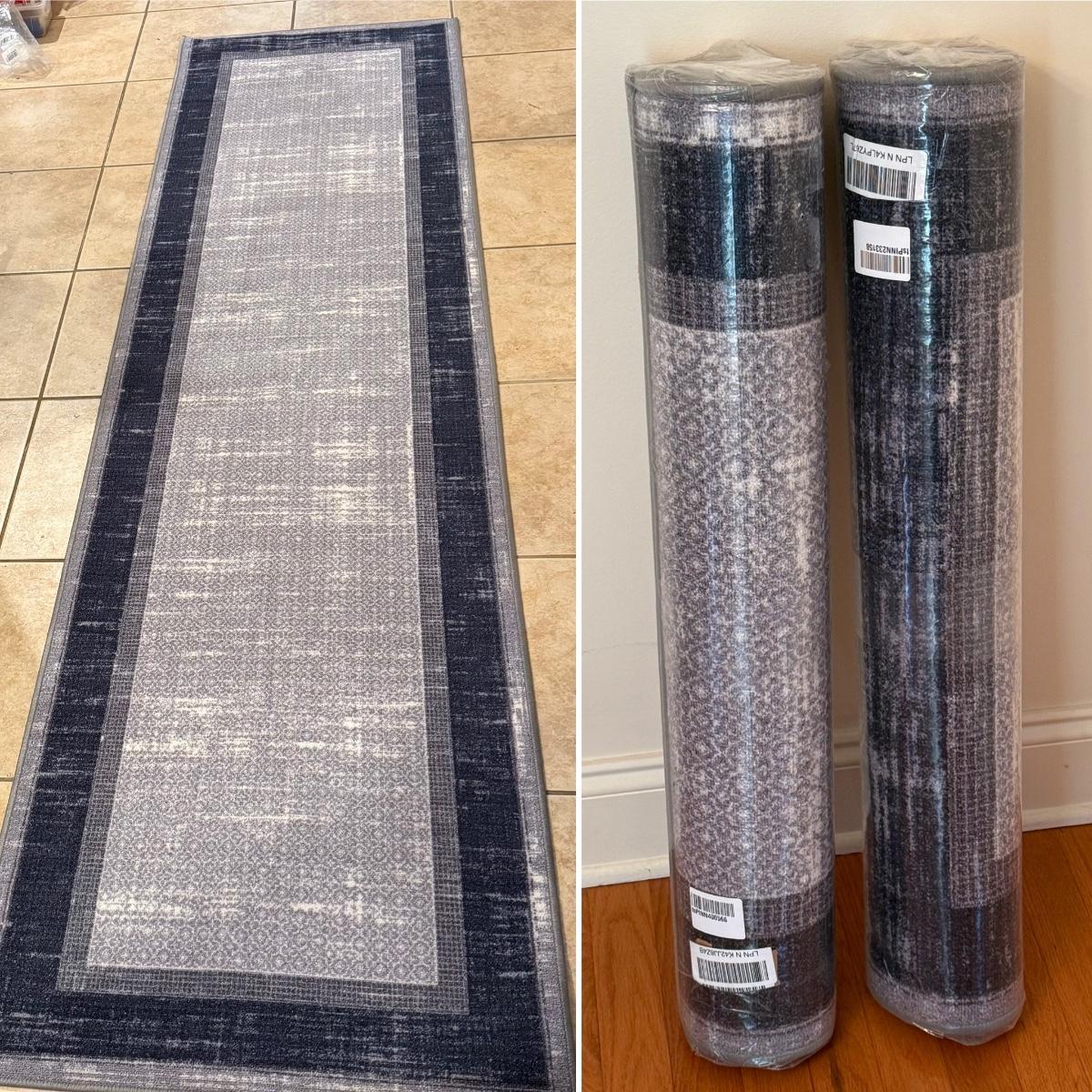 Two Ottomanson Homeline Collection runner rugs, brand new in packaging. We opened one to show the design and get the measurement. They appear to be identical. They are light gray with white and navy blue and measure 31” x 118” (2’7” x 9’10”). They have a rubber backing.