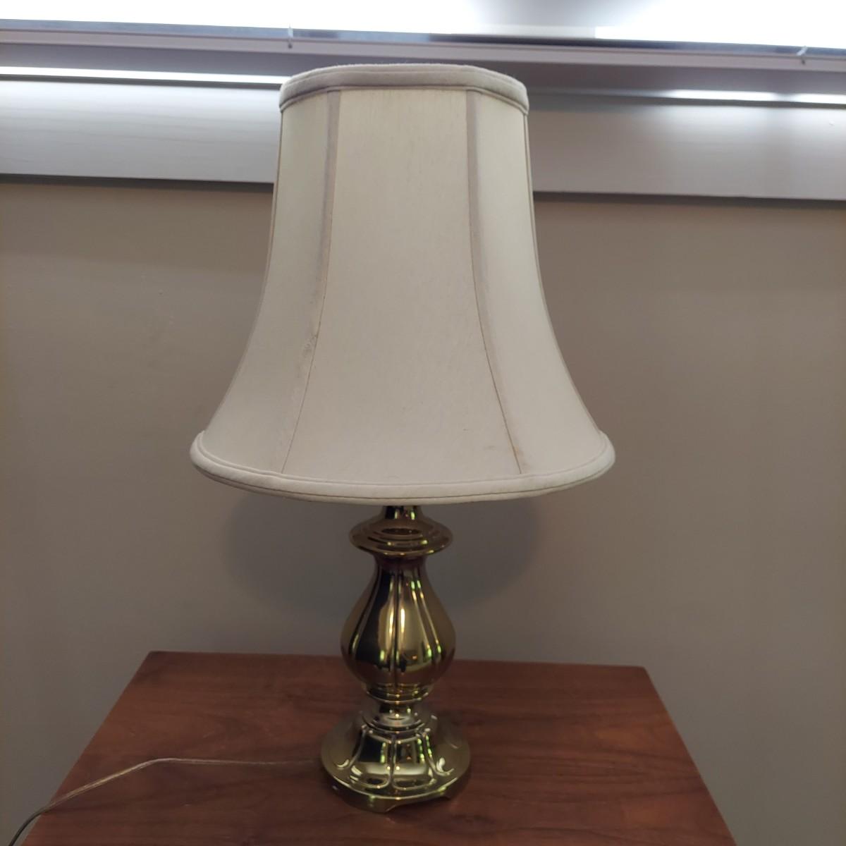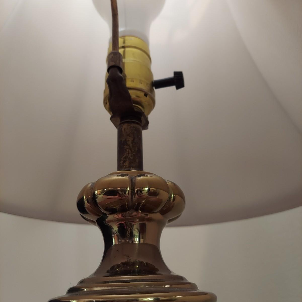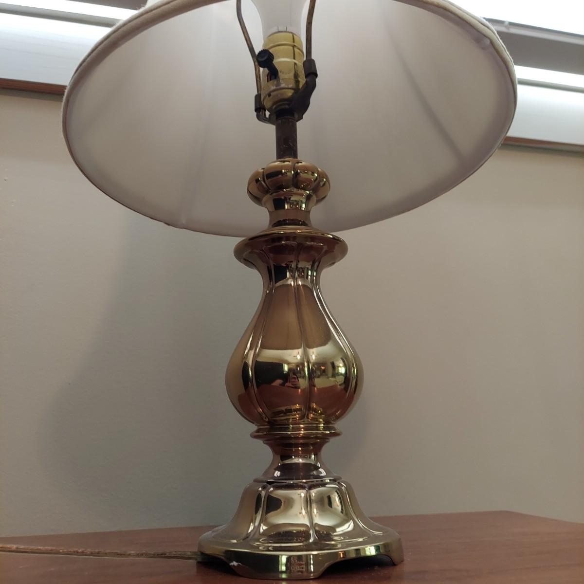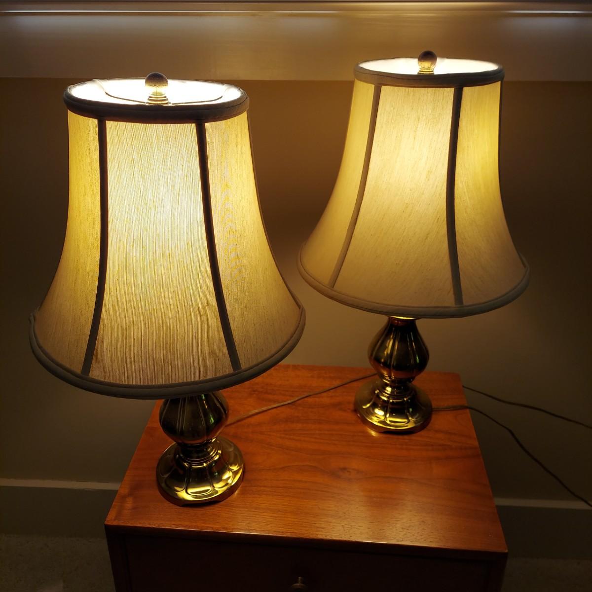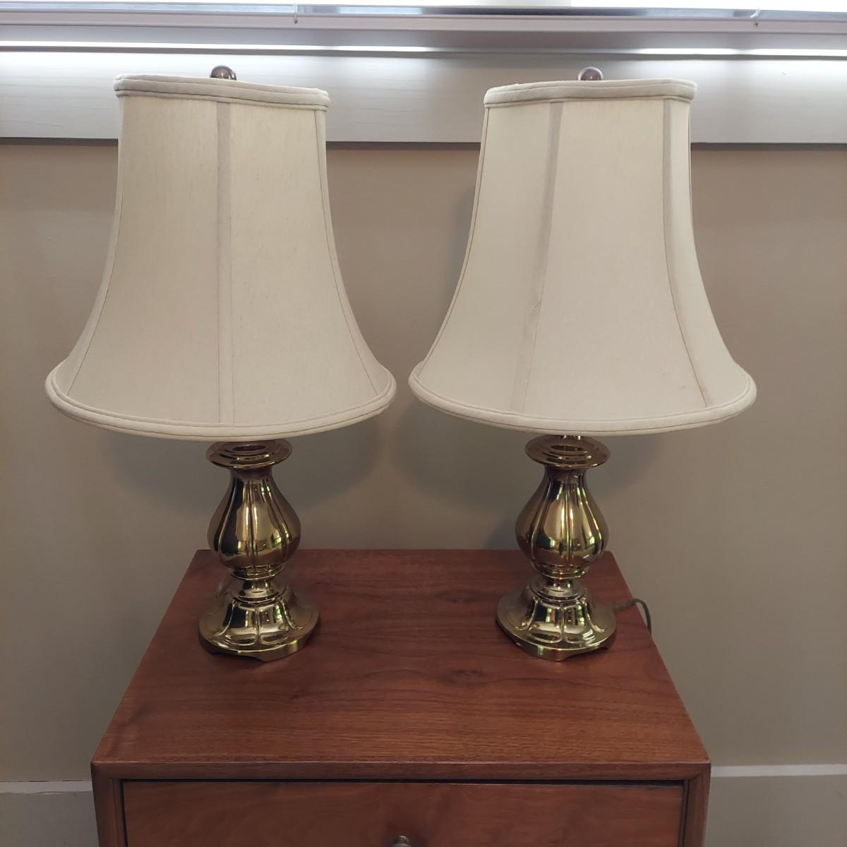 Two metal lamps that appear to be brass. They're very heavy. They click three times for different brightness. They plugged in and powered on. The base has 5" diameter and the lamp shade has 12" diameter. They're approximately 22" tall. Local Pickup Only.