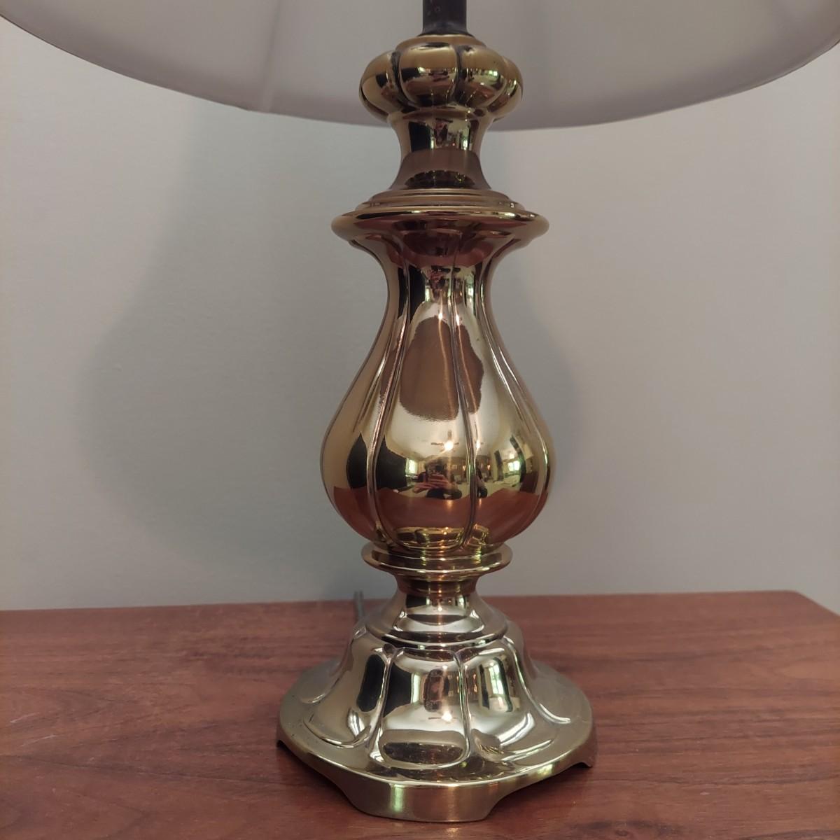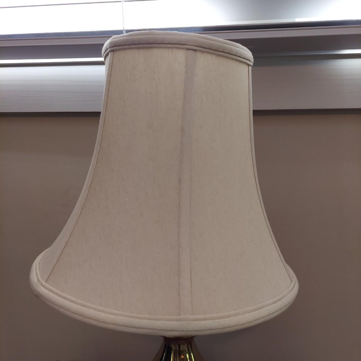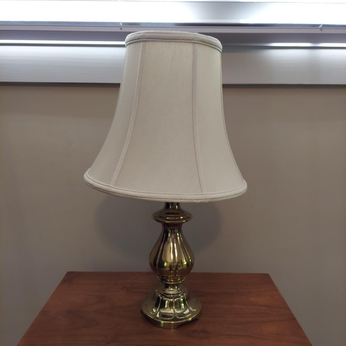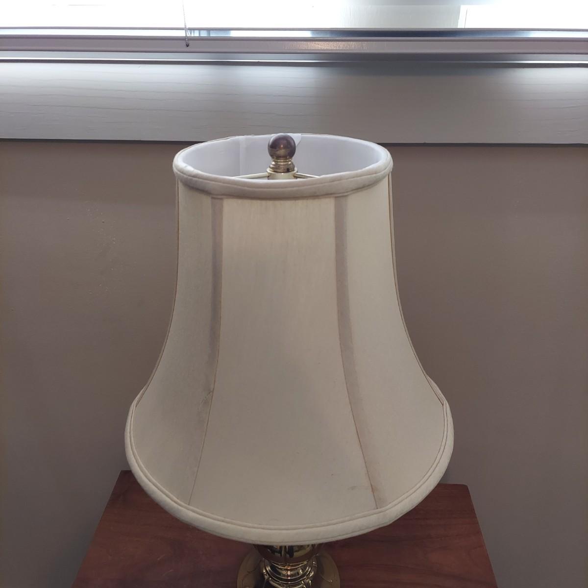 Two metal lamps that appear to be brass. They're very heavy. They click three times for different brightness. They plugged in and powered on. The base has 5" diameter and the lamp shade has 12" diameter. They're approximately 22" tall. Local Pickup Only.