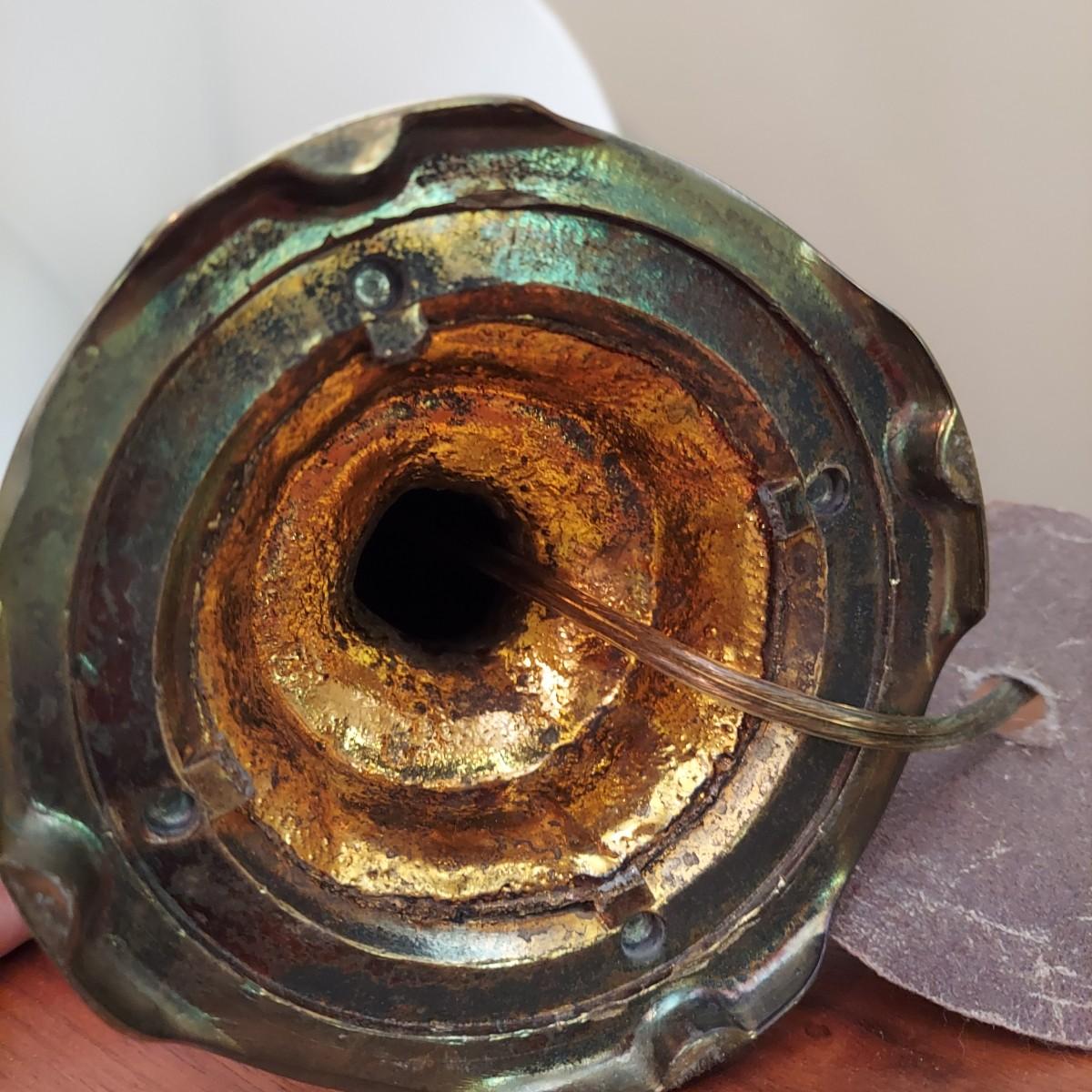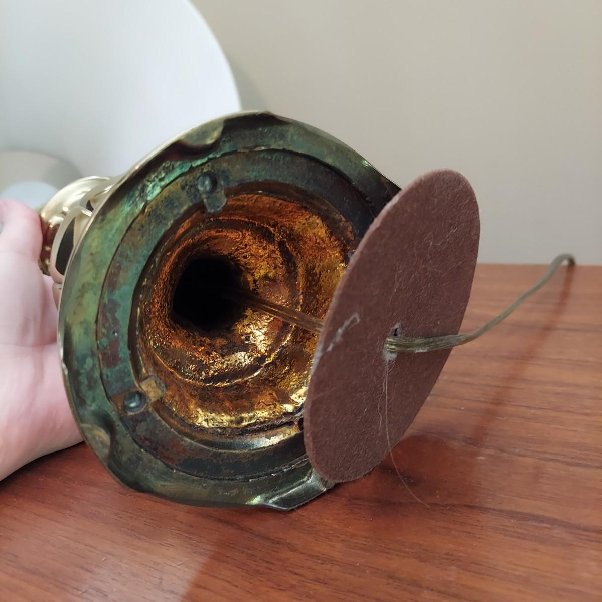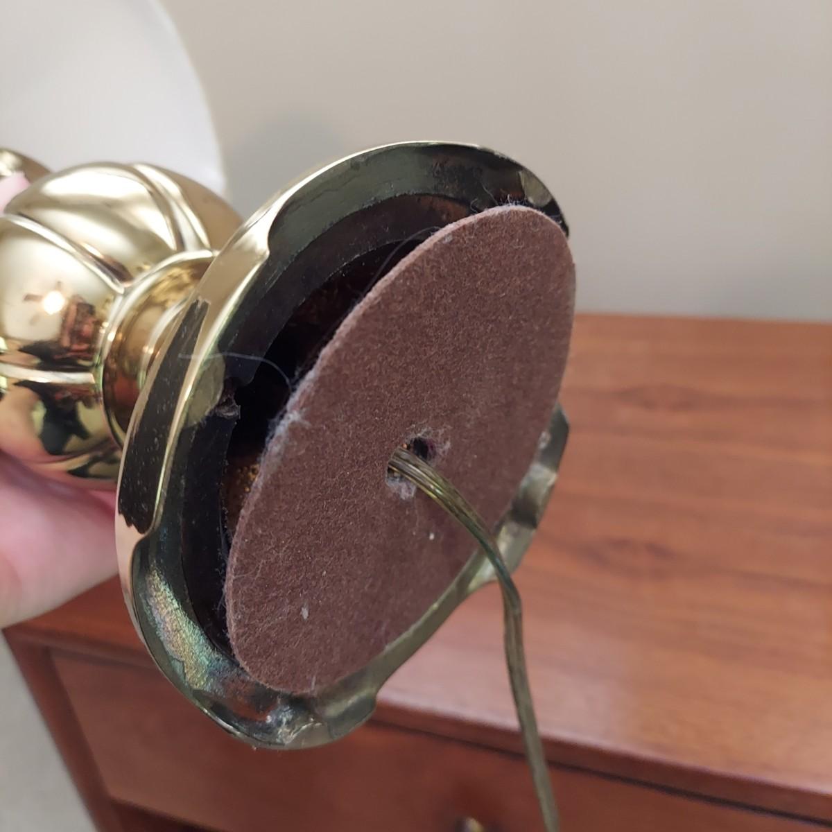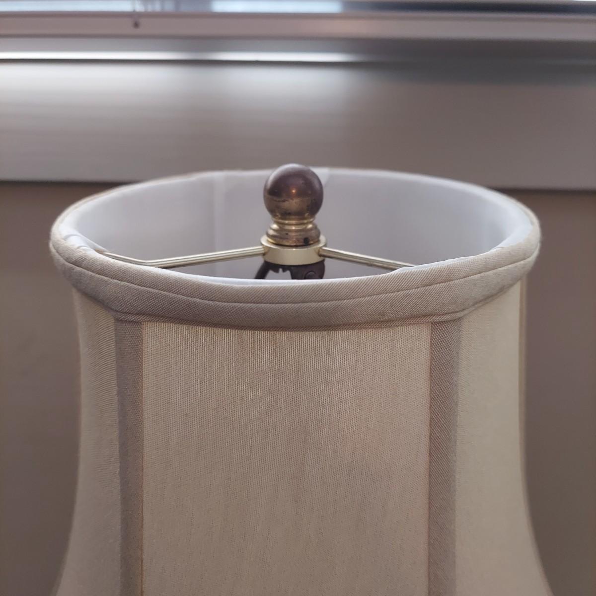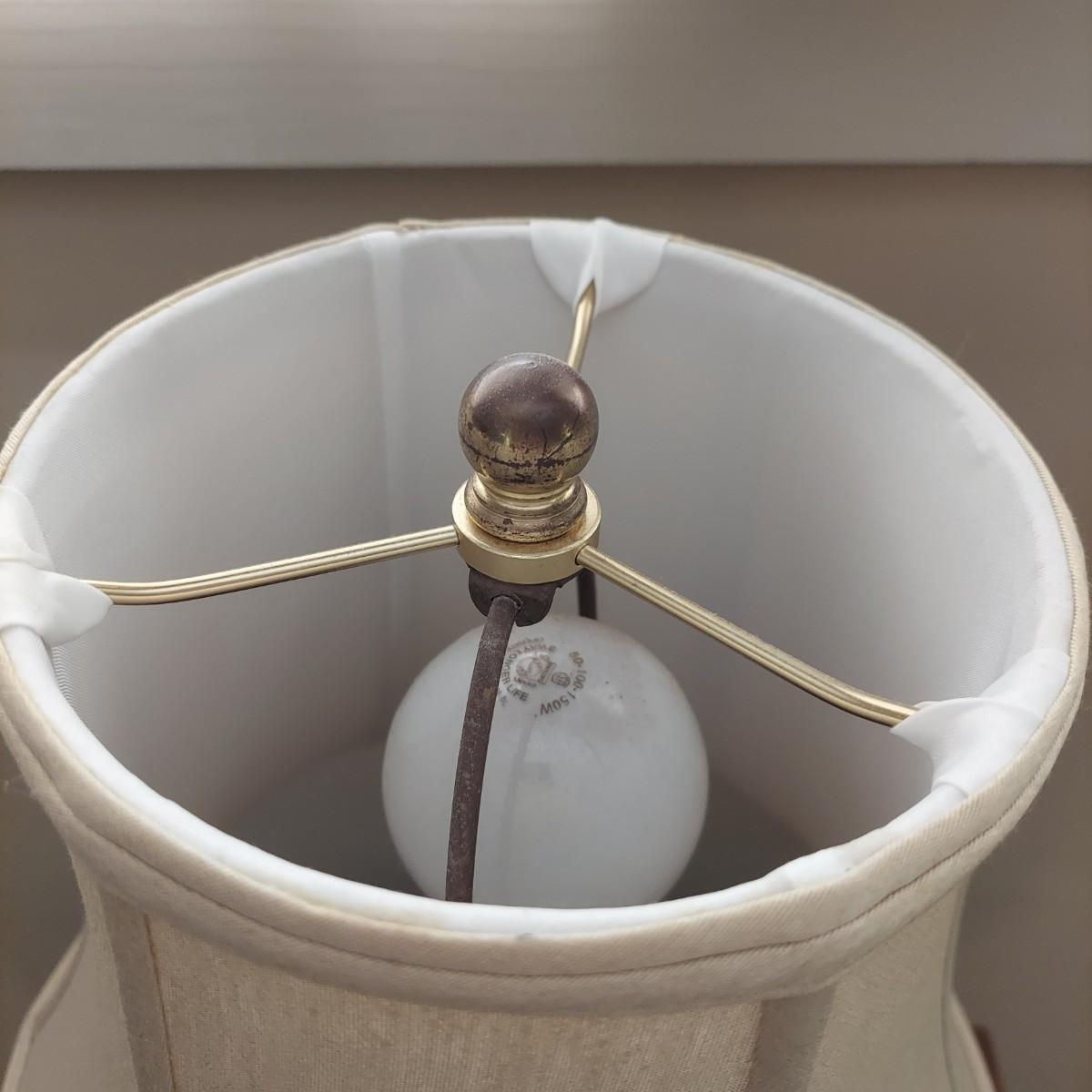 Two metal lamps that appear to be brass. They're very heavy. They click three times for different brightness. They plugged in and powered on. The base has 5" diameter and the lamp shade has 12" diameter. They're approximately 22" tall. Local Pickup Only.