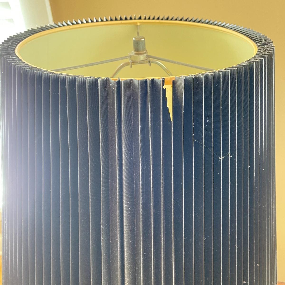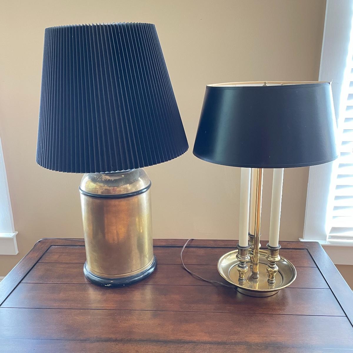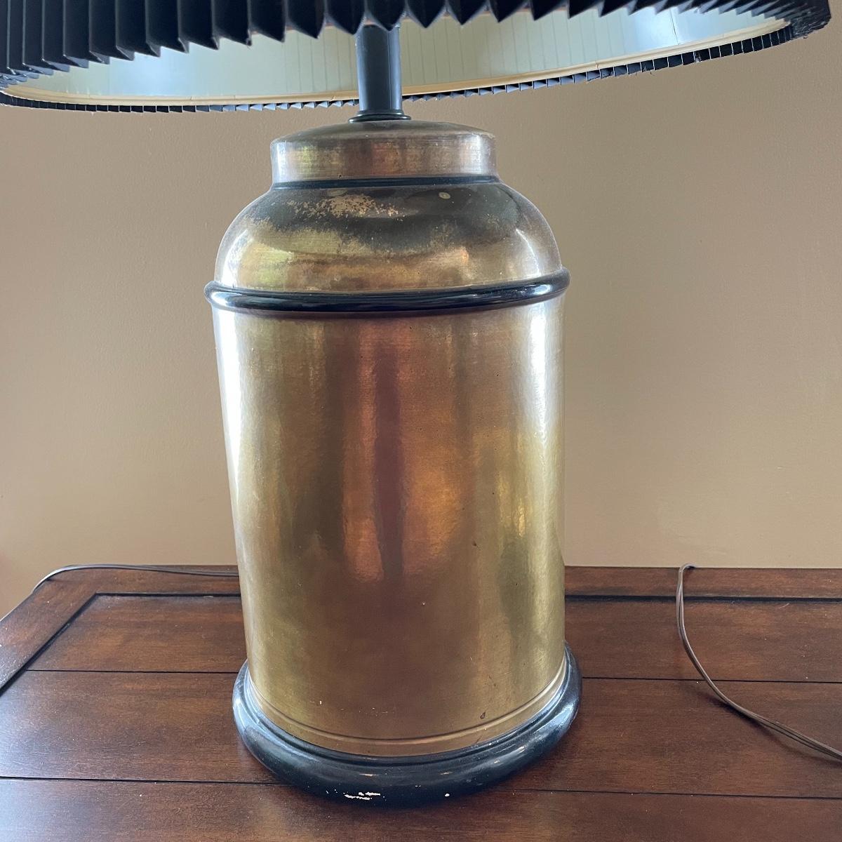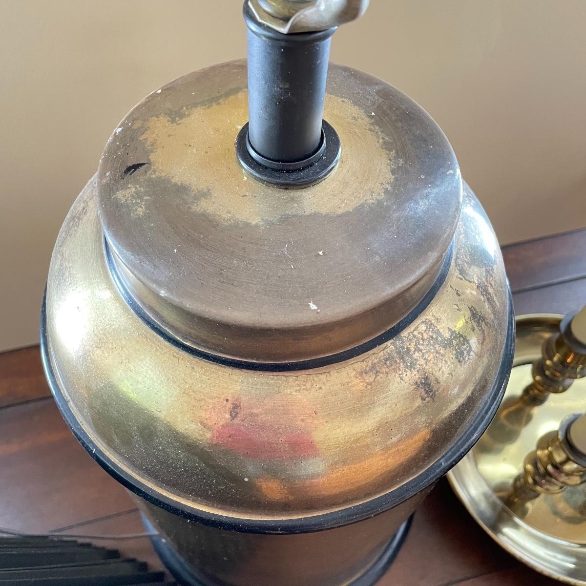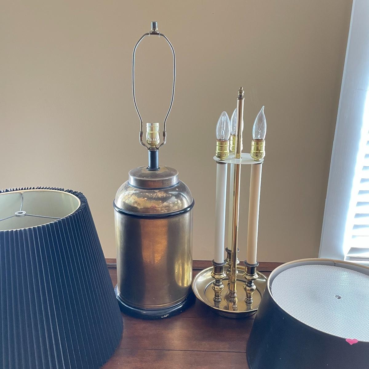 Large cylinder brass lamp with 3-way switch measures 9”d x 30”. This one is photographed with a black paper accordion shade. The next lamp has a brass base with three candle-like pillars and a 3-way switch. One pillar is a darker ivory than the other two. This lamp is 23” tall with a black paper shade and a removable top white metal shade. Local pick up only.