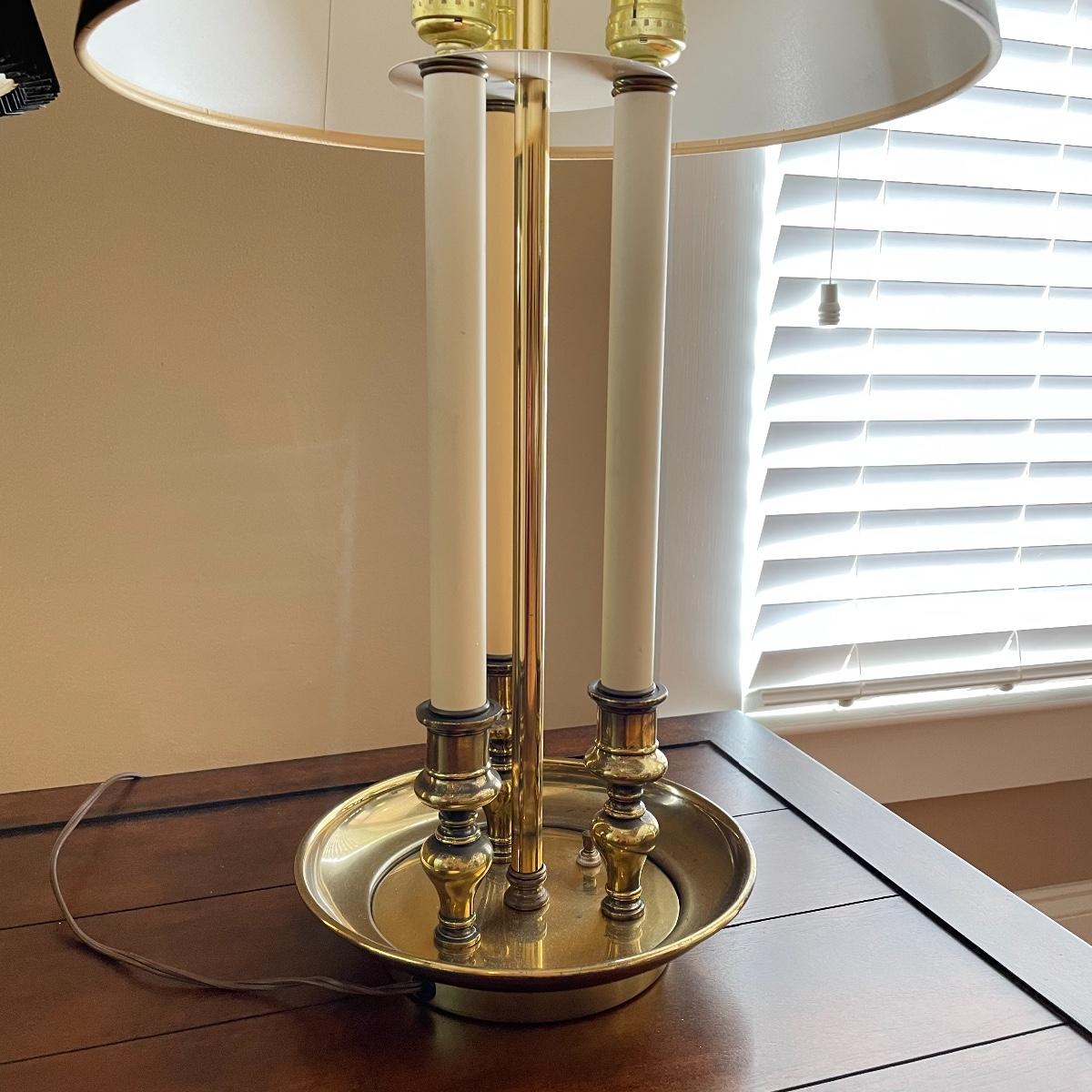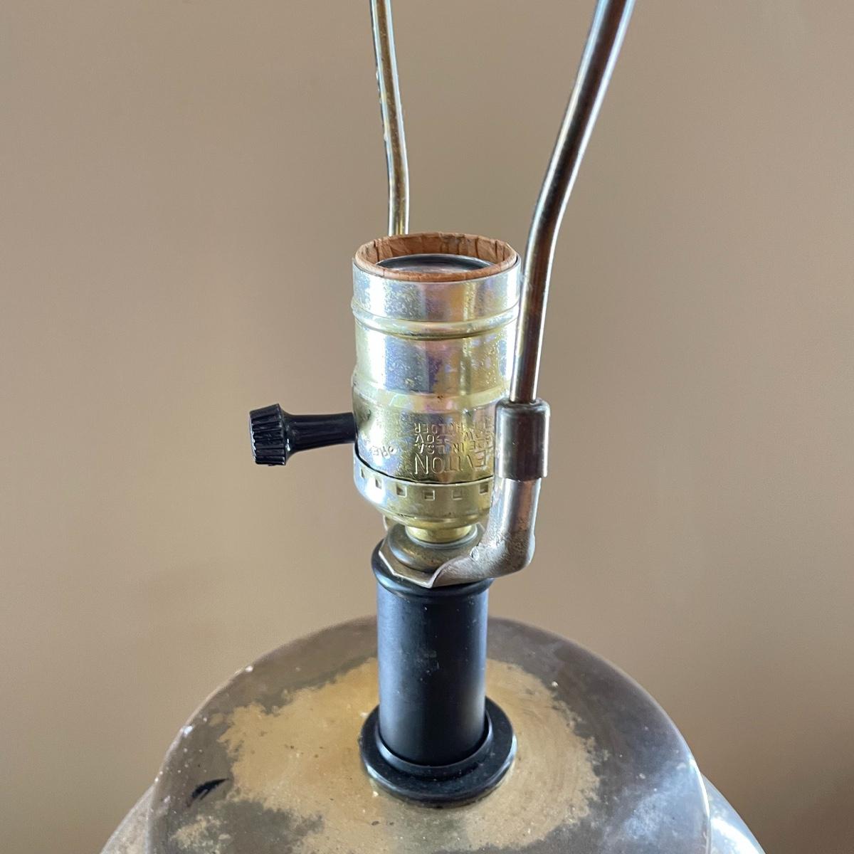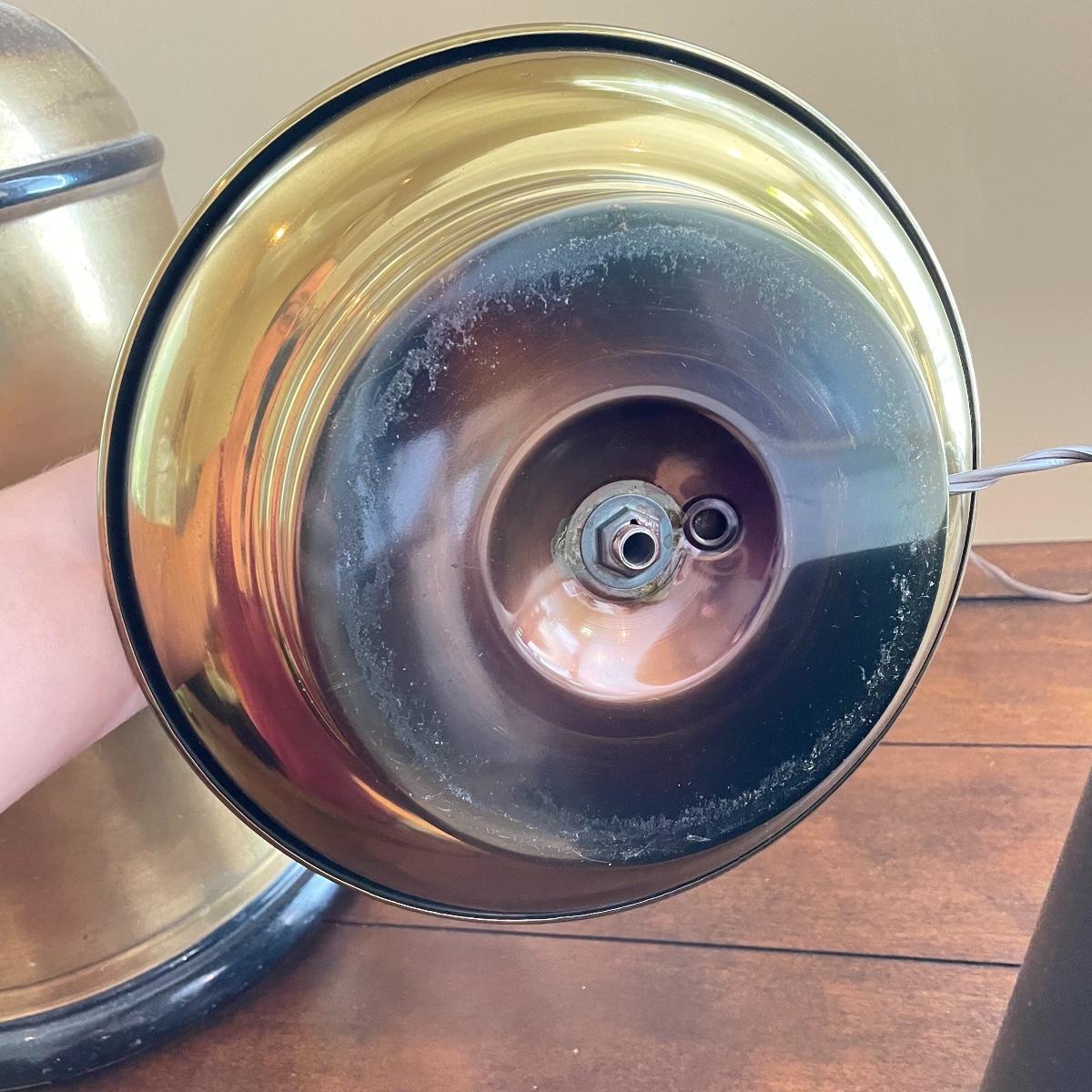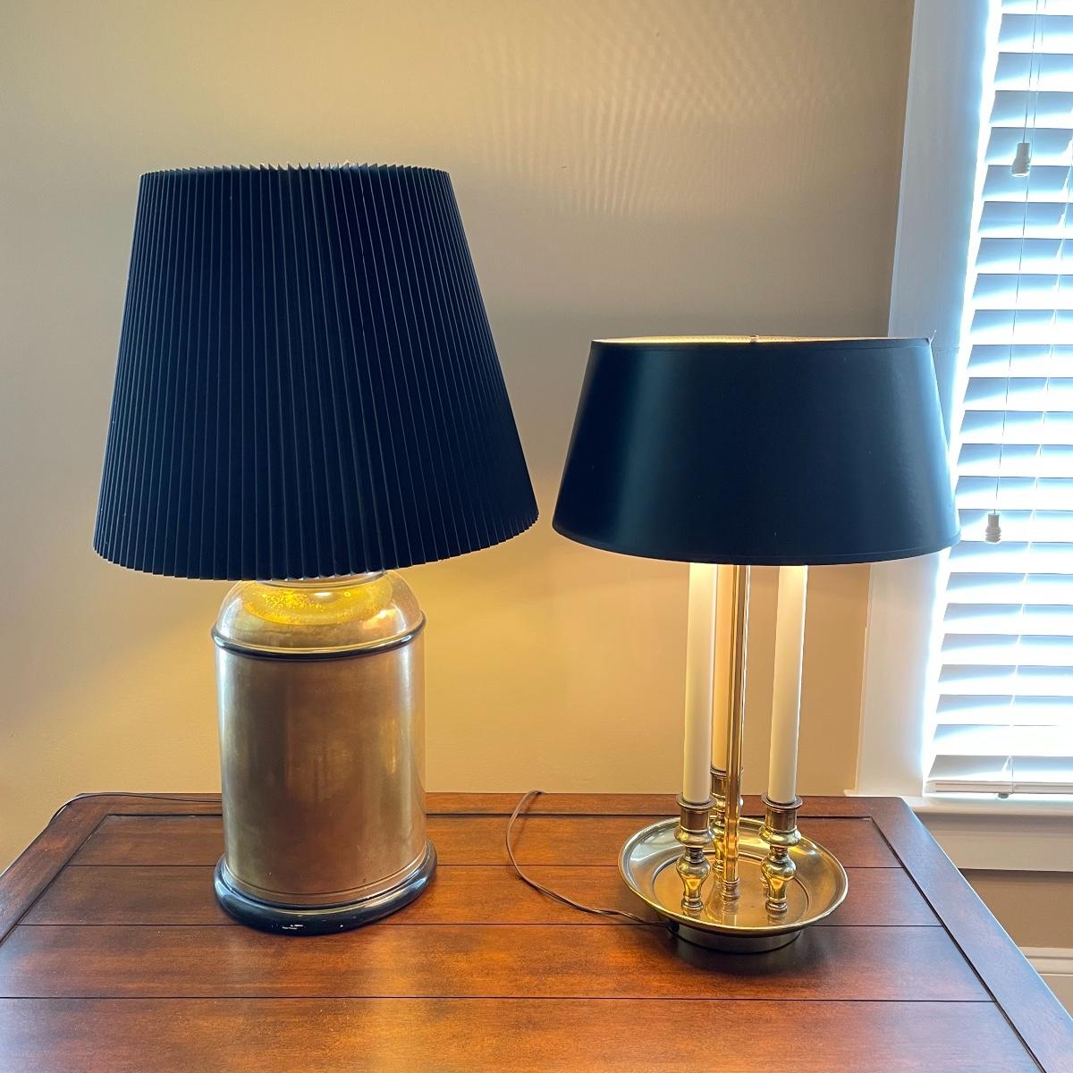 Large cylinder brass lamp with 3-way switch measures 9”d x 30”. This one is photographed with a black paper accordion shade. The next lamp has a brass base with three candle-like pillars and a 3-way switch. One pillar is a darker ivory than the other two. This lamp is 23” tall with a black paper shade and a removable top white metal shade. Local pick up only.