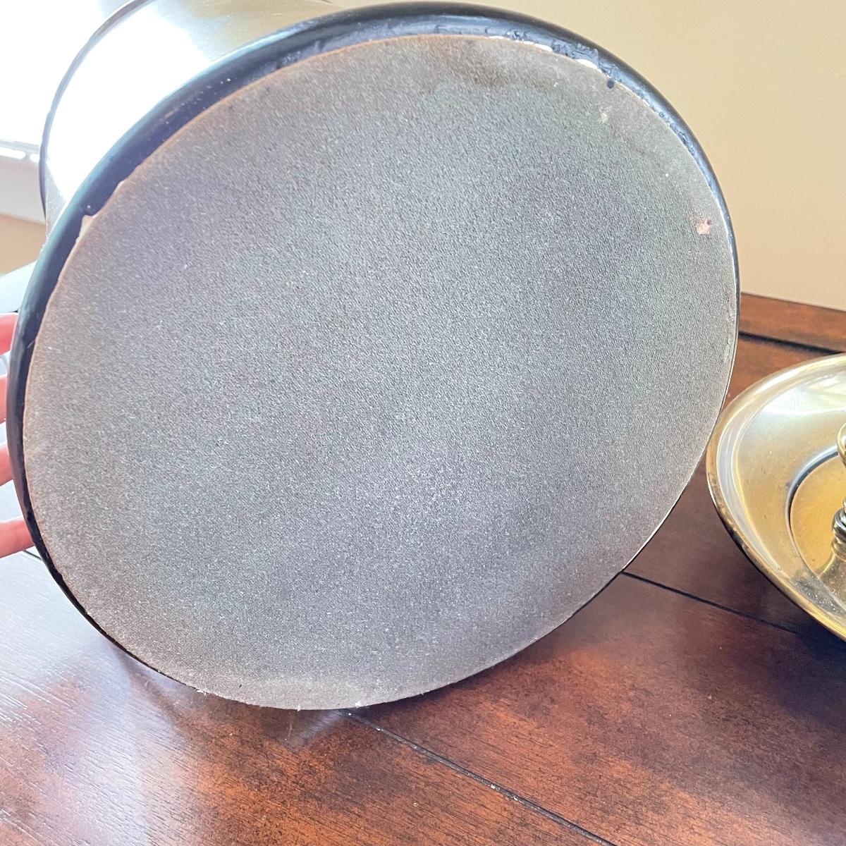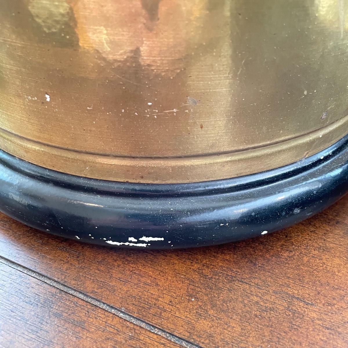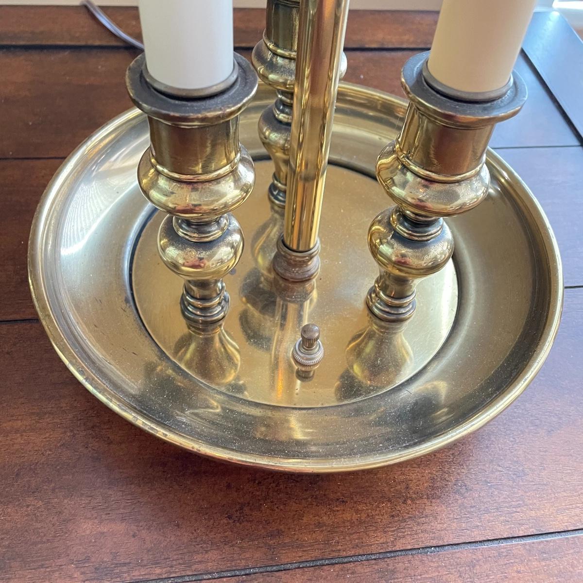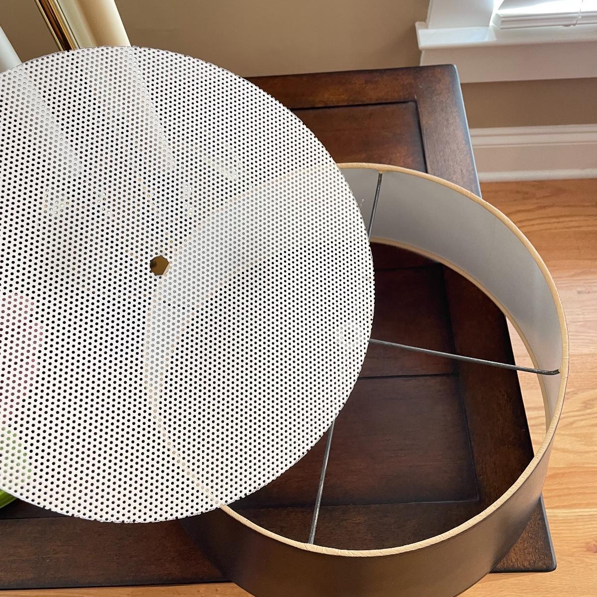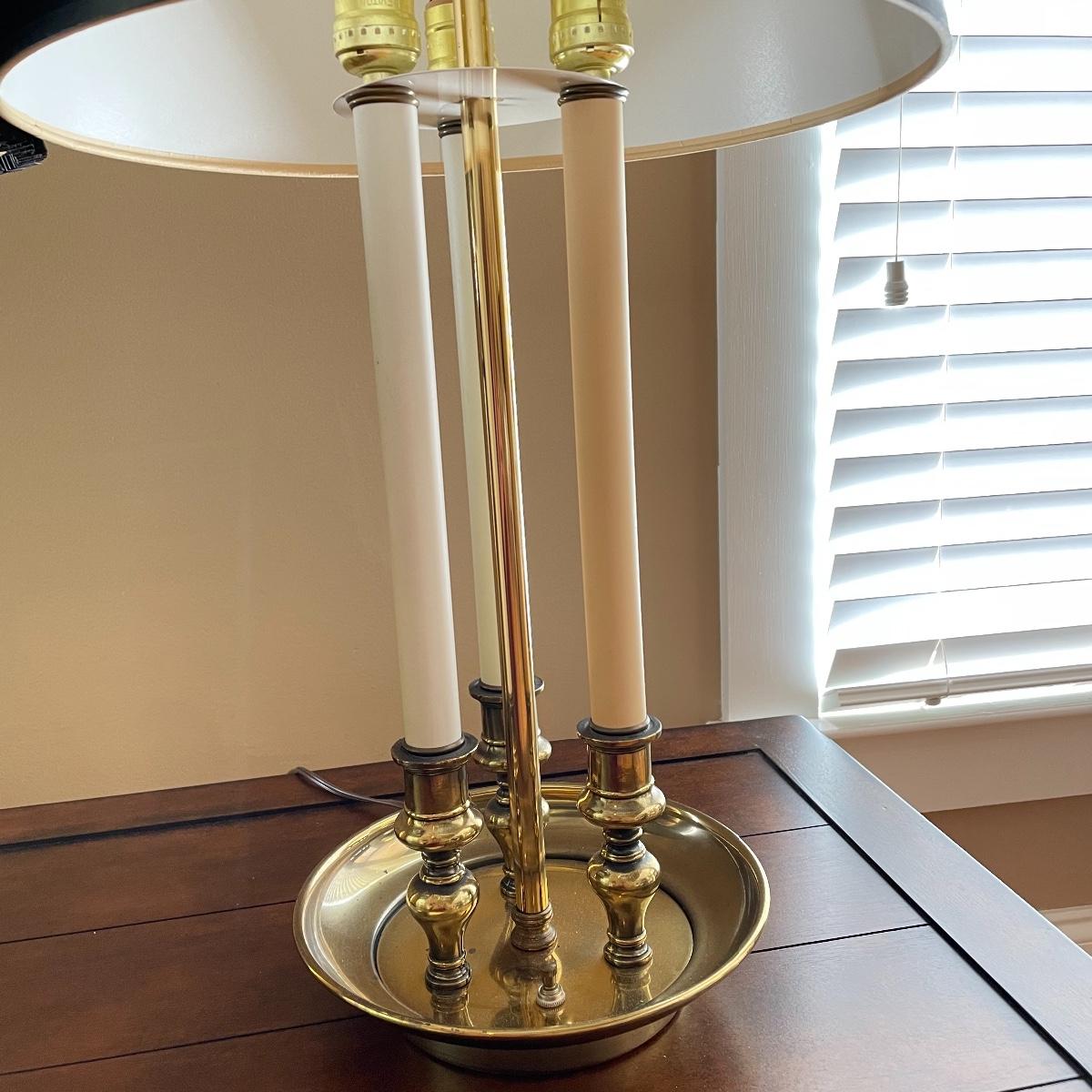 Large cylinder brass lamp with 3-way switch measures 9”d x 30”. This one is photographed with a black paper accordion shade. The next lamp has a brass base with three candle-like pillars and a 3-way switch. One pillar is a darker ivory than the other two. This lamp is 23” tall with a black paper shade and a removable top white metal shade. Local pick up only.