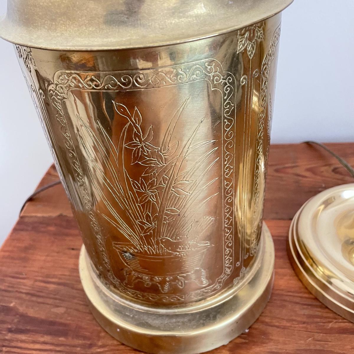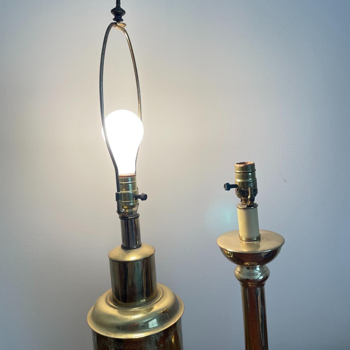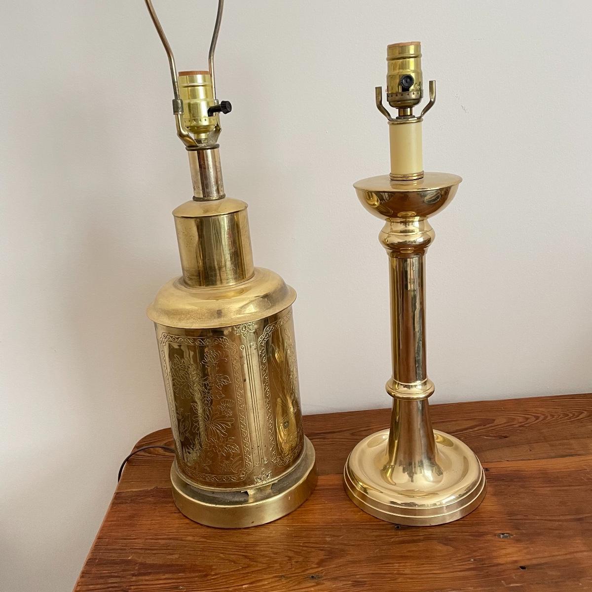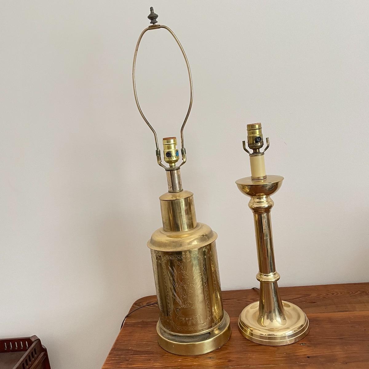 East Asian style brass lamp is 29” to the top of the finial. Both lamps worked and are 19” to the top of the socket. The thinner lamp is substantially heavier. Local pick up only.