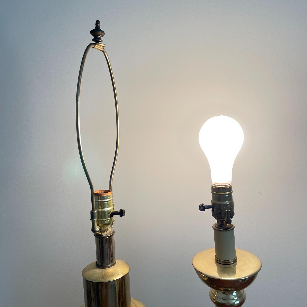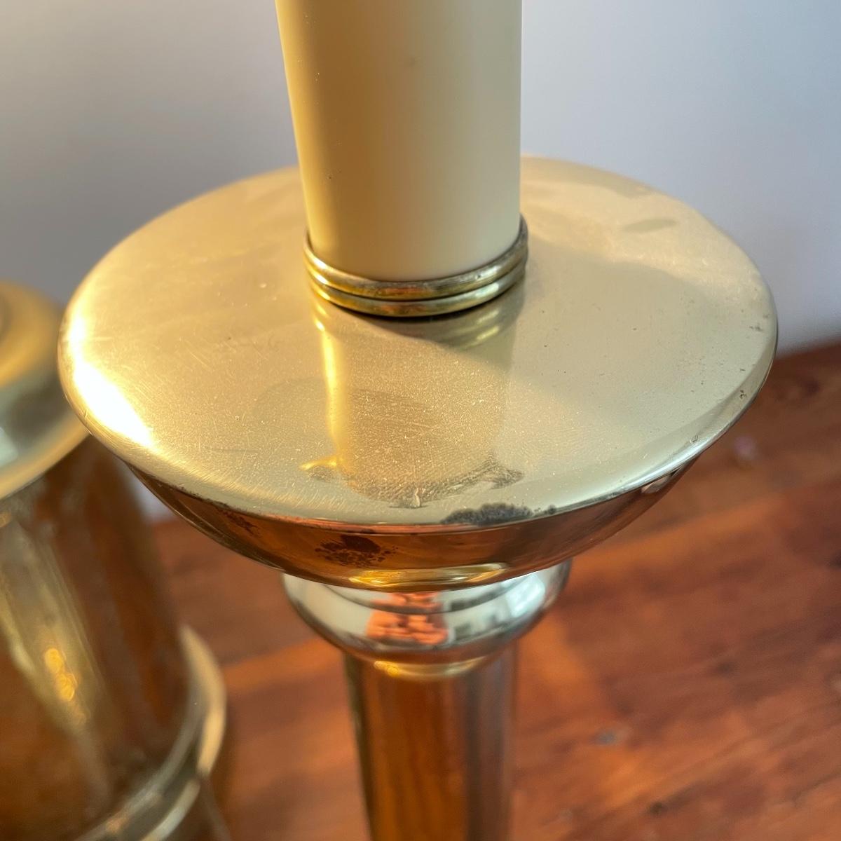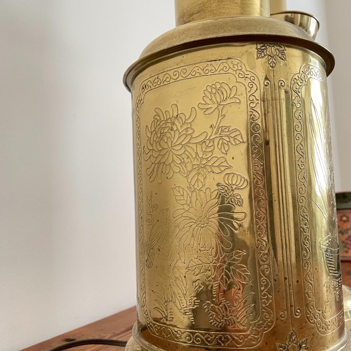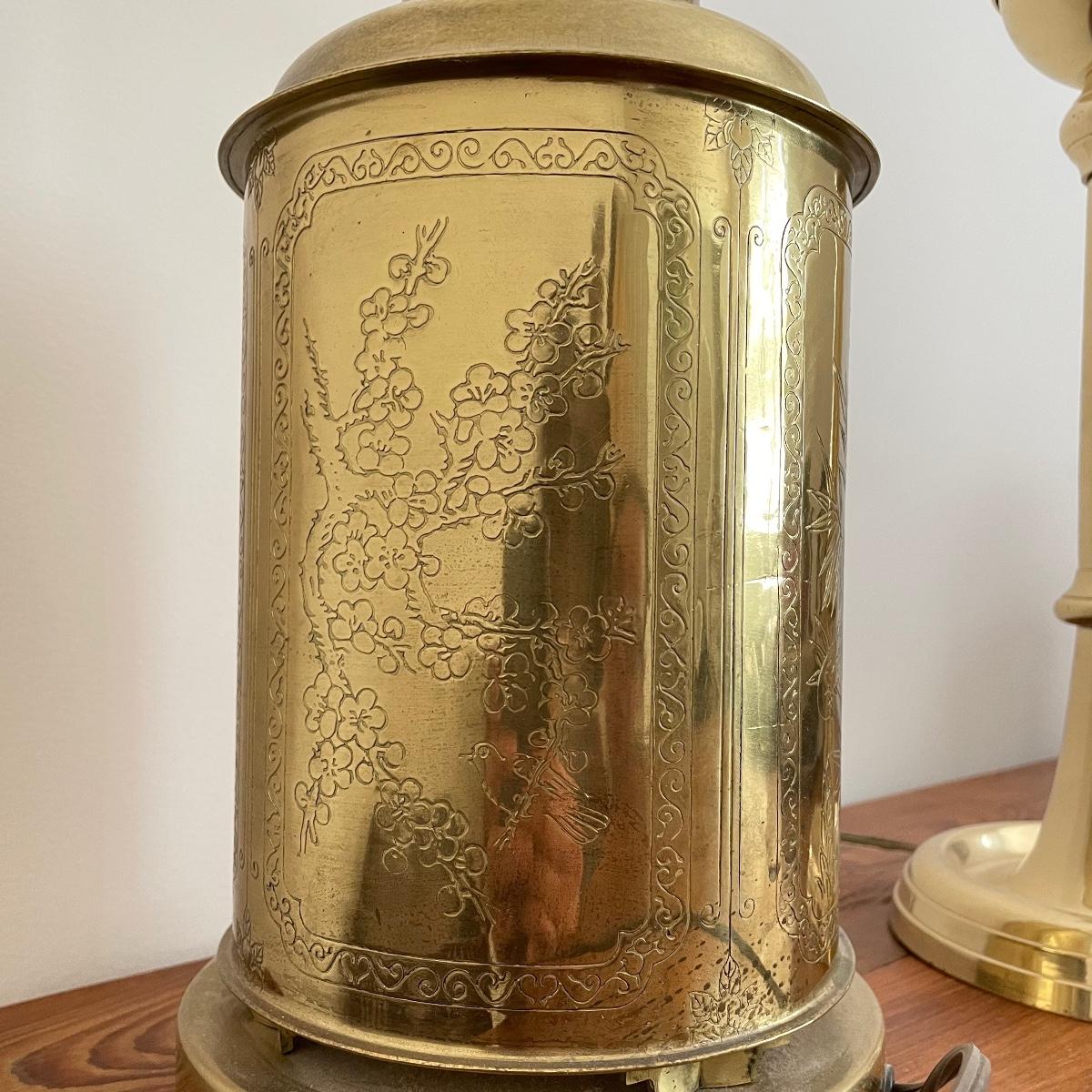 East Asian style brass lamp is 29” to the top of the finial. Both lamps worked and are 19” to the top of the socket. The thinner lamp is substantially heavier. Local pick up only.