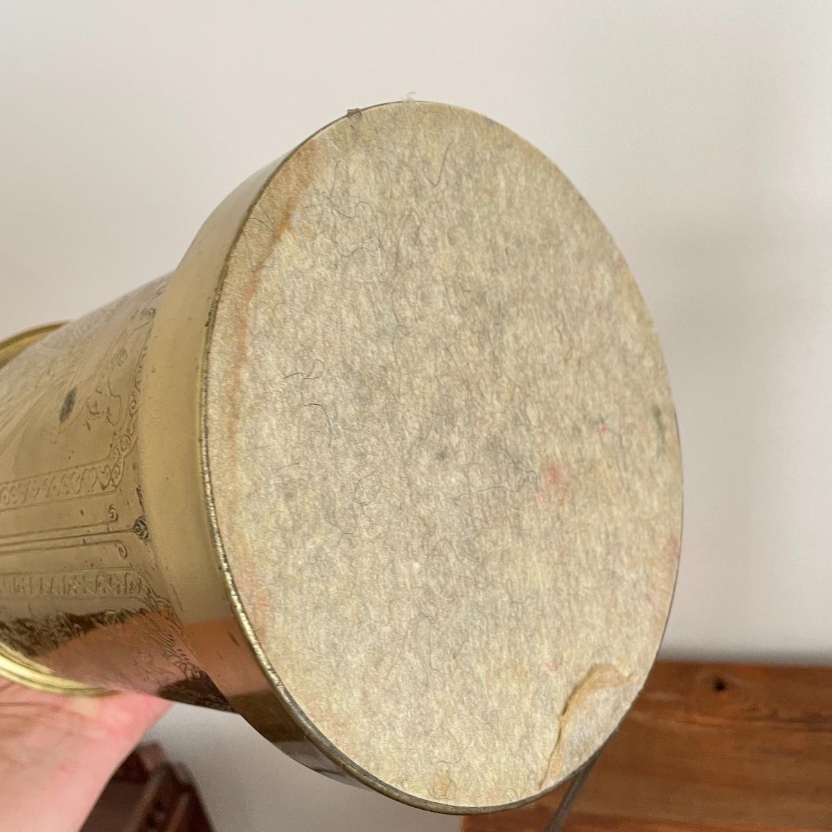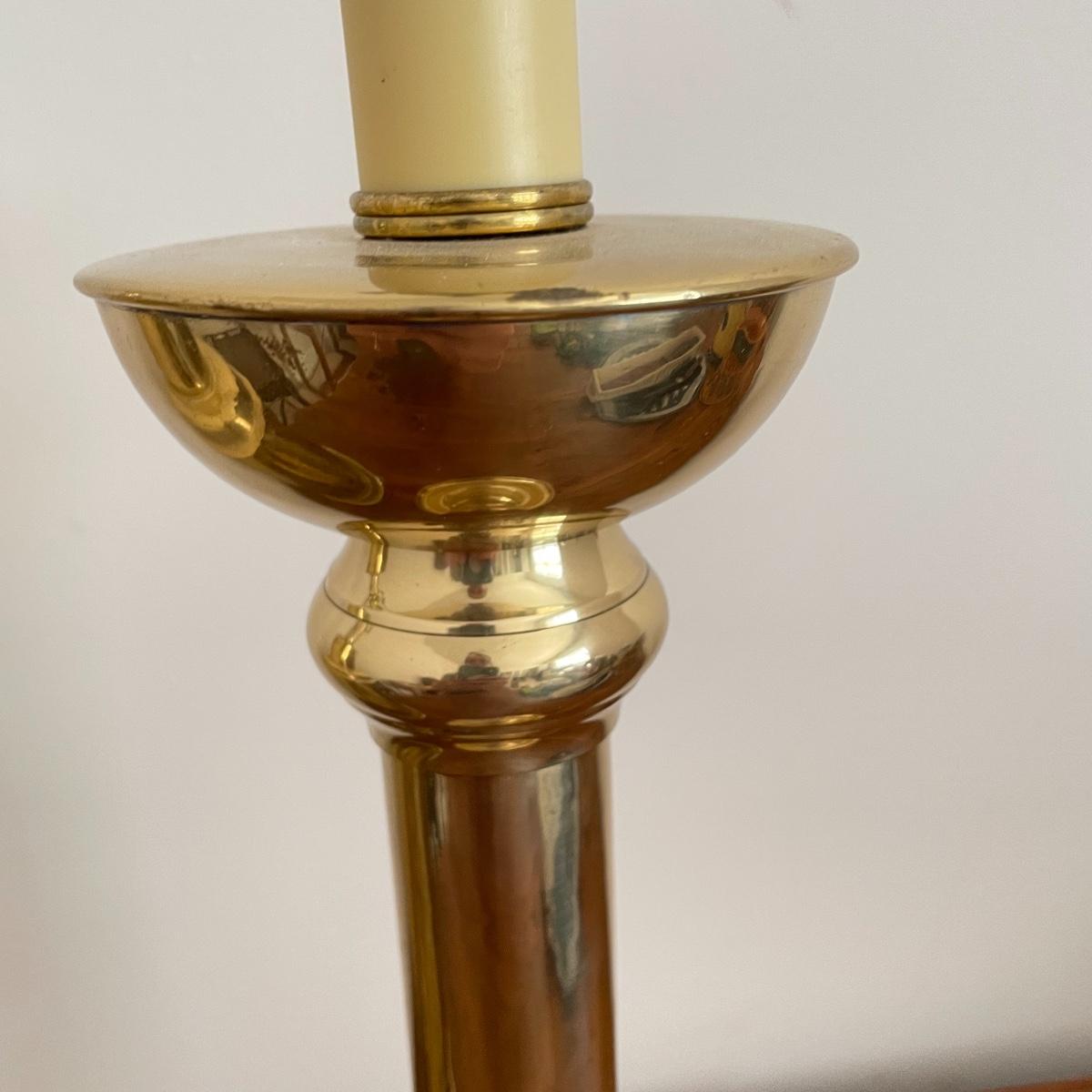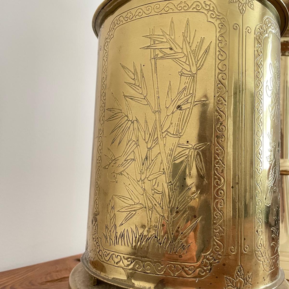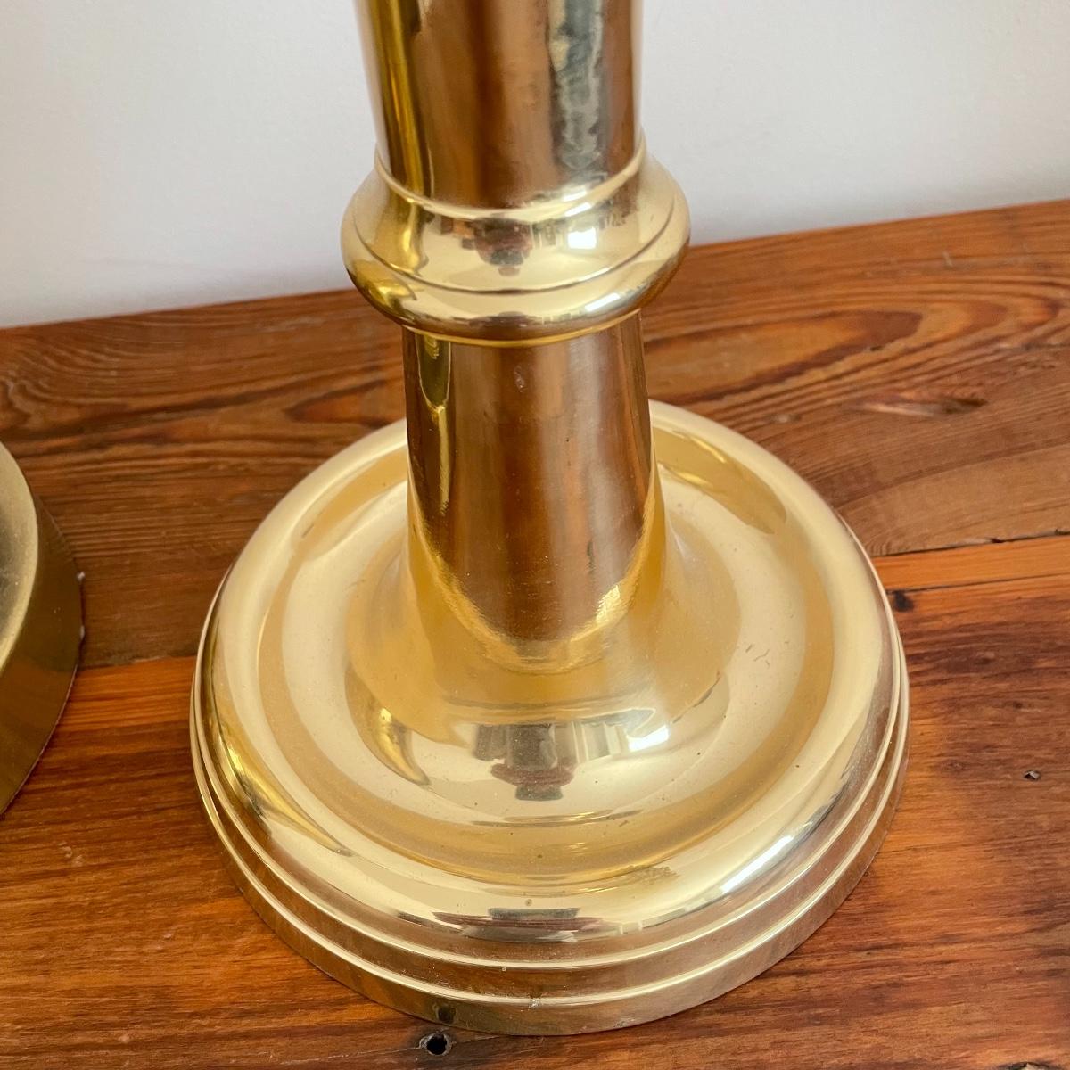 East Asian style brass lamp is 29” to the top of the finial. Both lamps worked and are 19” to the top of the socket. The thinner lamp is substantially heavier. Local pick up only.