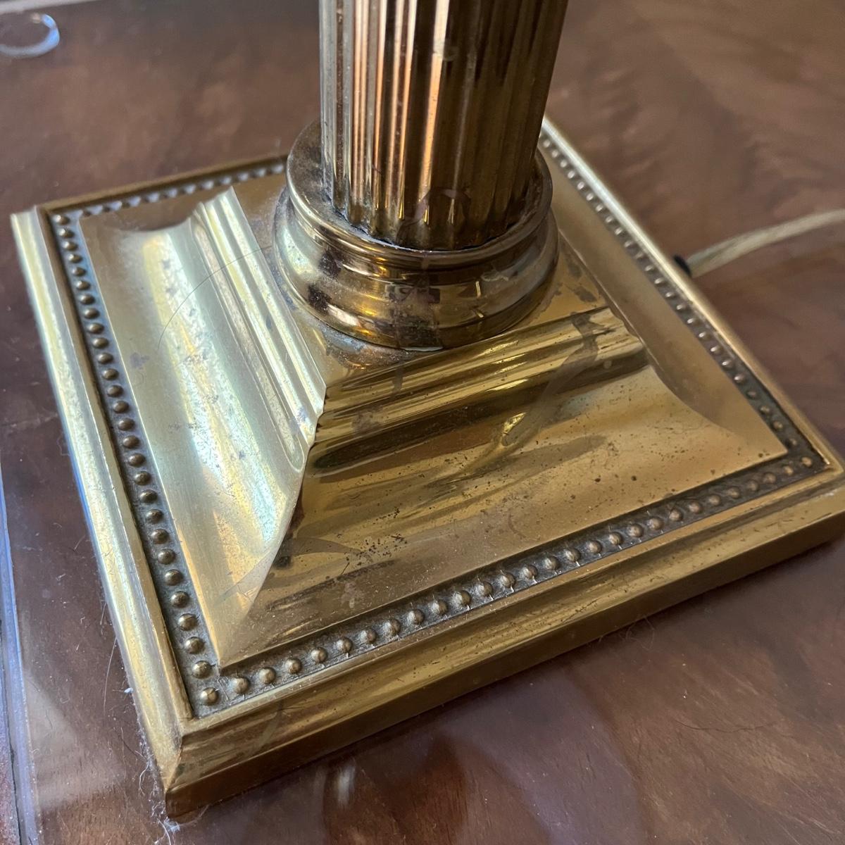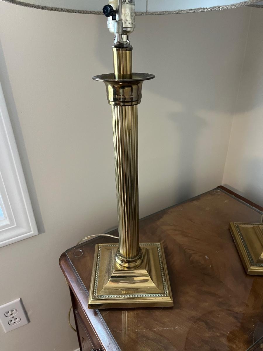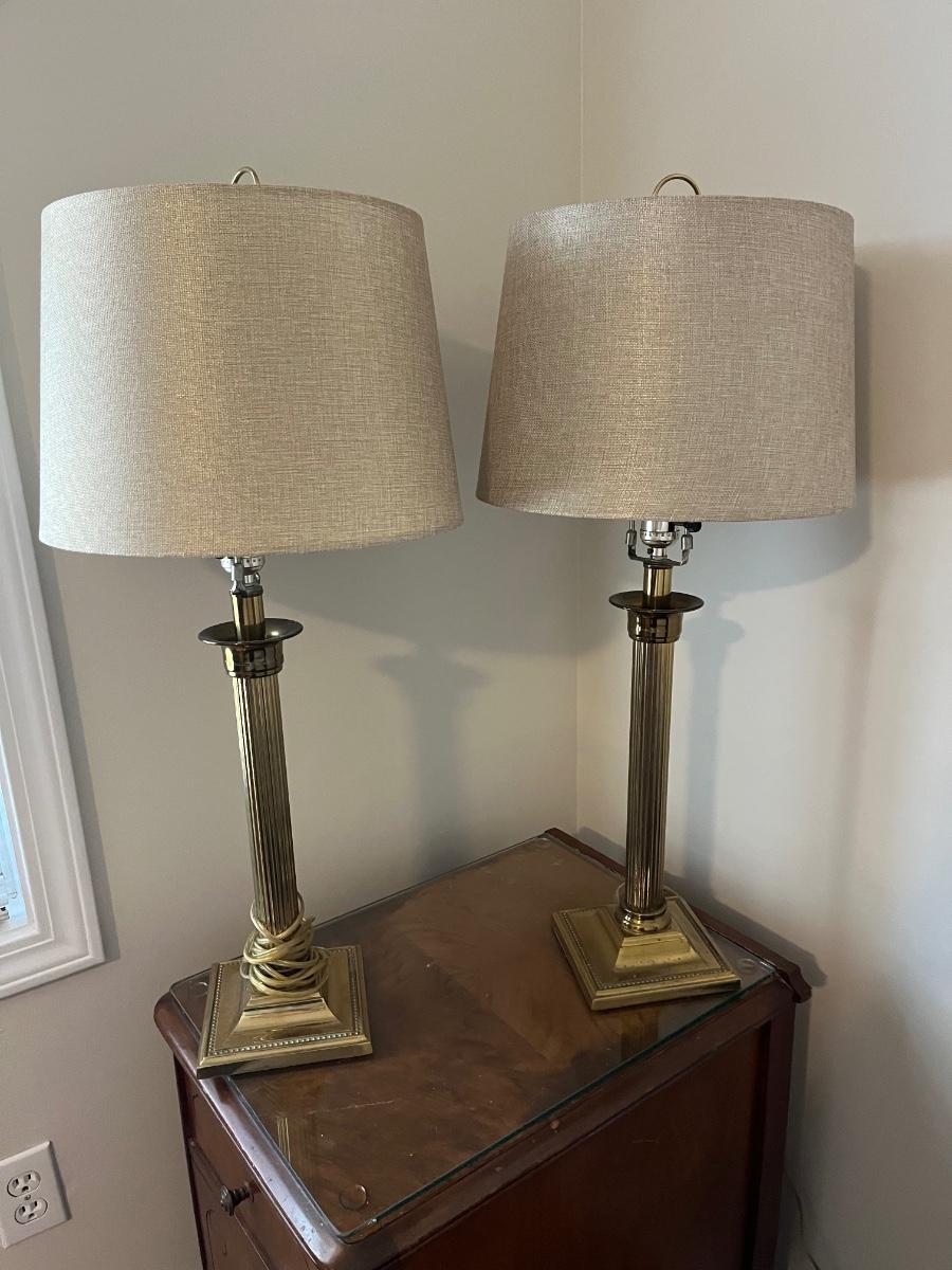 Two brass table lamps with finials and matching shades with a 3 way switch.