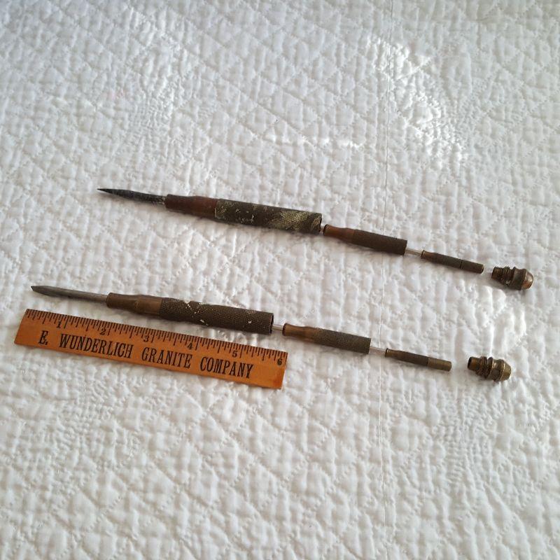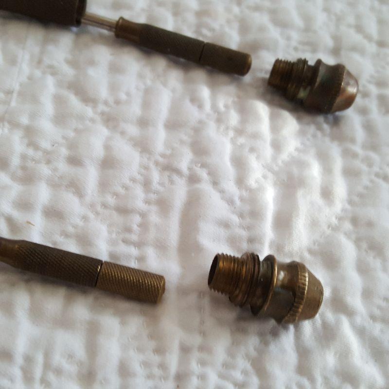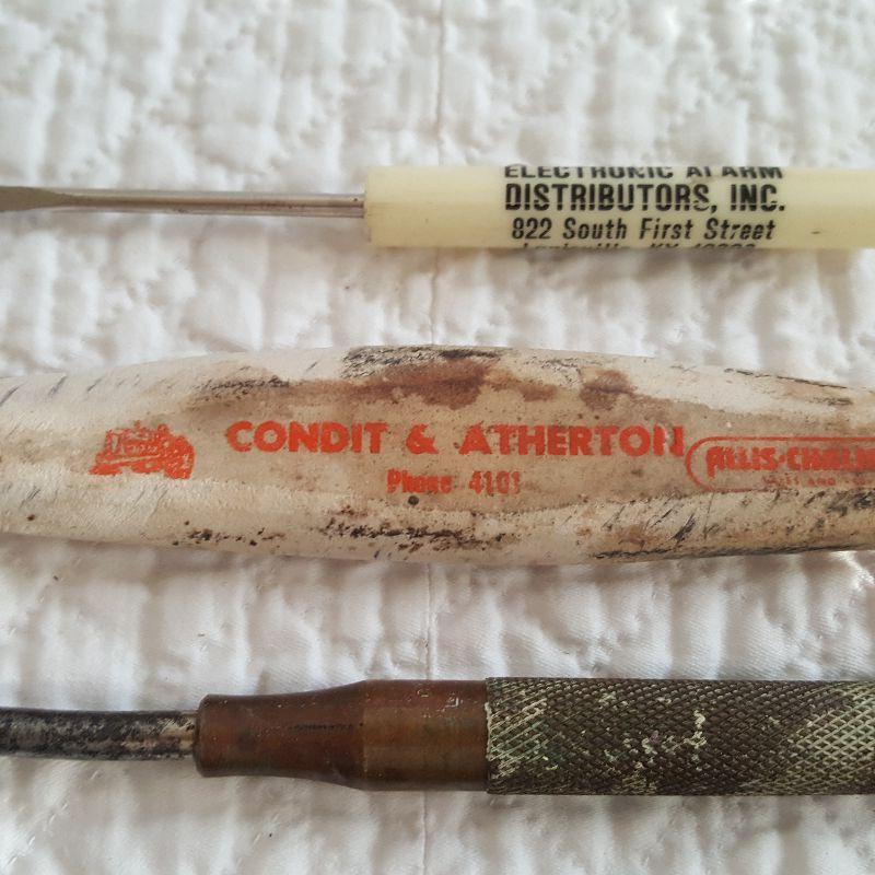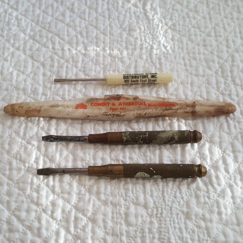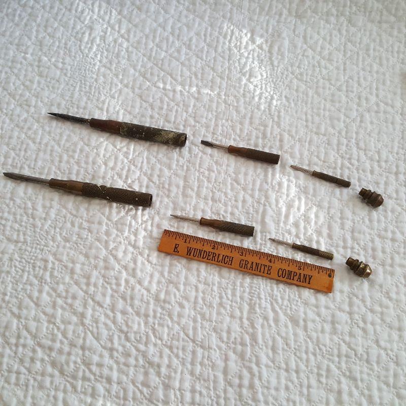 This auction lot is for Two Brass Tool Sets + Plus. This lot includes two brass screwdrivers that each contain several more screwdrivers of decreasing size - quite unique. They need to be cleaned of paint splotches that were received over useage and time. Also included in this lot is an Allis Chalmers marked Sharpening Hone (?) and an advertising mini screwdriver.