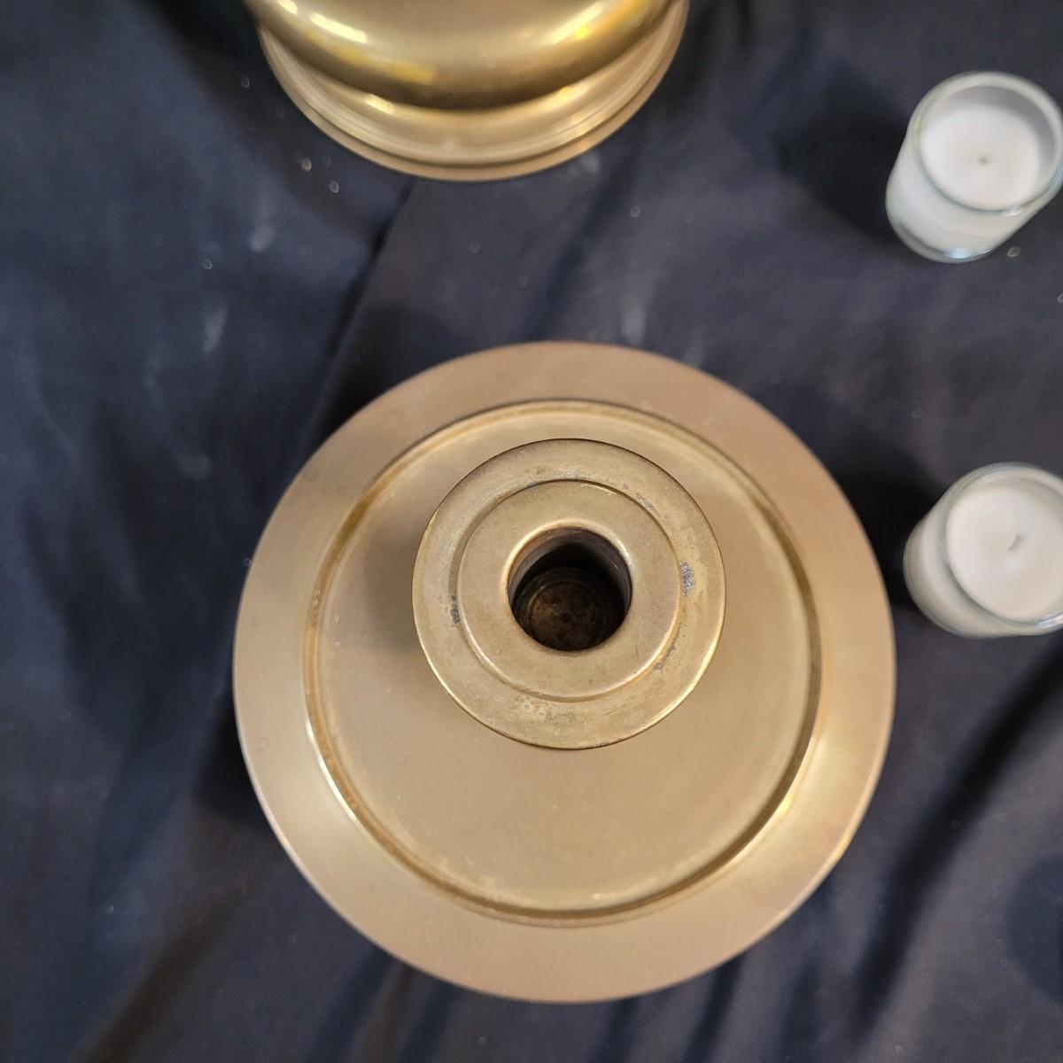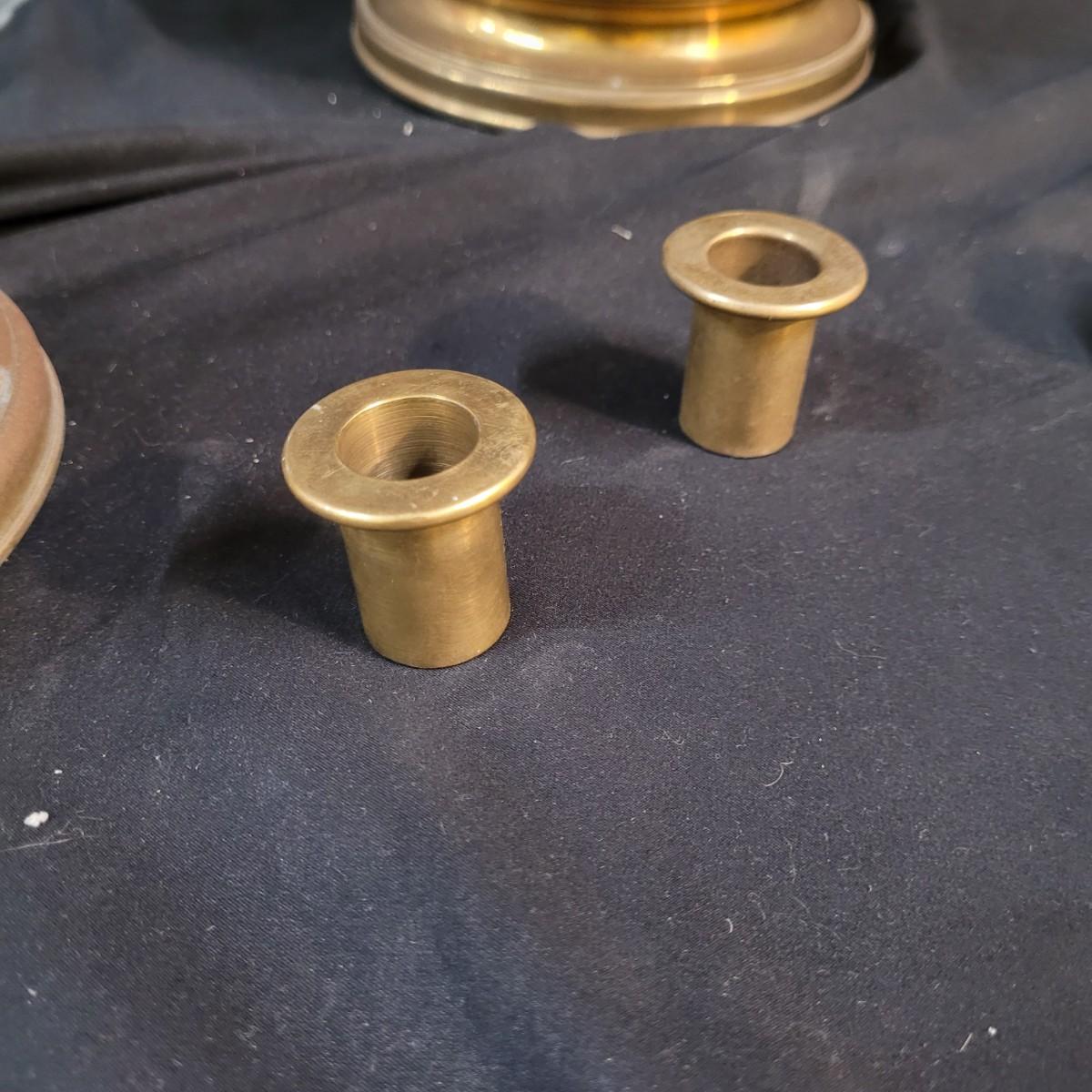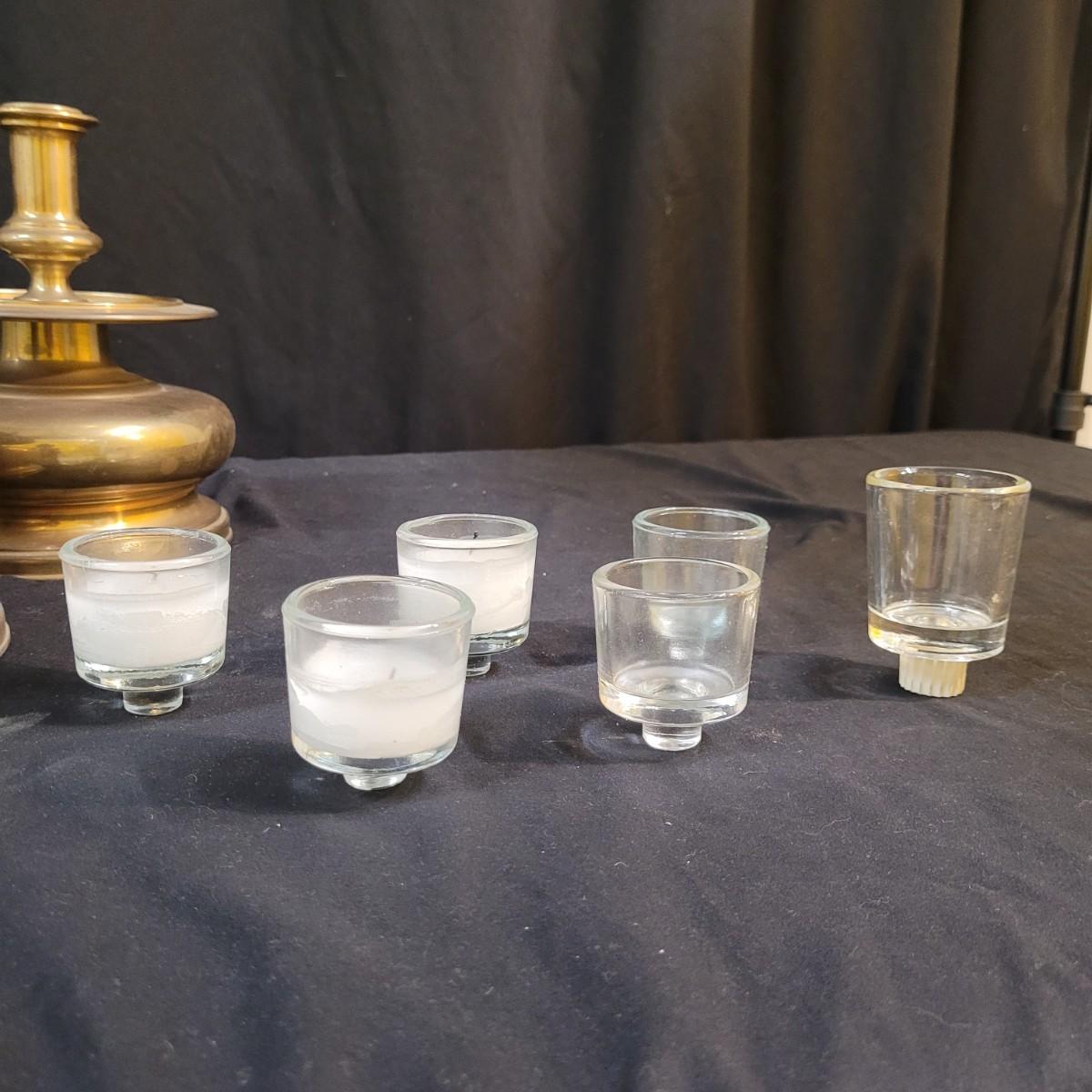 Sturdy, heavy brass votive candle holders with removable inserts. Each votive is same base size and all fit. Note that one votive is taller than the others. Bases measure approximately 7"DIA x9.5"H, globe 8"DIA at top x12"H. Shipping available.