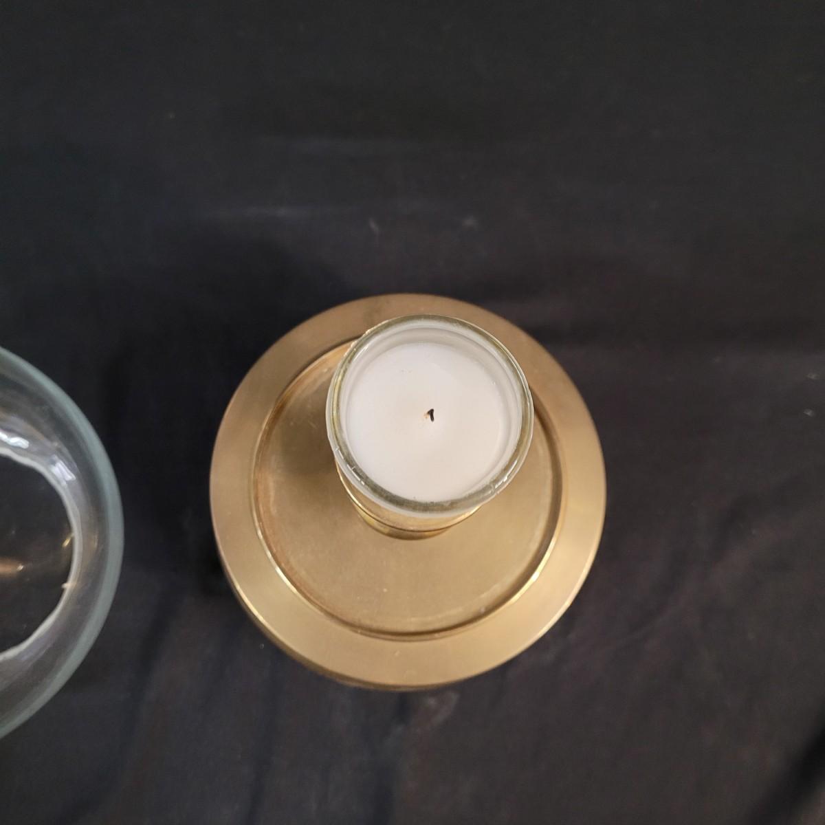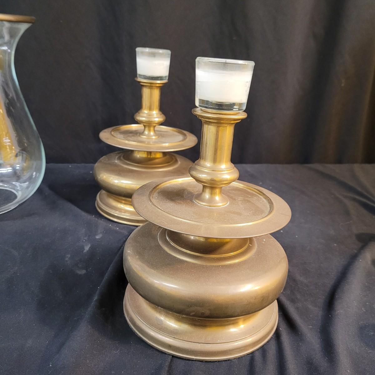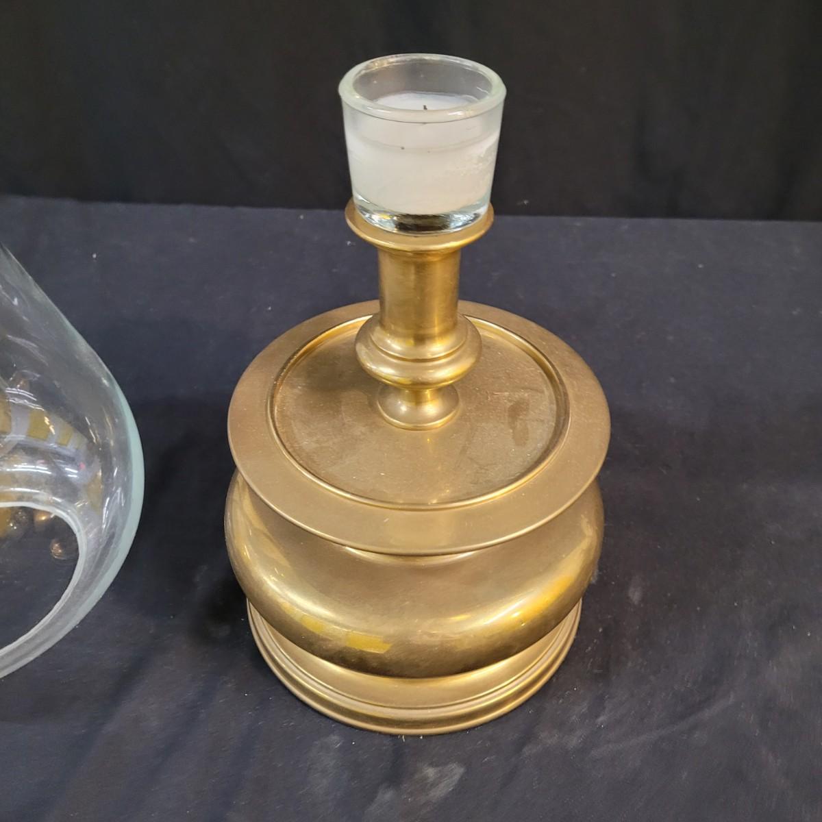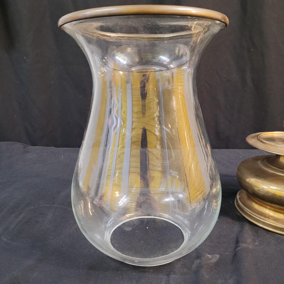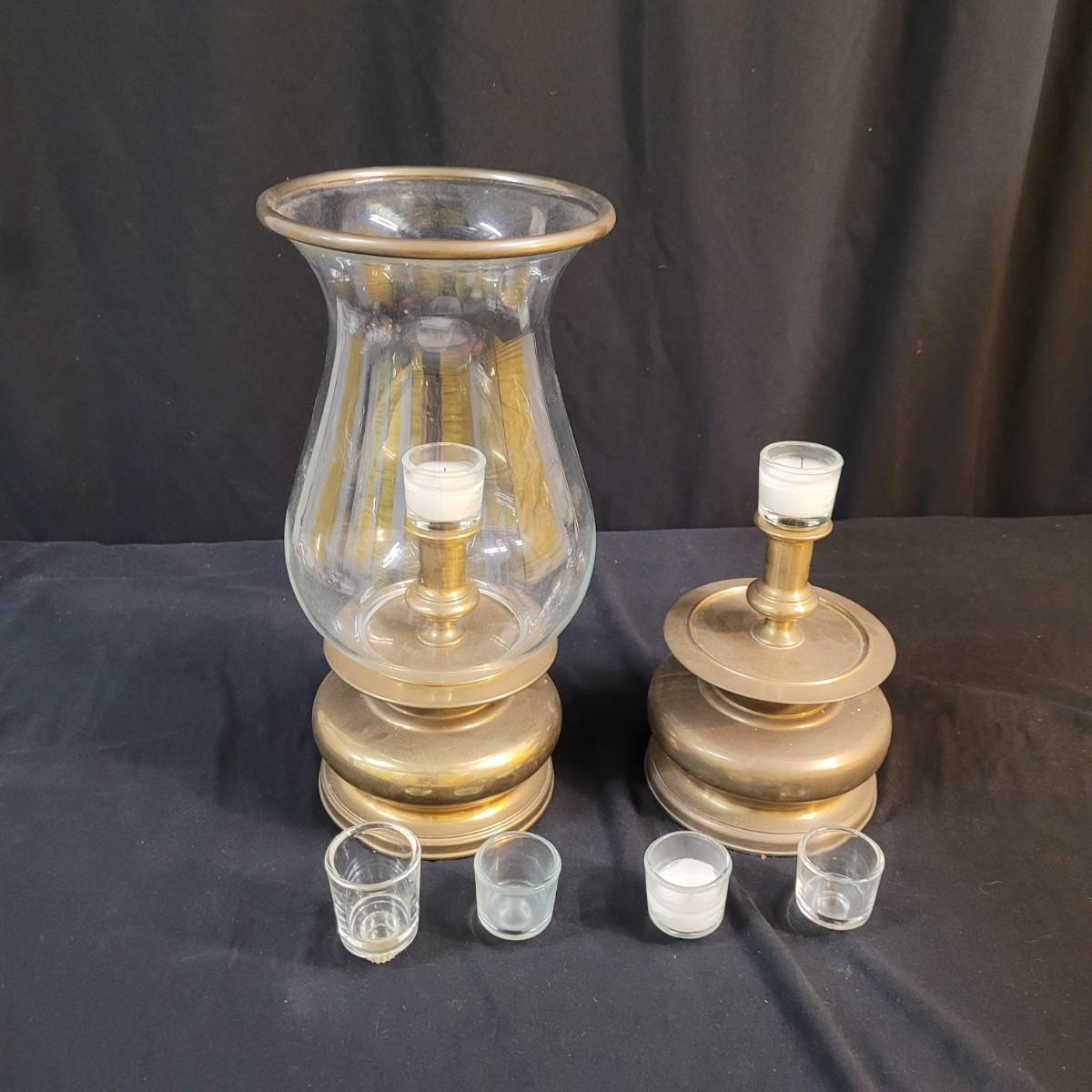 Two Brass Votive Candle Holders with One Glass Hurricane Globe (C-D-CE)