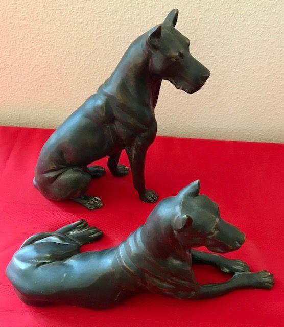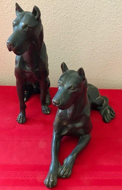Dog lying down measure 14 inches long and 7 inches tall and dog sitting measures 10 inches long and 11 inches tall.