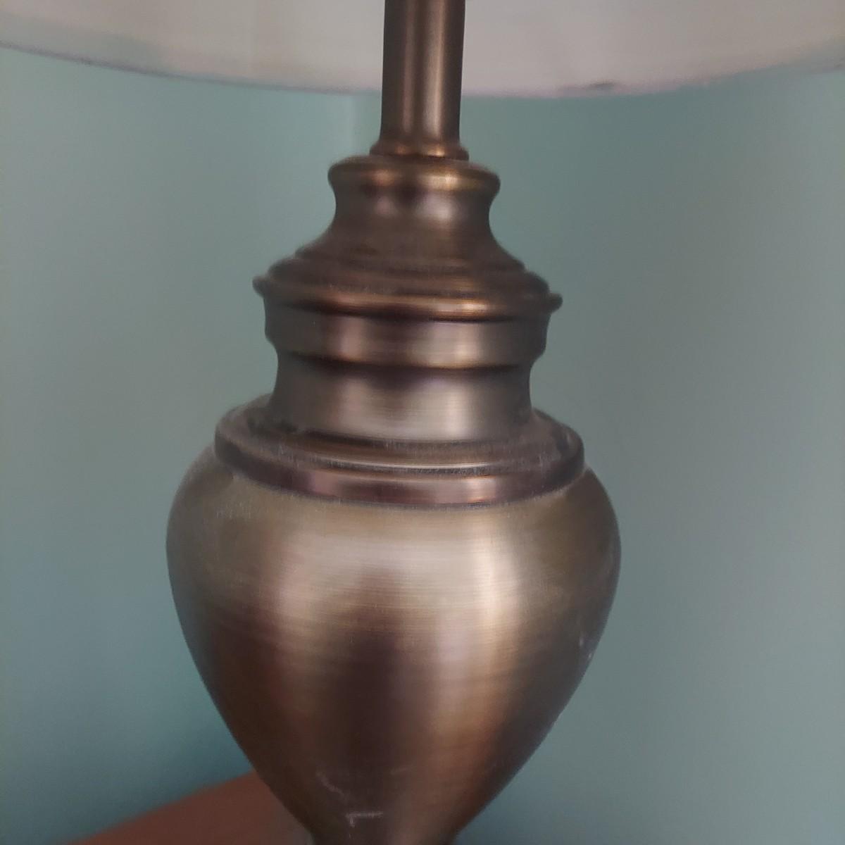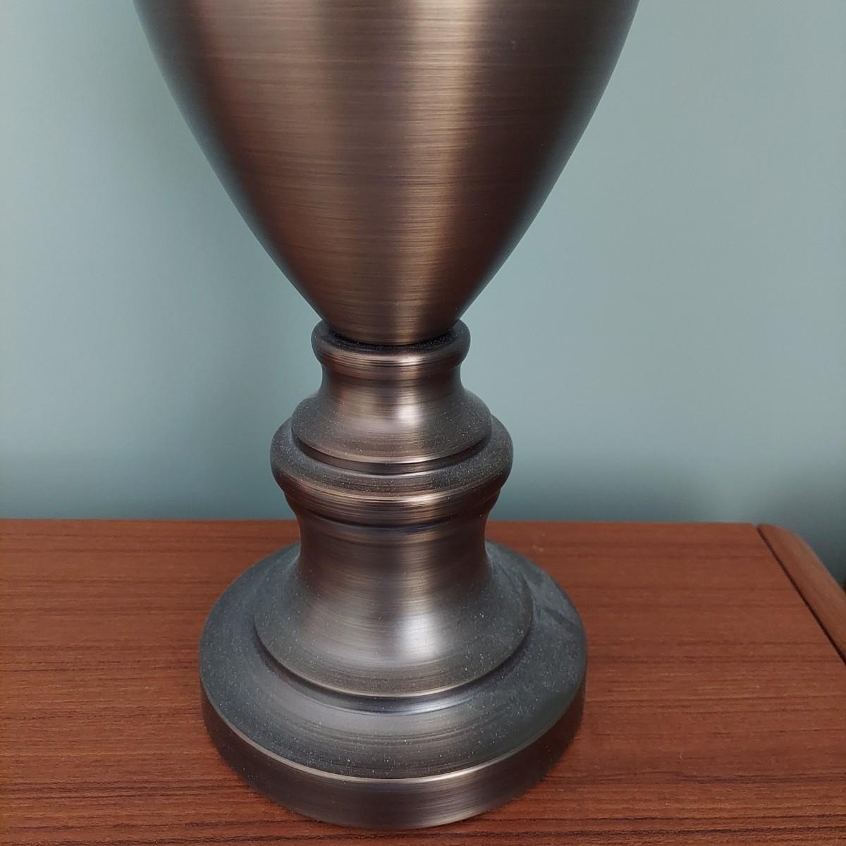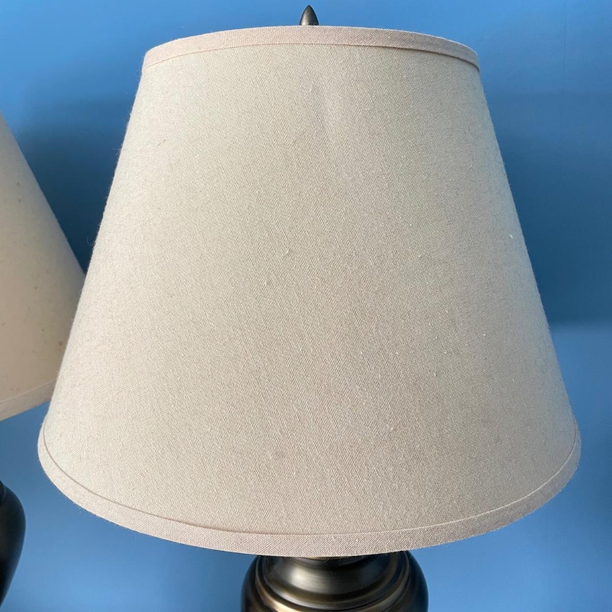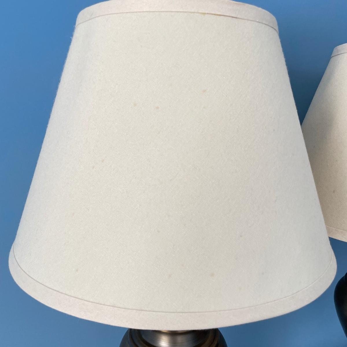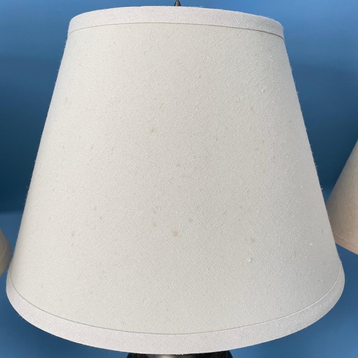 Three metal table lamps with bronze finish and cloth shades. The shades show small spots. Each lamp is approximately 27"H with a 14"D shade. All were plugged in and powered on. Appear to have three way switches. Please see photos for details. Local Pickup Only