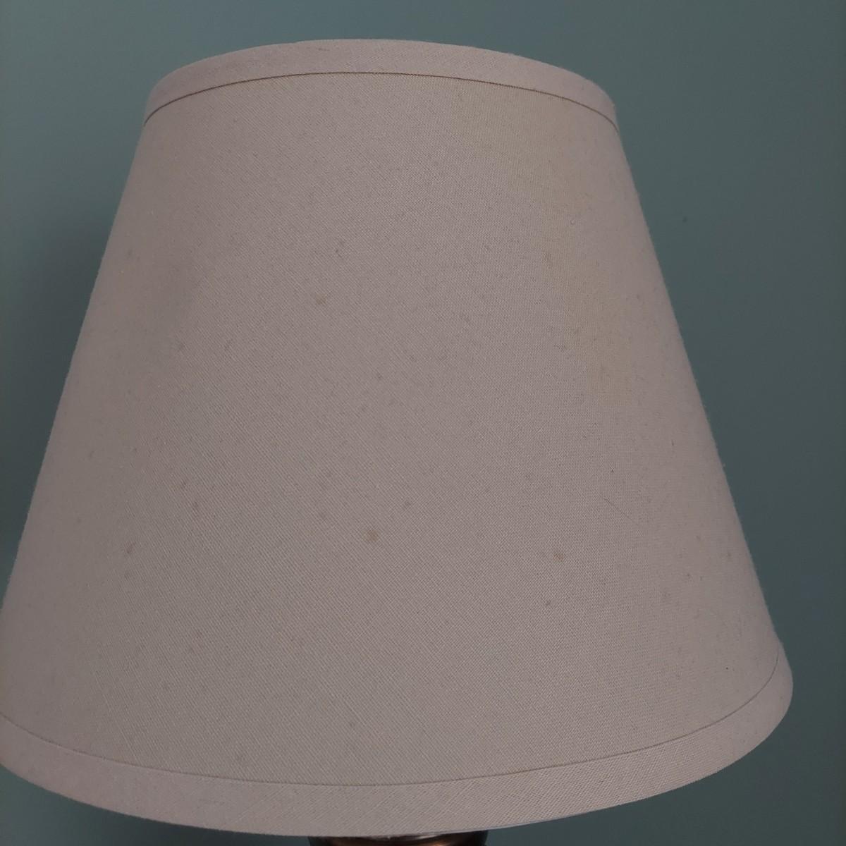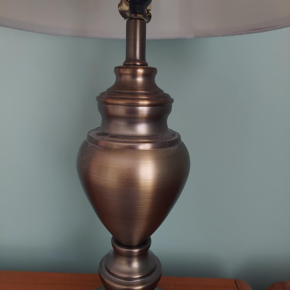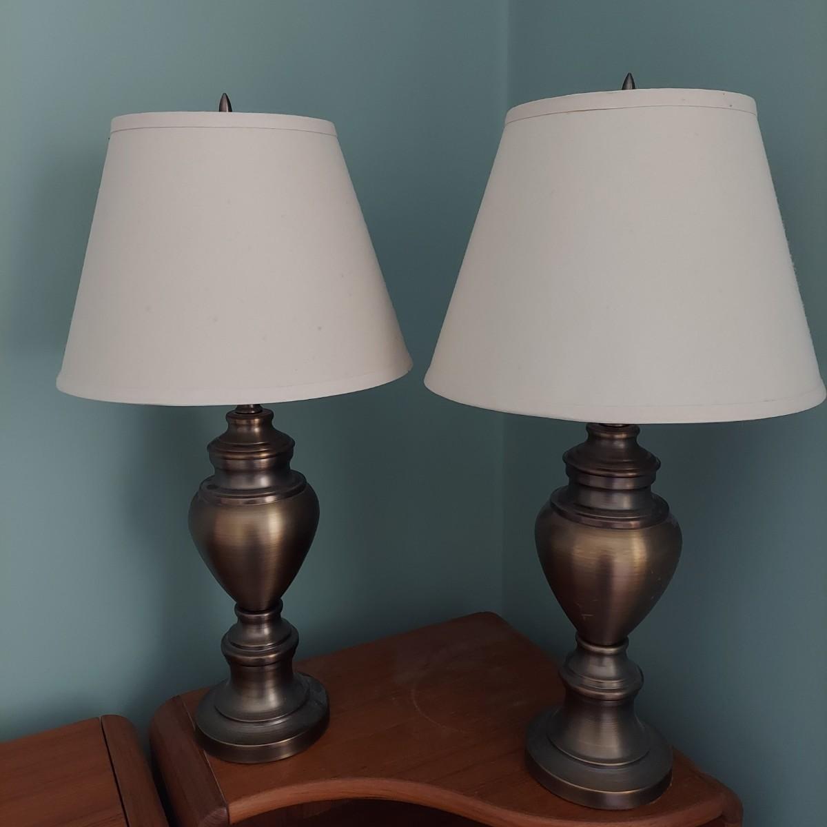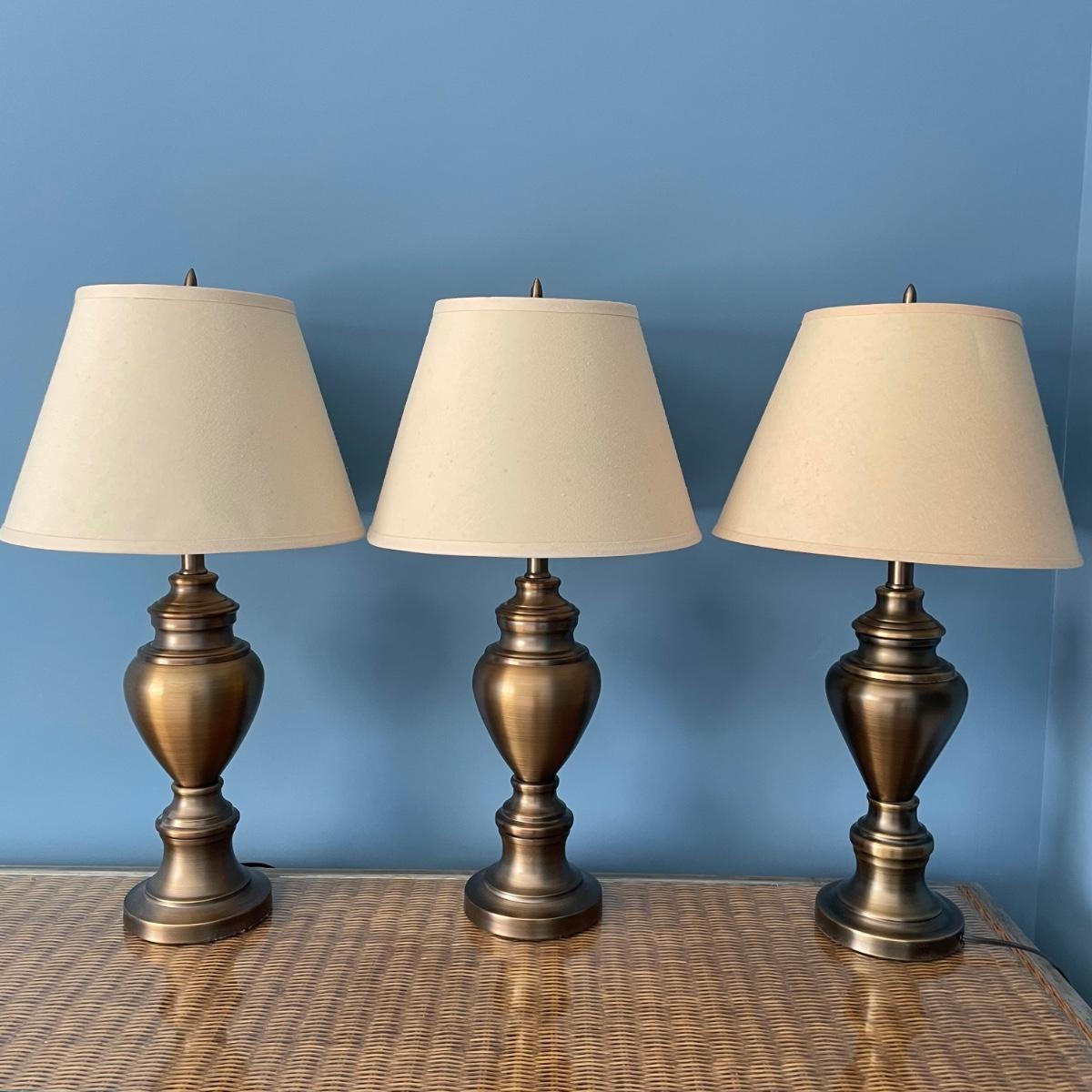 Three metal table lamps with bronze finish and cloth shades. The shades show small spots. Each lamp is approximately 27"H with a 14"D shade. All were plugged in and powered on. Appear to have three way switches. Please see photos for details. Local Pickup Only