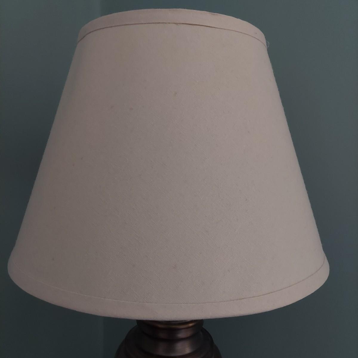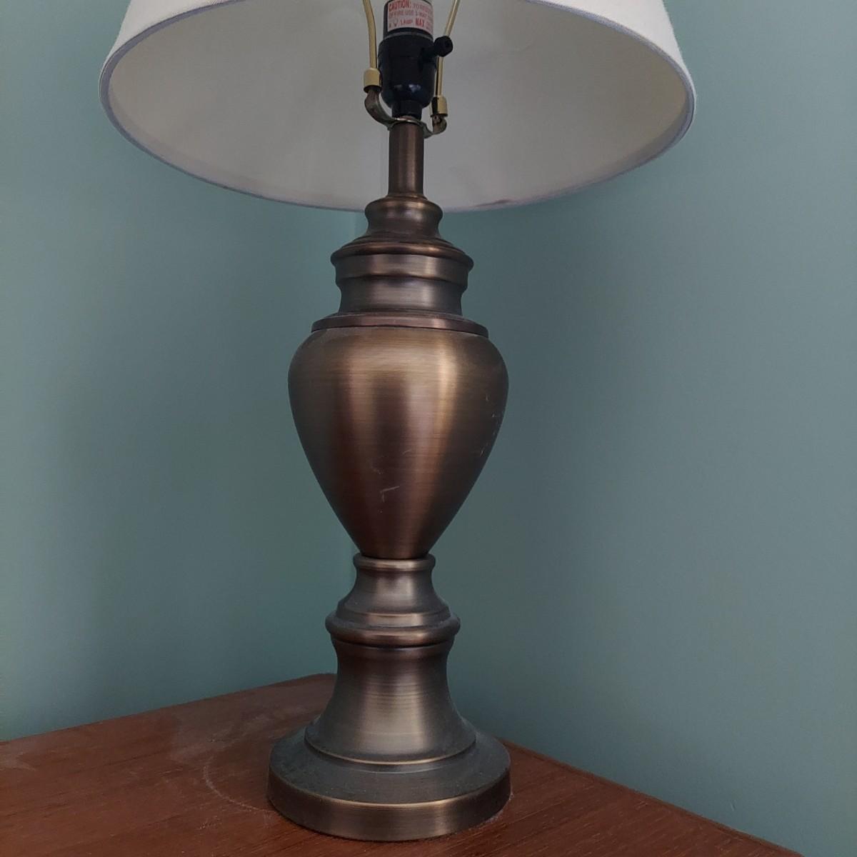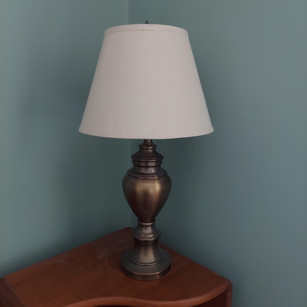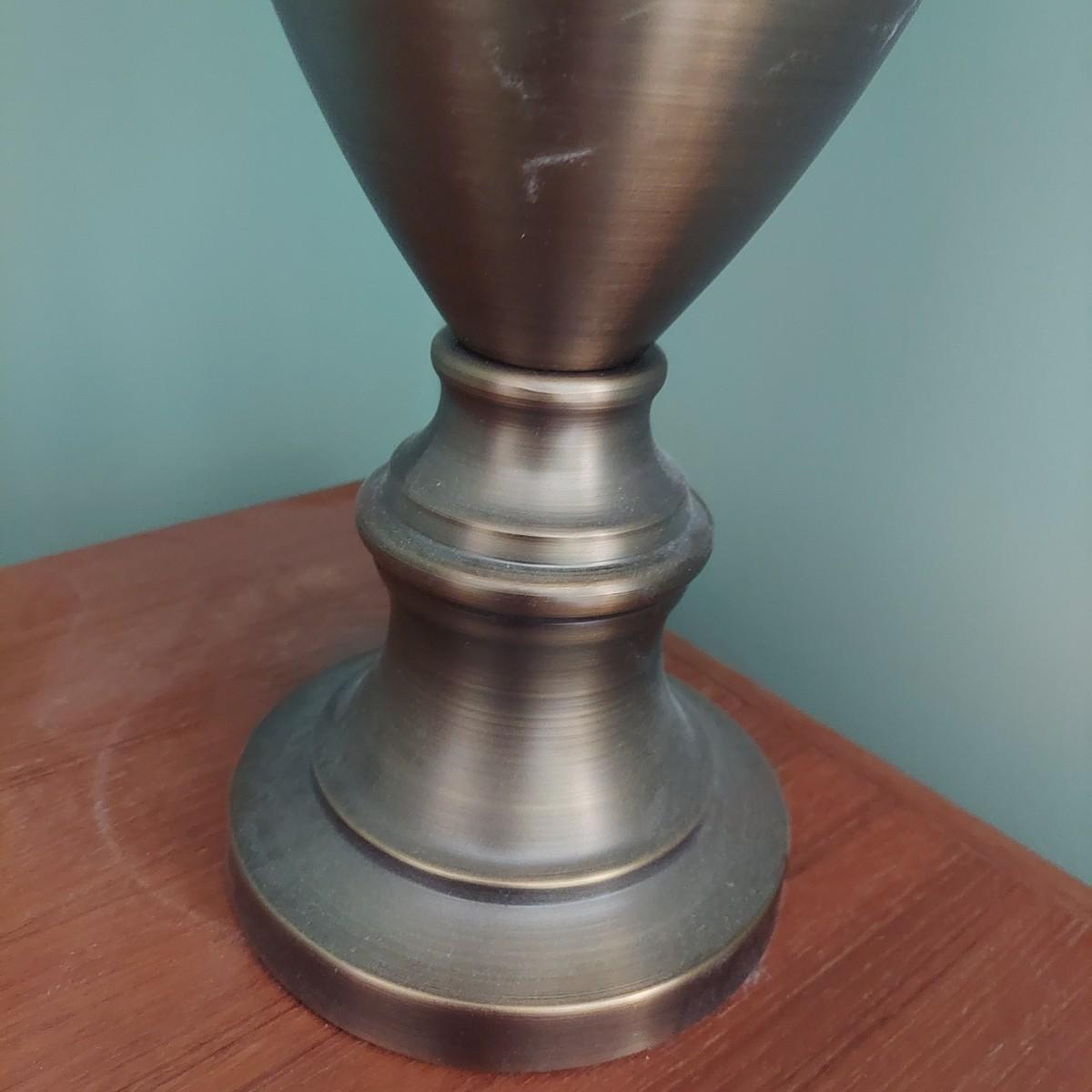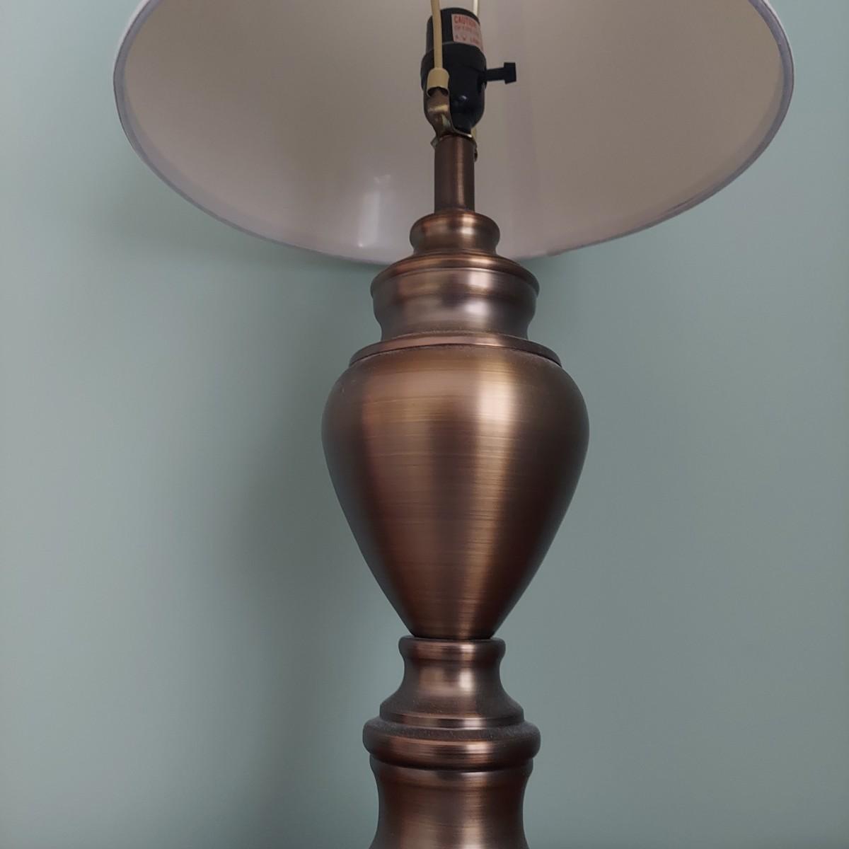 Three metal table lamps with bronze finish and cloth shades. The shades show small spots. Each lamp is approximately 27"H with a 14"D shade. All were plugged in and powered on. Appear to have three way switches. Please see photos for details. Local Pickup Only