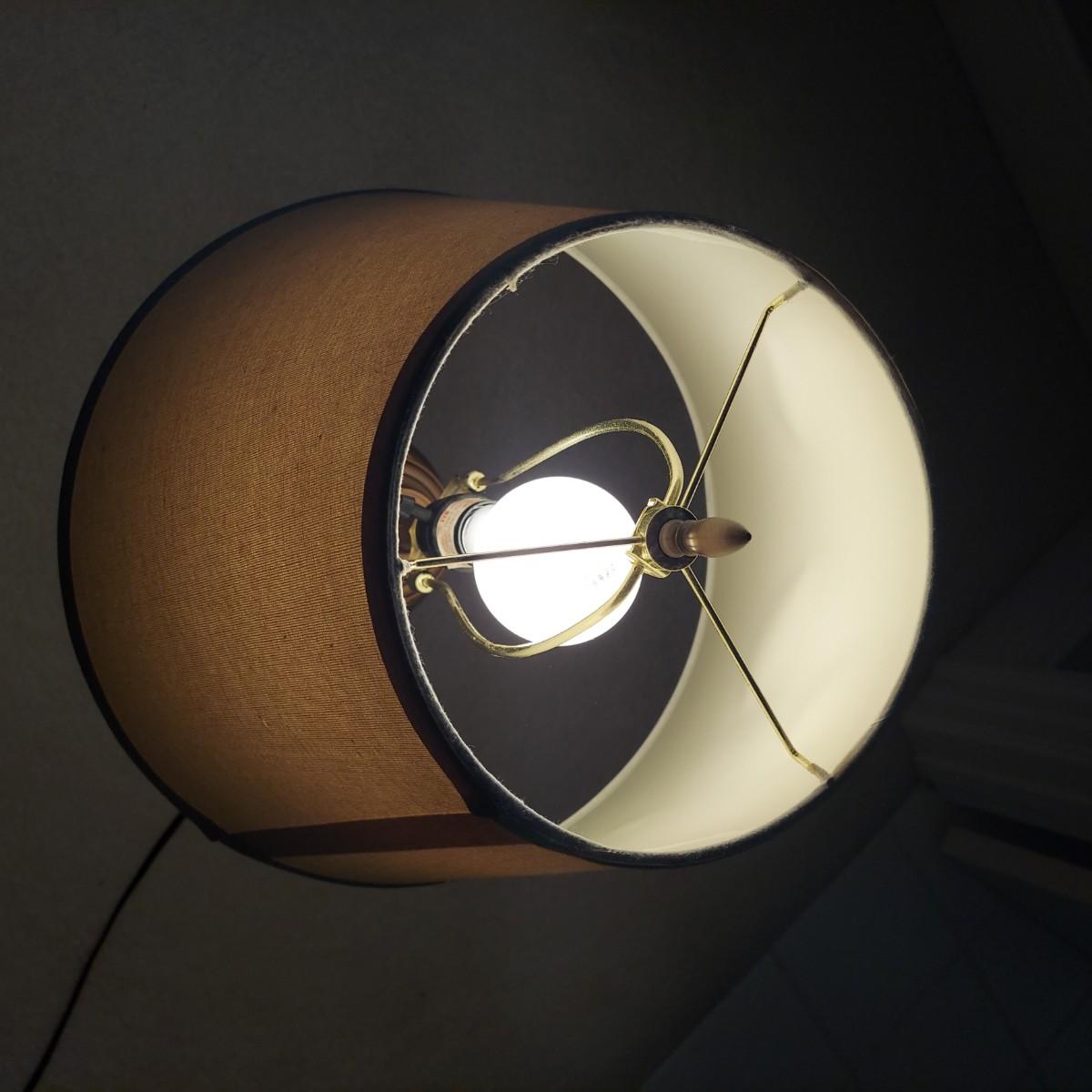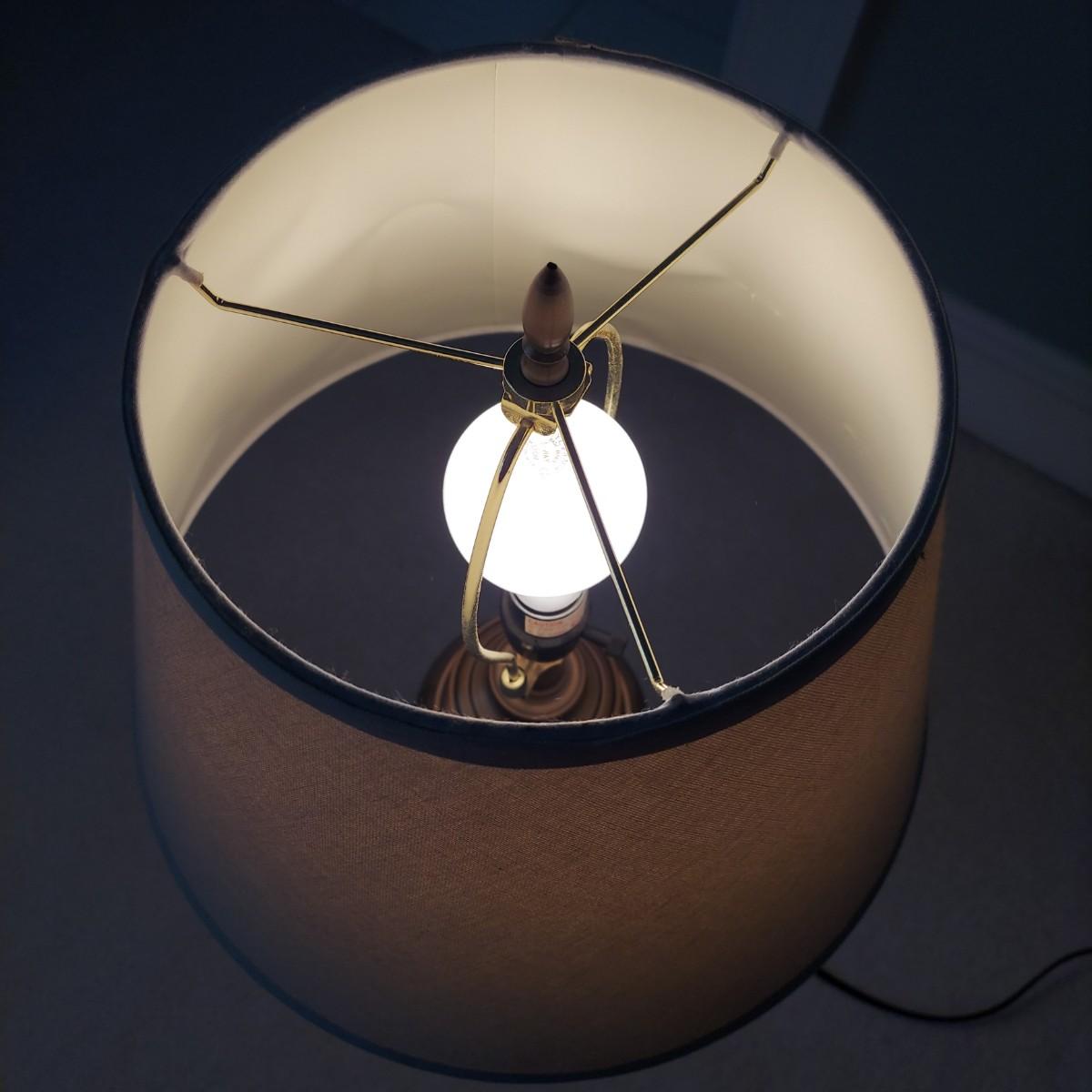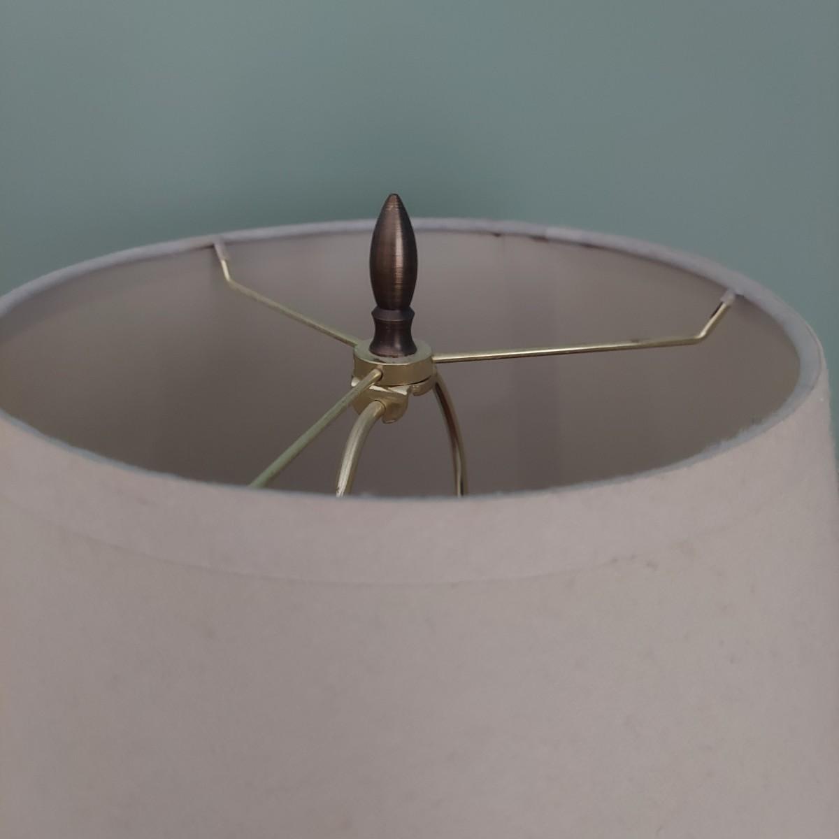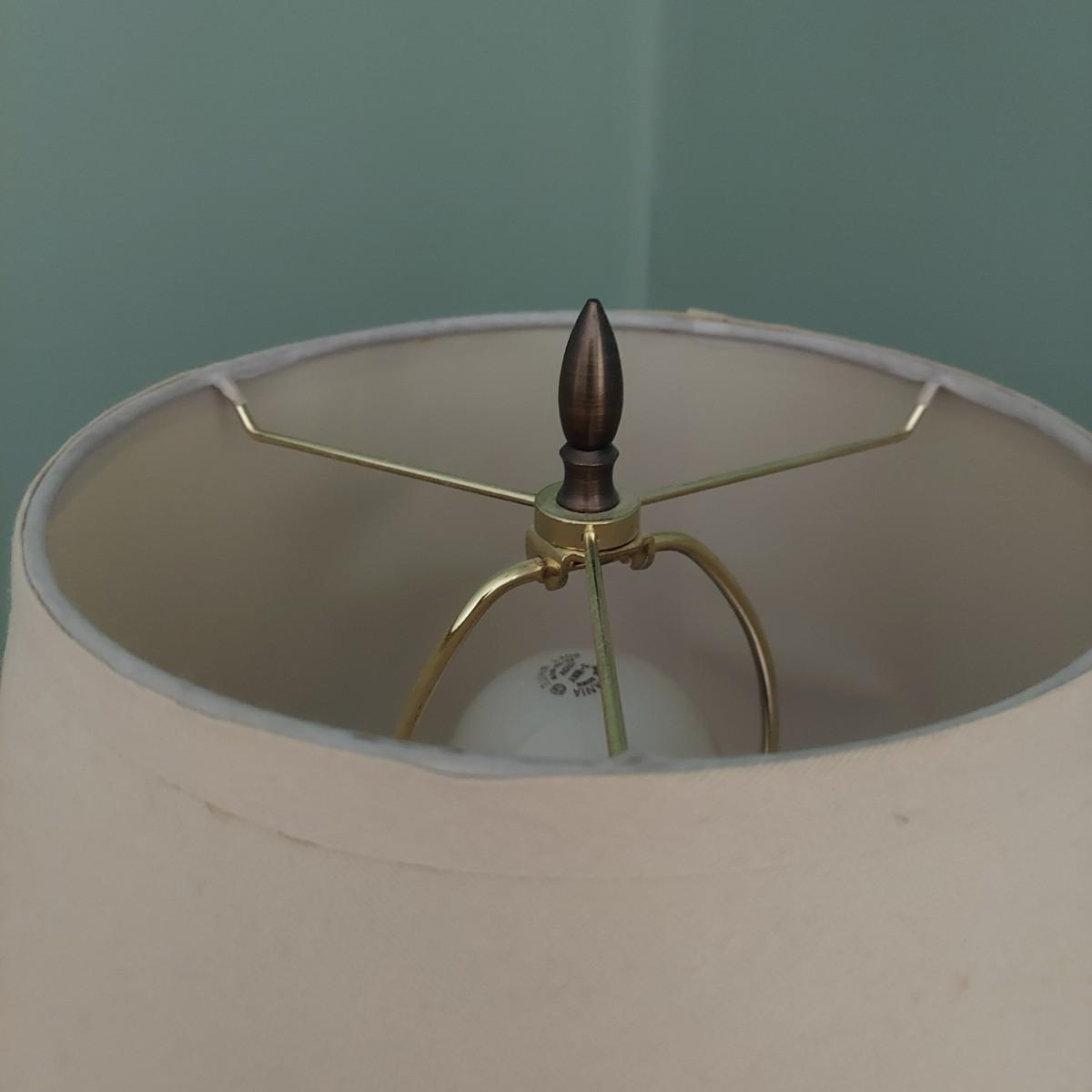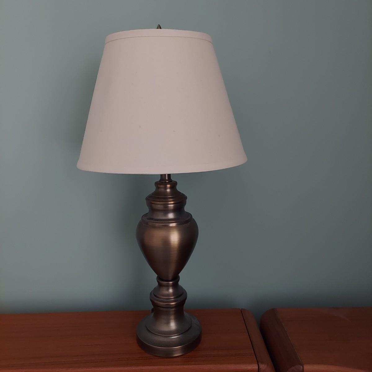 Three metal table lamps with bronze finish and cloth shades. The shades show small spots. Each lamp is approximately 27"H with a 14"D shade. All were plugged in and powered on. Appear to have three way switches. Please see photos for details. Local Pickup Only