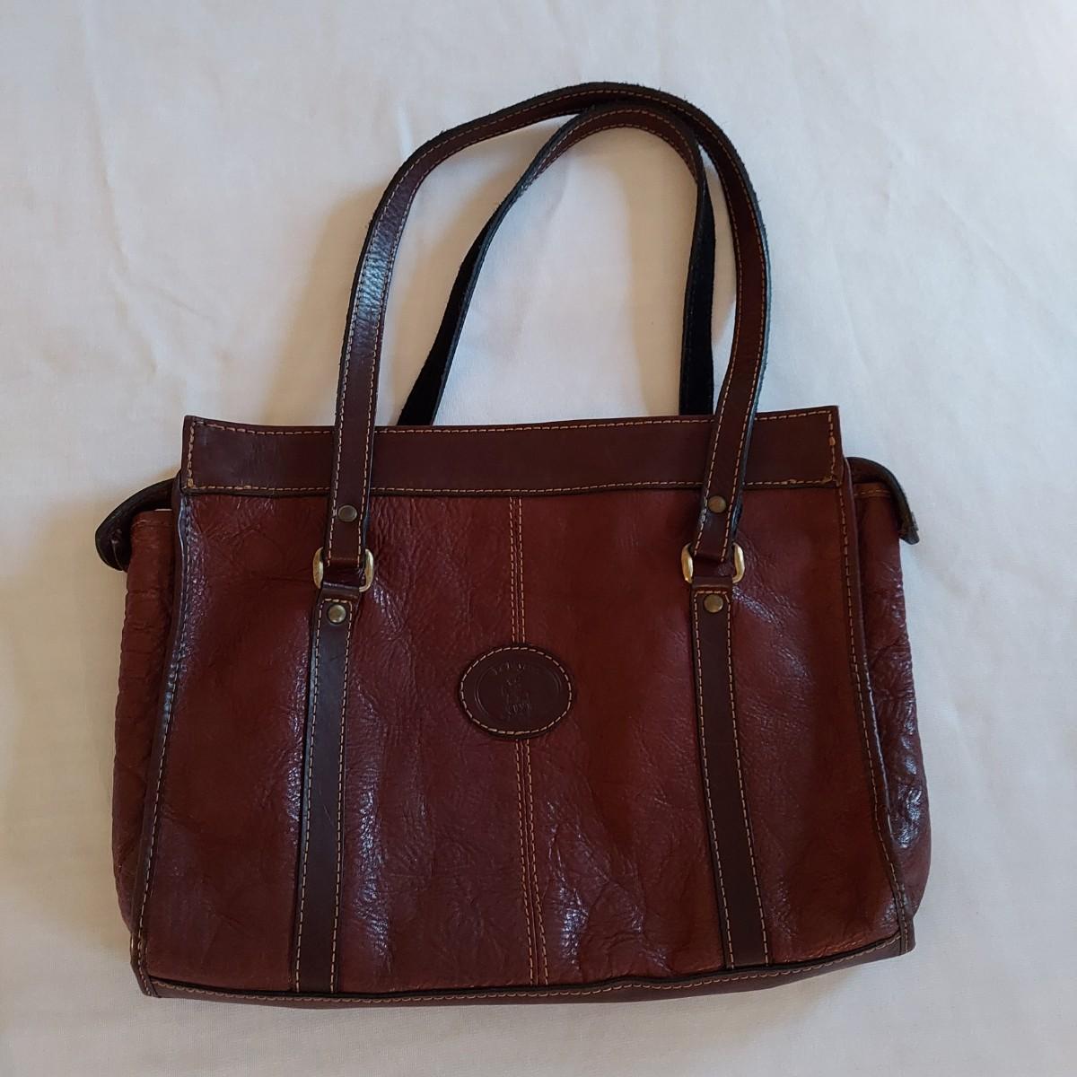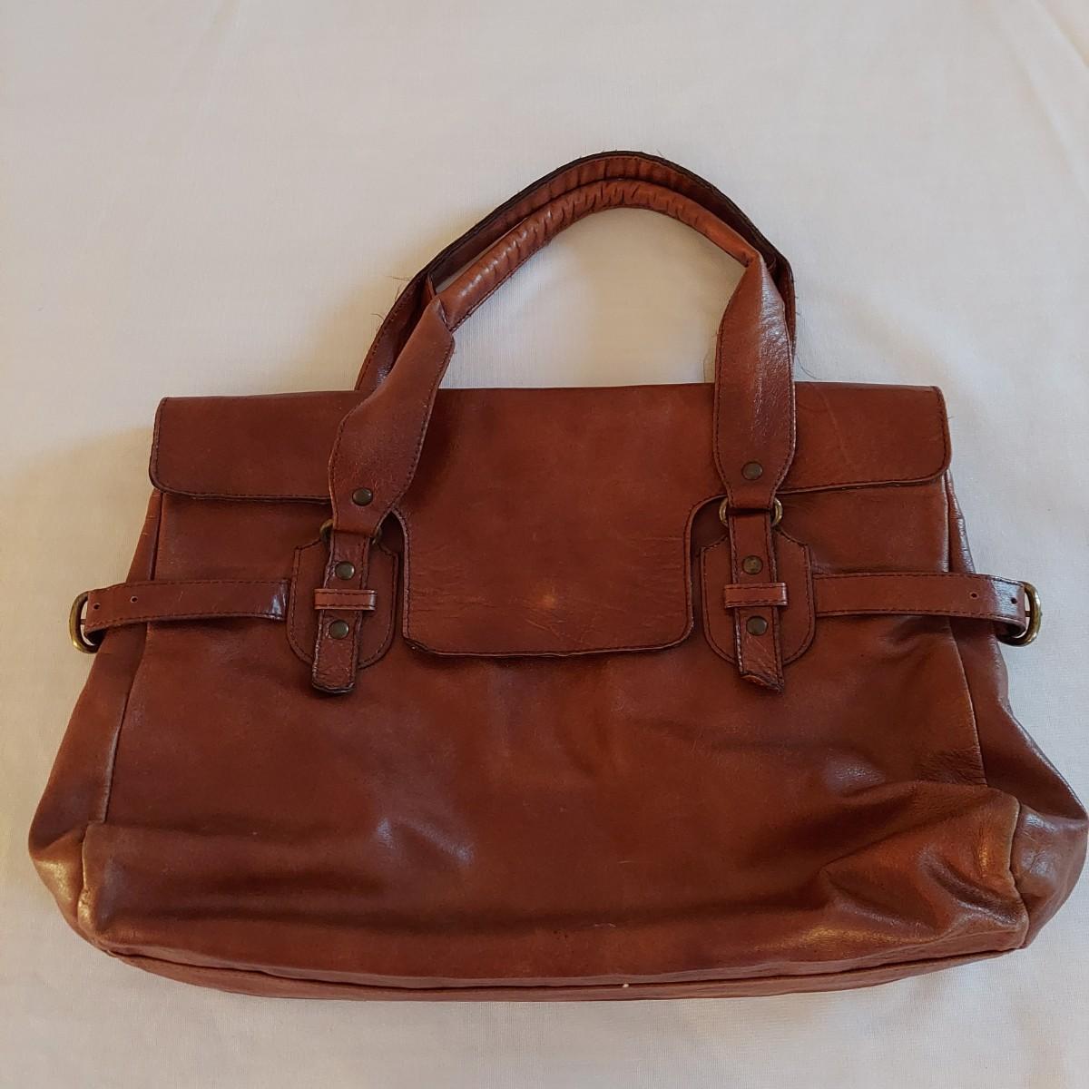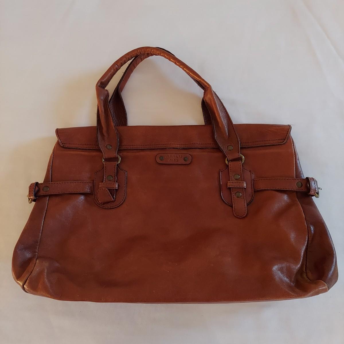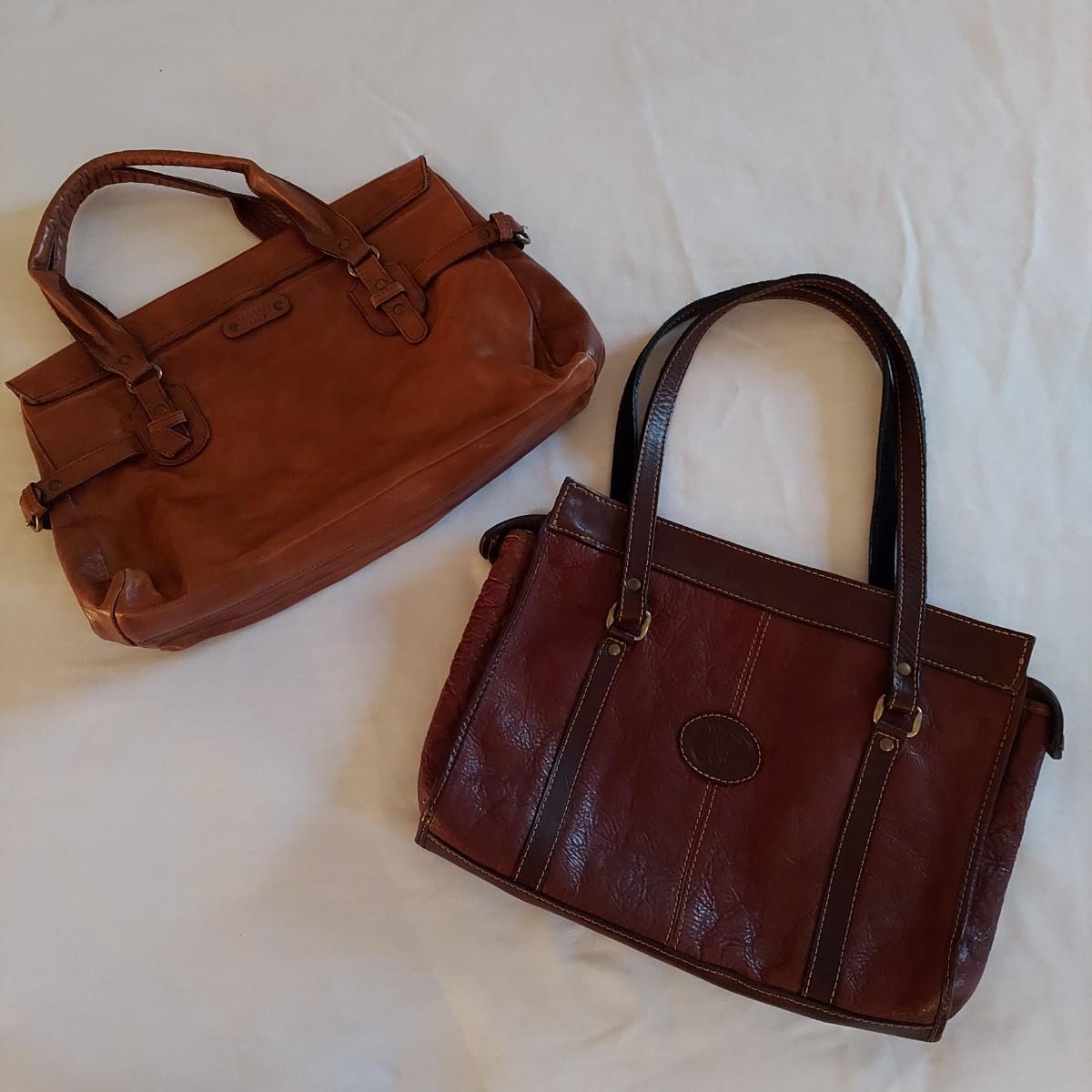 Two brown leather purses. The Abaco Paris bag is approximately 15"x 4" x 11"H. The La Bayanca bag is 14" x 2" x 11"H. Shipping available.
