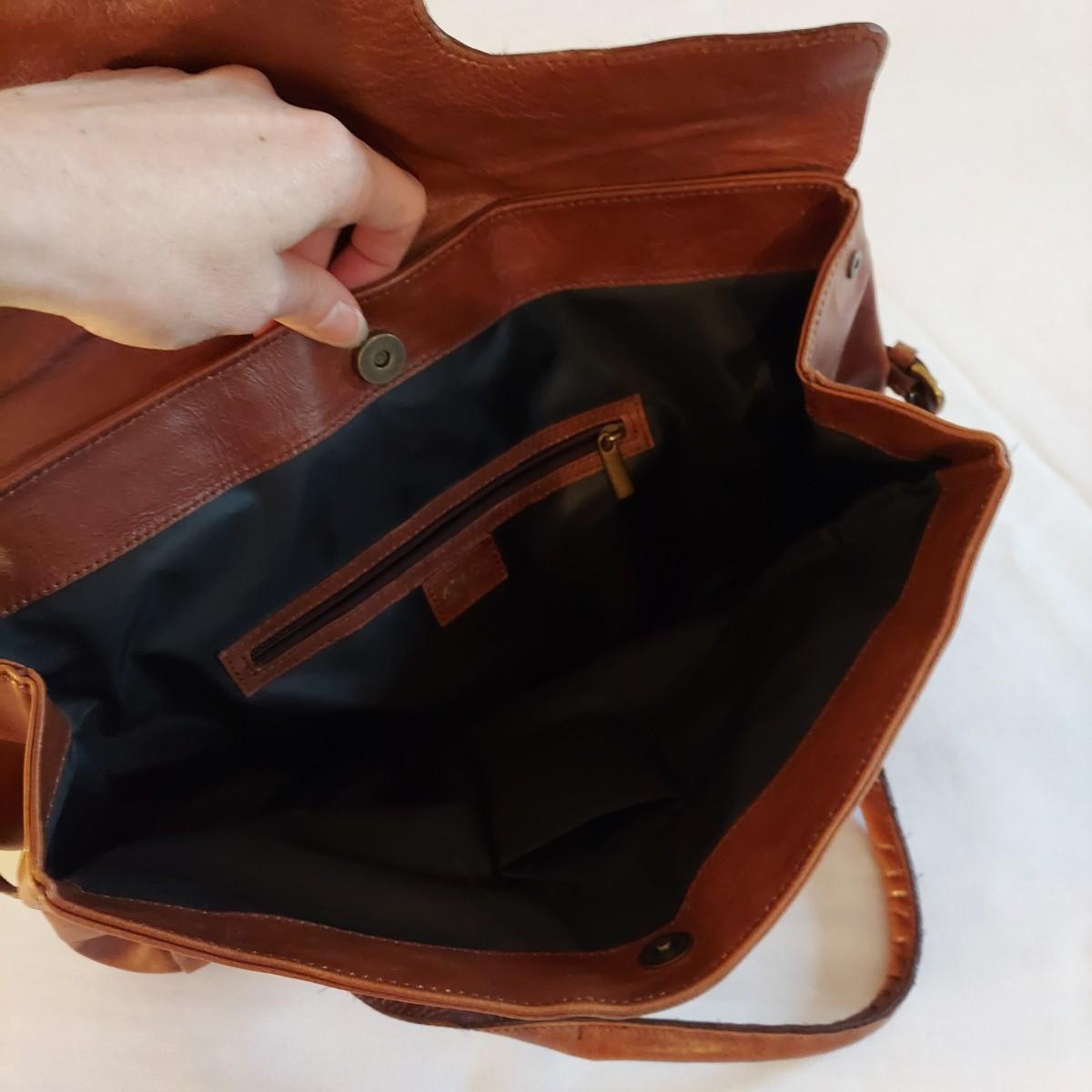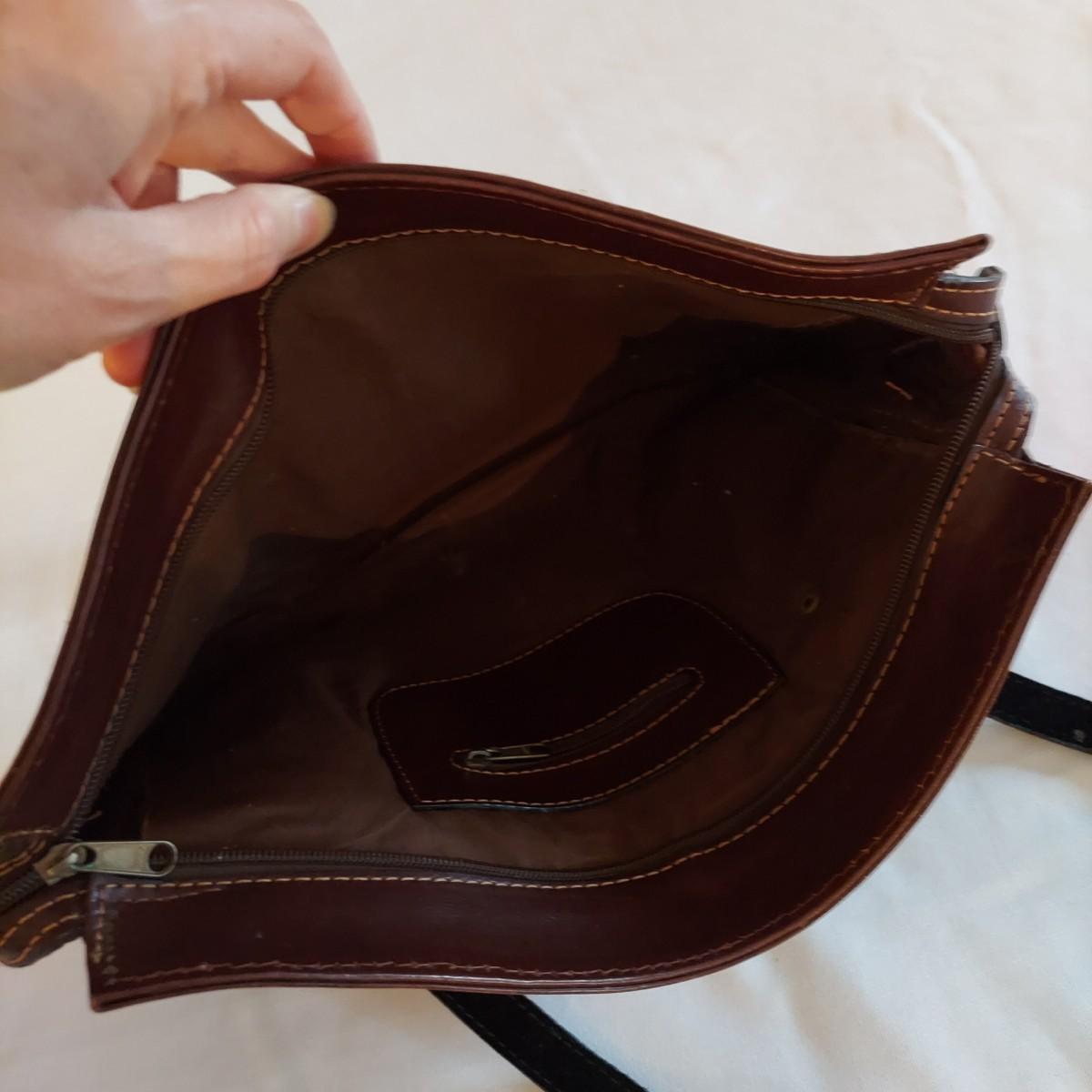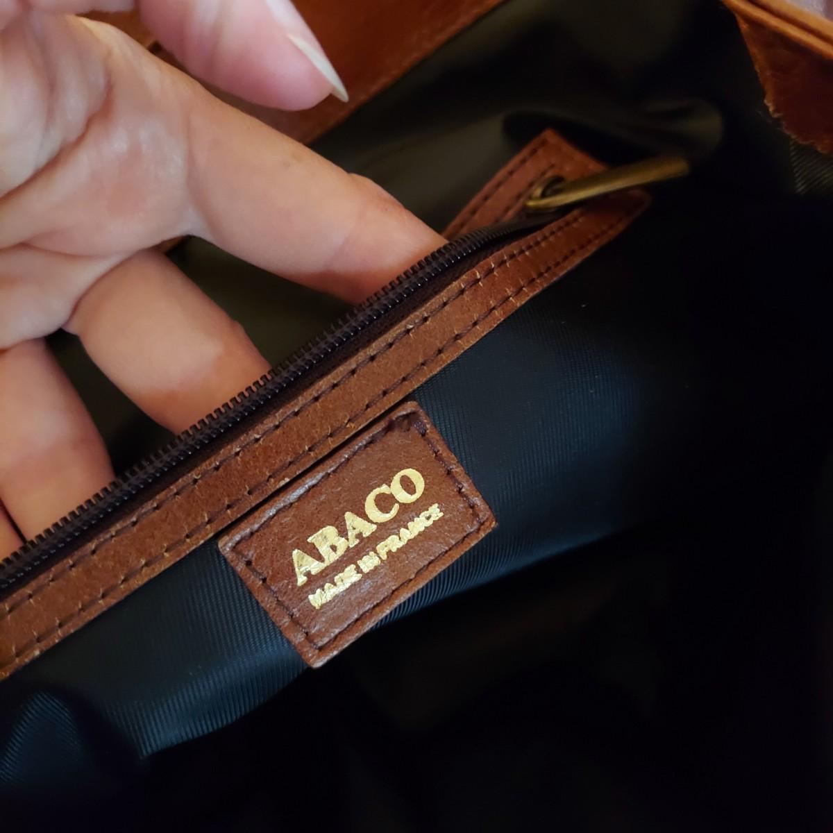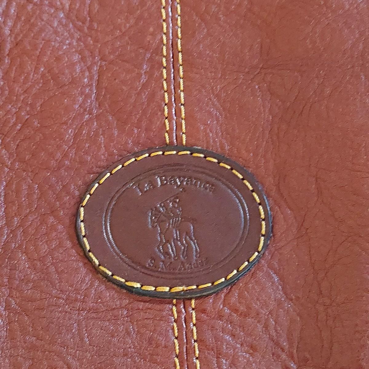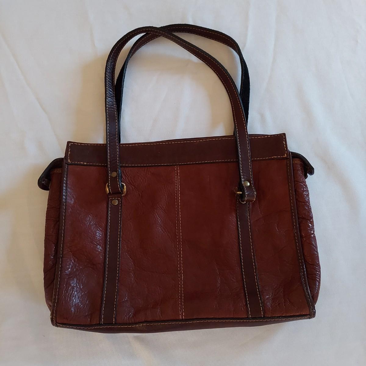 Two brown leather purses. The Abaco Paris bag is approximately 15"x 4" x 11"H. The La Bayanca bag is 14" x 2" x 11"H. Shipping available.