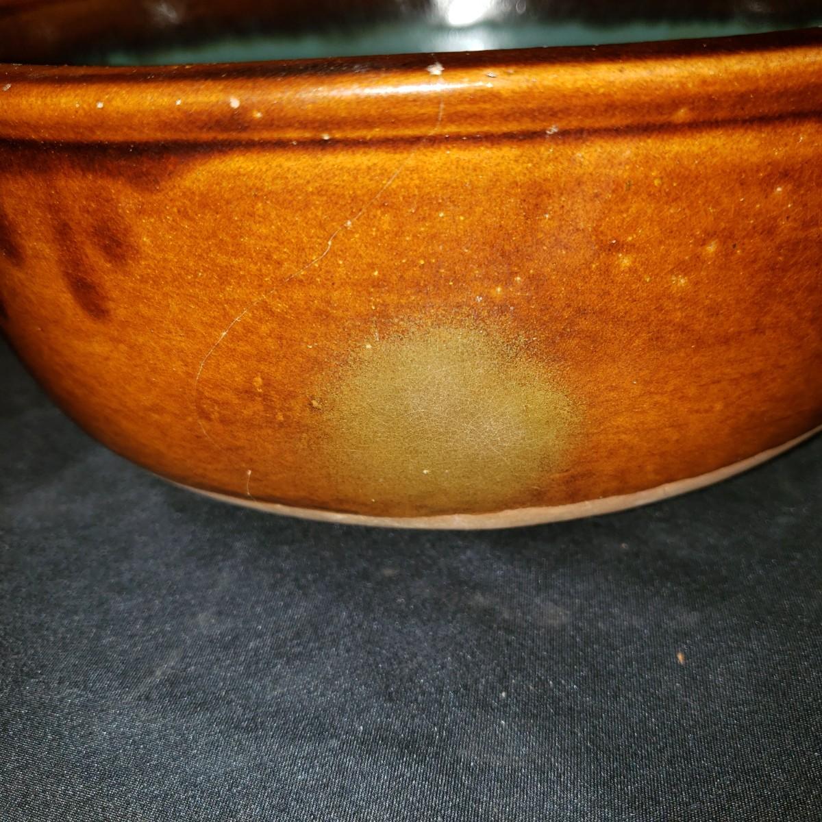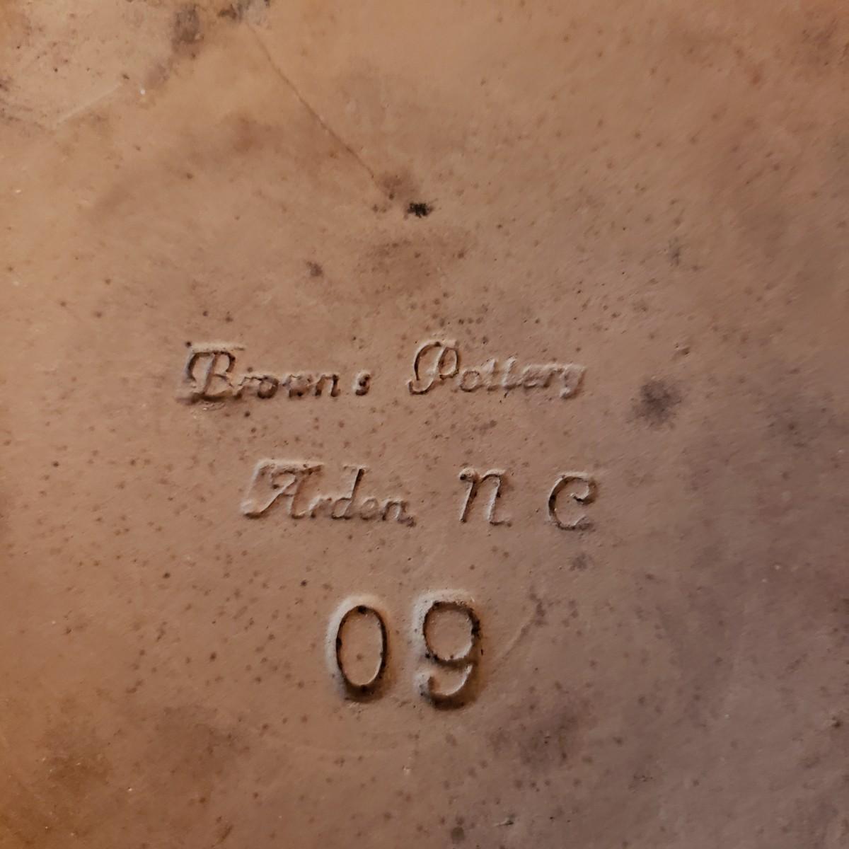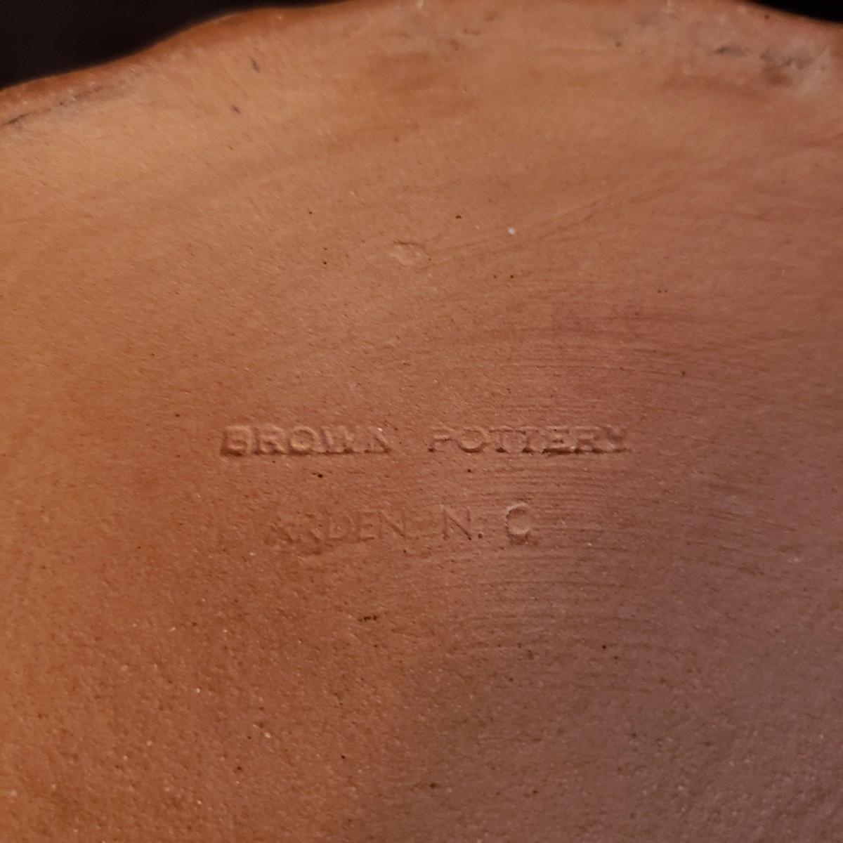 These two pieces were made by Brown's Pottery located in Arden, North Carolina. The brown and green glazed bowl measures approximately 9" x 4"H. The pie pan also features brown and green glaze and measures approximately 11" x 2"H. There is a small chip on the rim of the pie pan, see pictures. The bowl has a discoloration on the side, see picture.